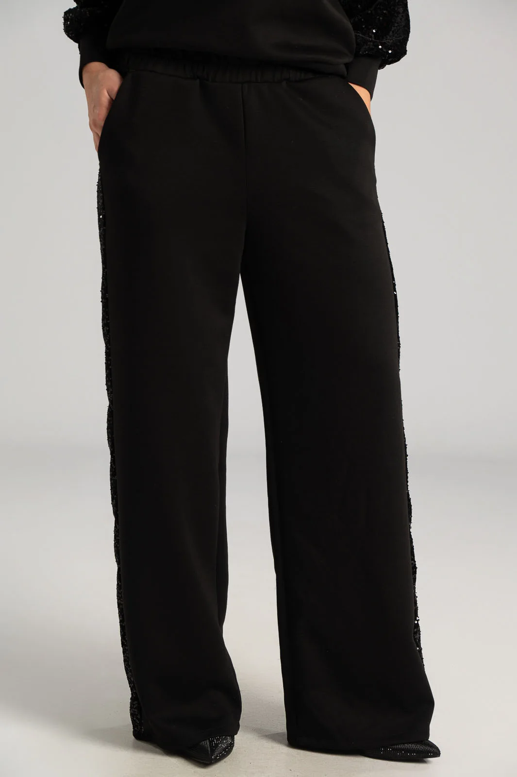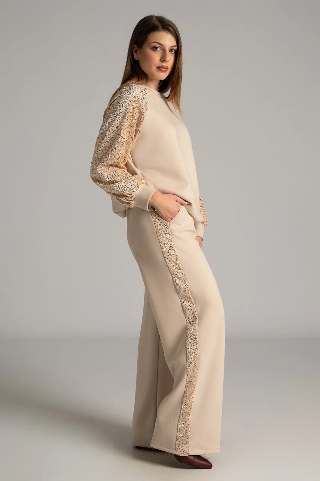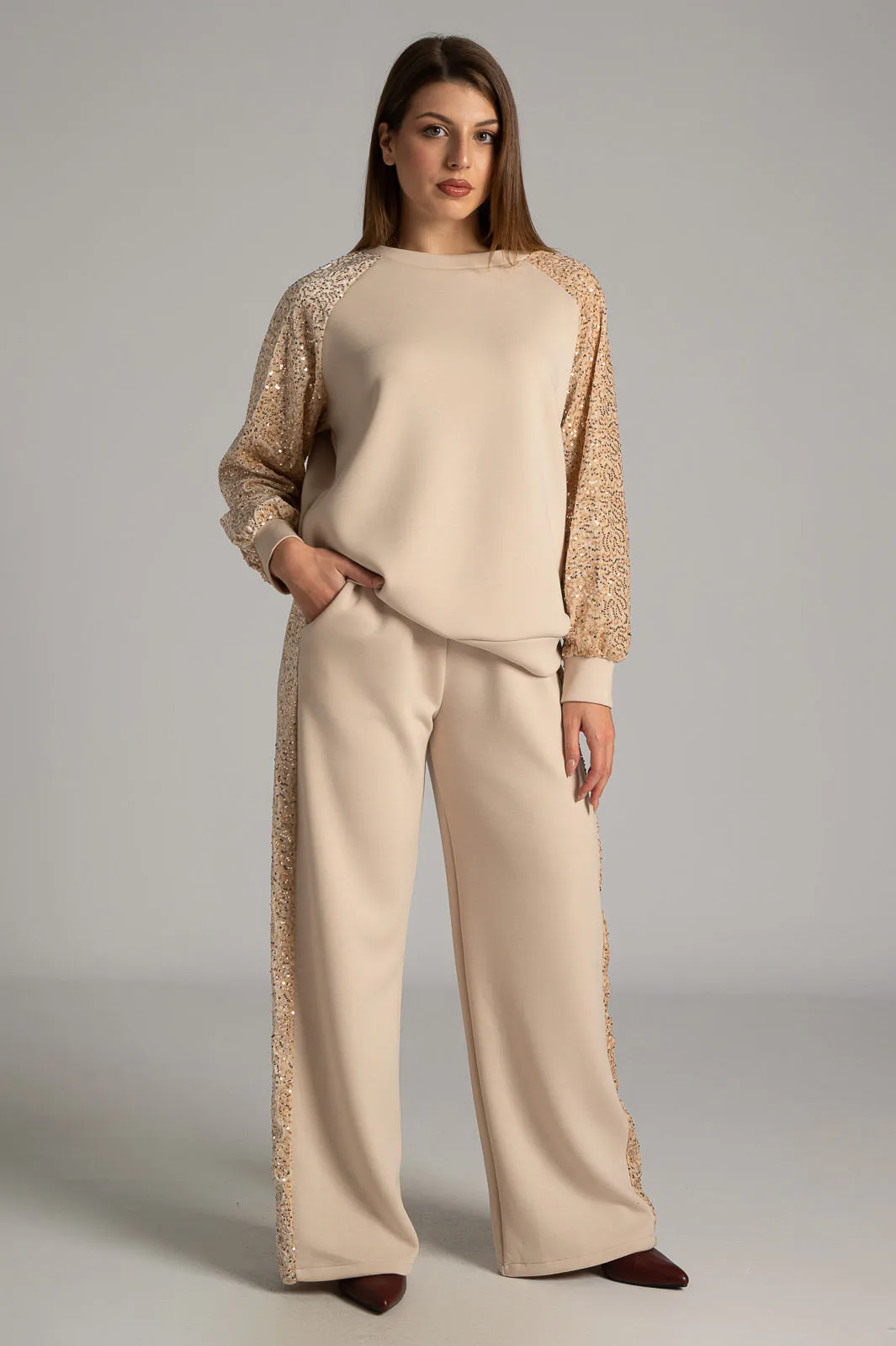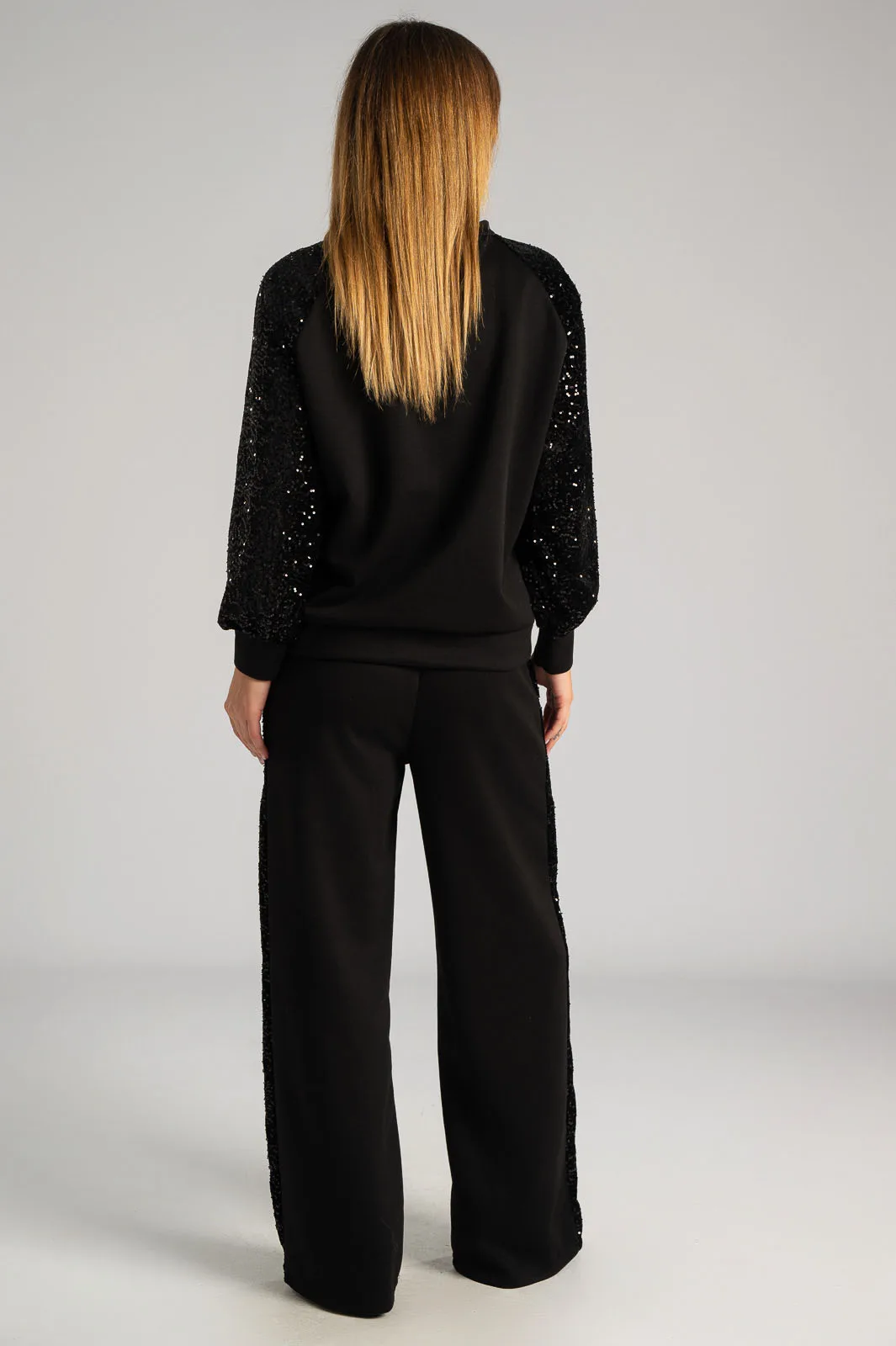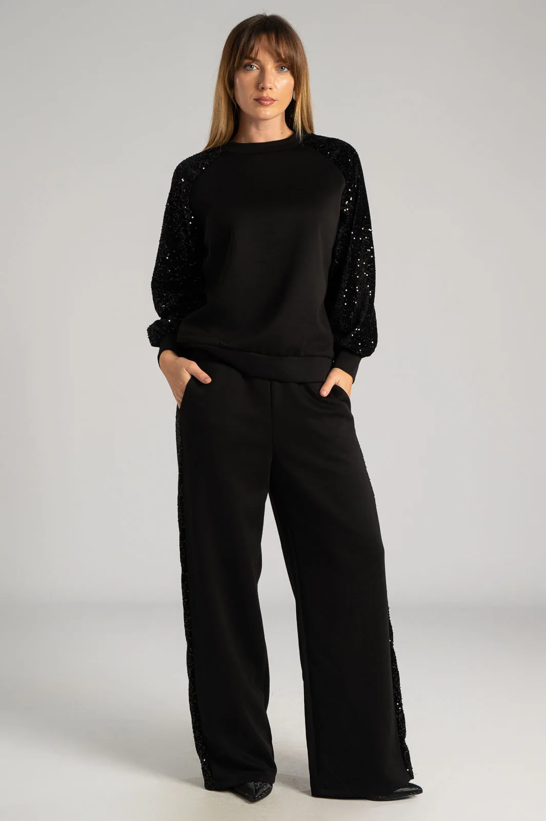 Set consisting of a blouse and sweatpants. Features velvet details with sequin. The blouse has long sleeves and a straight cut. The pants have an elastic waistband and side pockets. They are straight cut. The measurements in the table are representative of each product. 55% polyester, 39% viscose, 6% elastane.