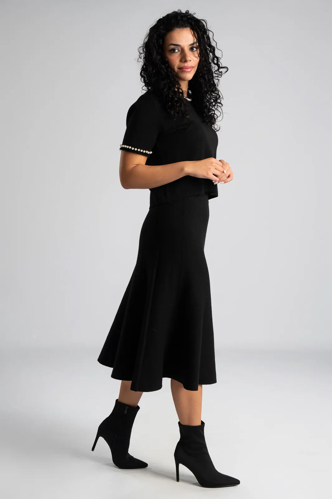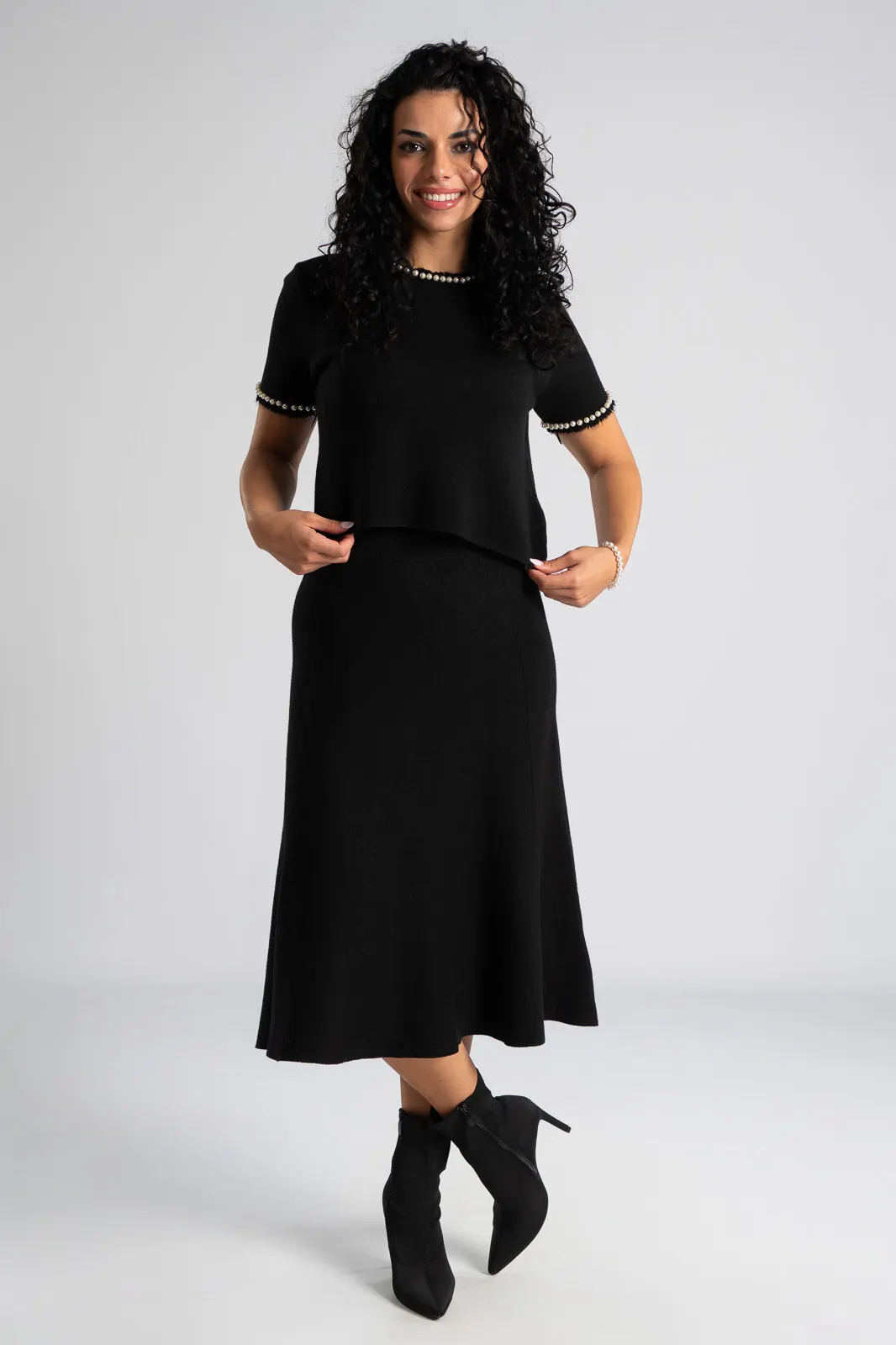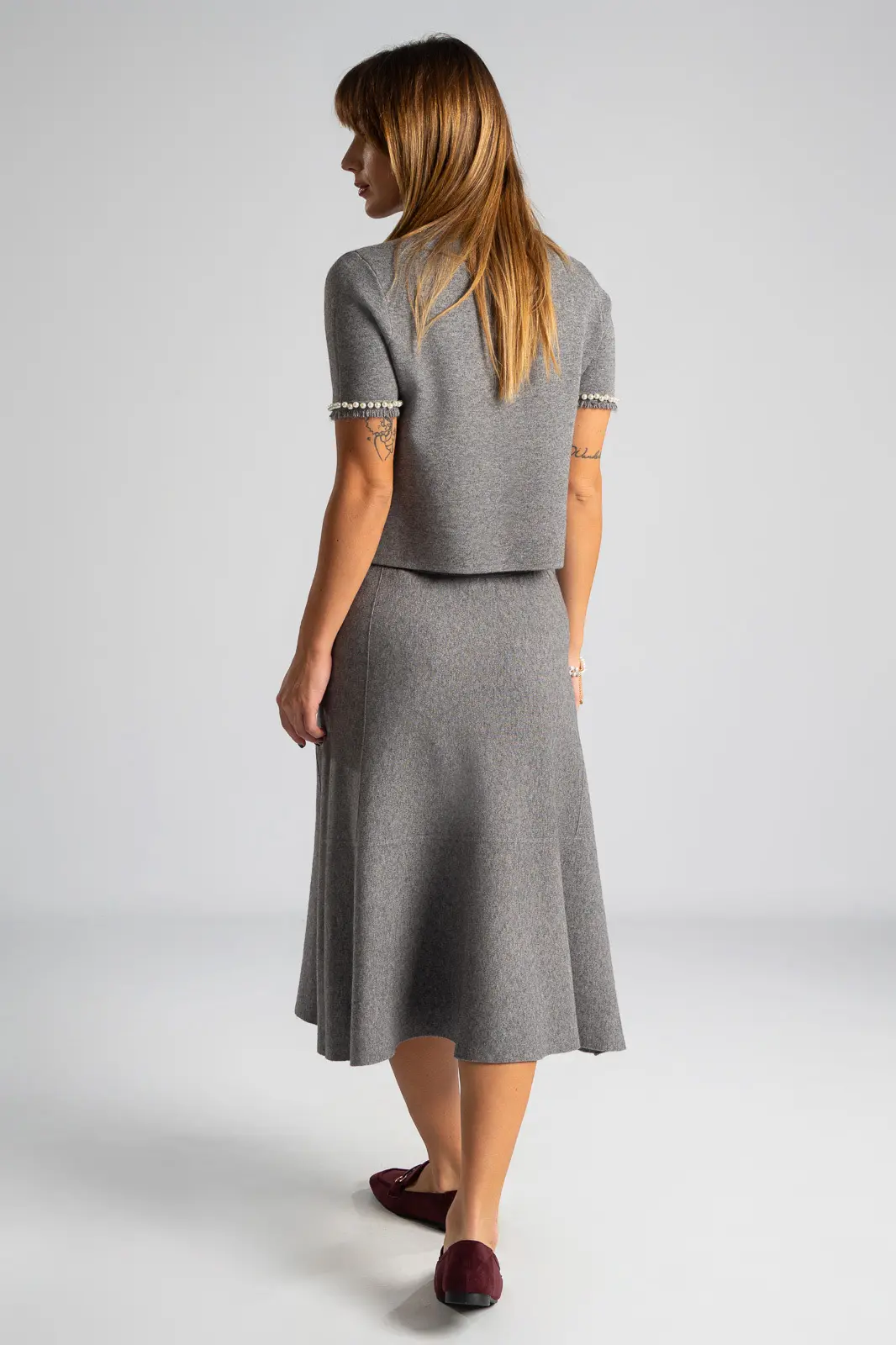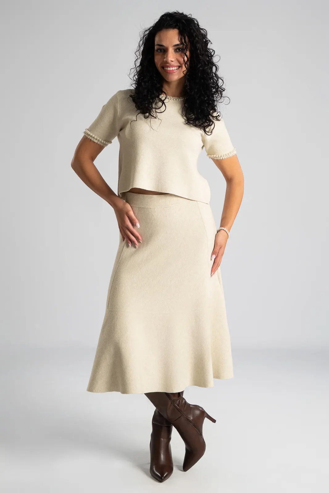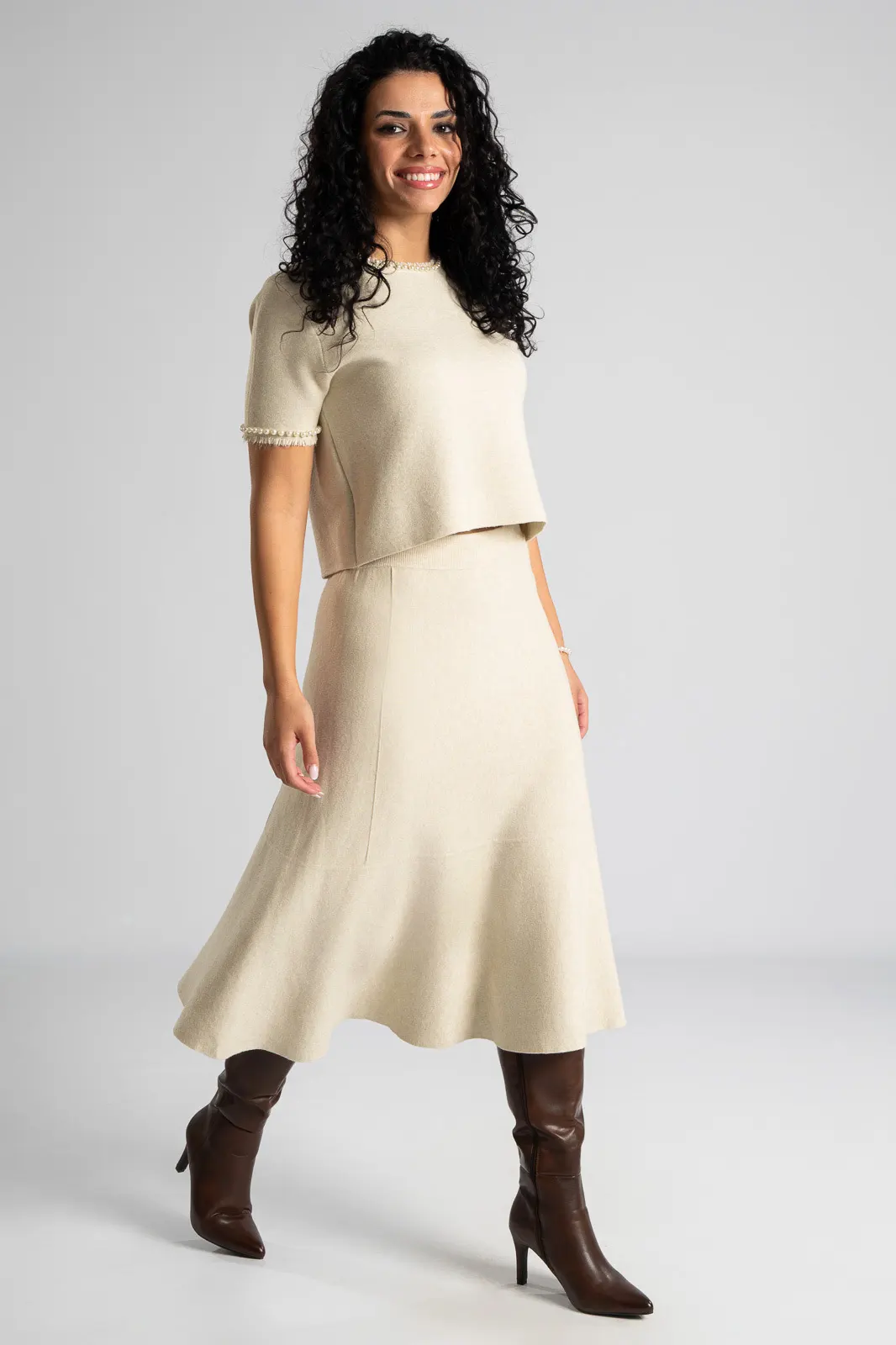 Σετ που αποτελείται απο μπλούζα και φούστα με νημάτινη συμπαγή πλέξη. Η μπλούζα διαθέτει στρογγυλή λαιμόκοψη με διακοσμητικές πέρλες και κοντά κρόσια. Έχει κοντά μανίκια επίσης διακοσμημένα με πέρλες και κοντά κρόσια. Η φούστα διαθέτει λάστιχο στην μέση και είναι σε γραμμή Α. Έχει λεπτές εξωτερικές ραφές. Οι μετρήσεις του πίνακα είναι αντιπροσωπευτικές για κάθε προϊόν. 65% viscose, 33% polyester, 2% elastan.