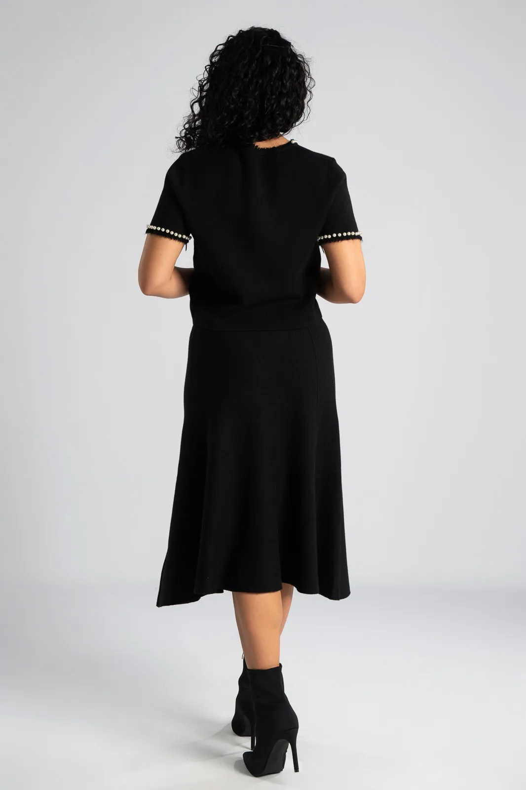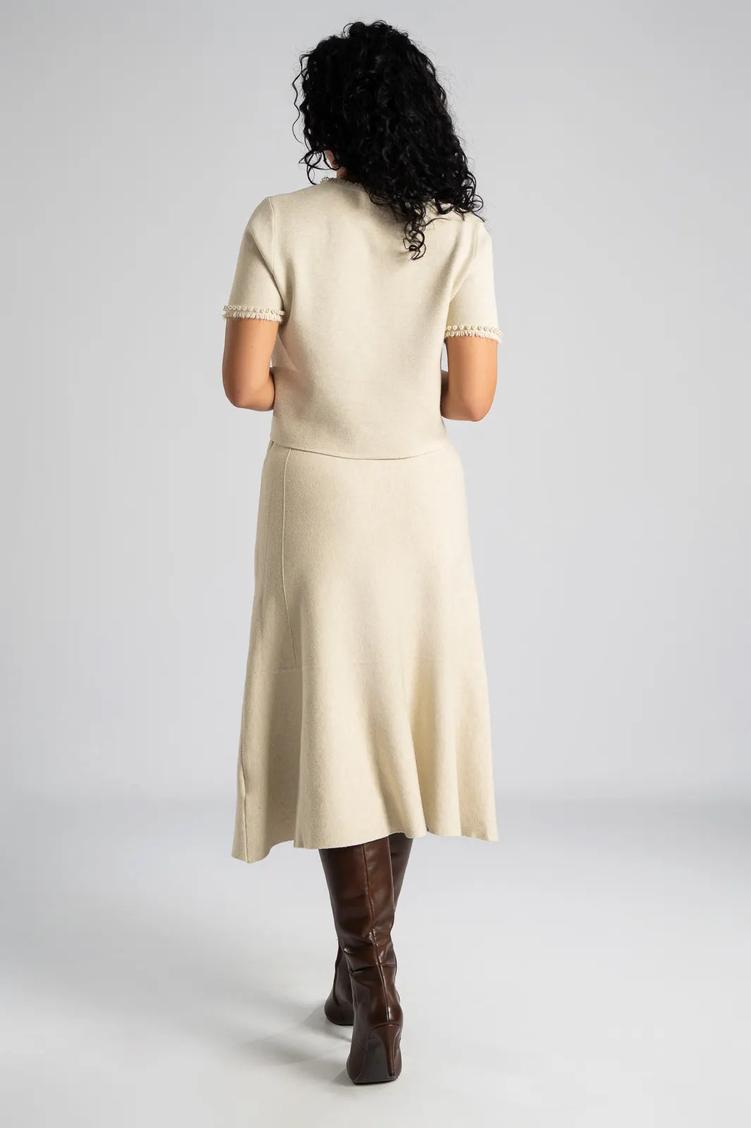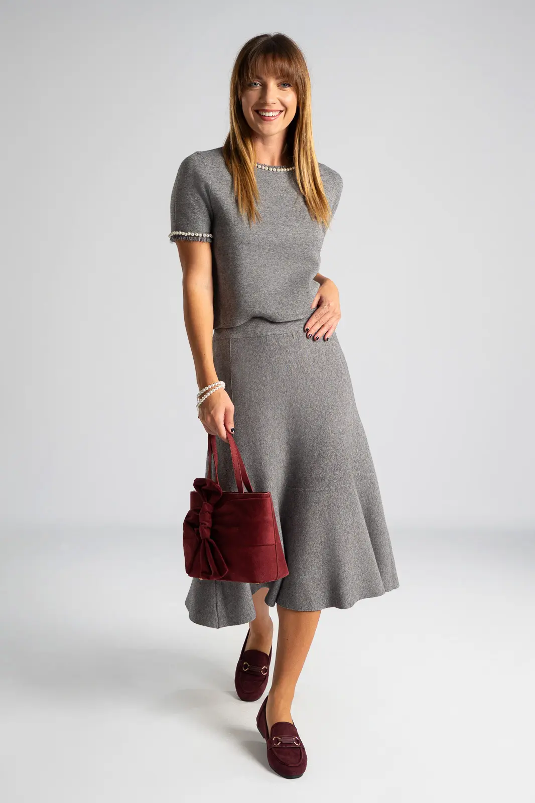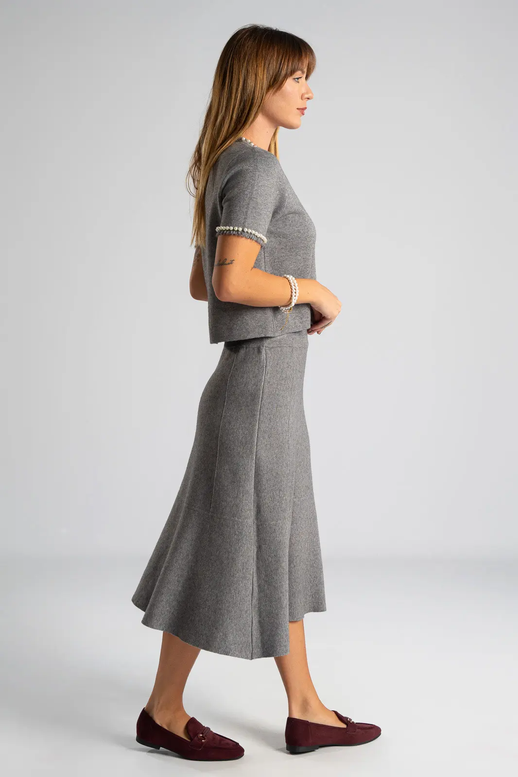 Σετ που αποτελείται απο μπλούζα και φούστα με νημάτινη συμπαγή πλέξη. Η μπλούζα διαθέτει στρογγυλή λαιμόκοψη με διακοσμητικές πέρλες και κοντά κρόσια. Έχει κοντά μανίκια επίσης διακοσμημένα με πέρλες και κοντά κρόσια. Η φούστα διαθέτει λάστιχο στην μέση και είναι σε γραμμή Α. Έχει λεπτές εξωτερικές ραφές. Οι μετρήσεις του πίνακα είναι αντιπροσωπευτικές για κάθε προϊόν. 65% viscose, 33% polyester, 2% elastan.