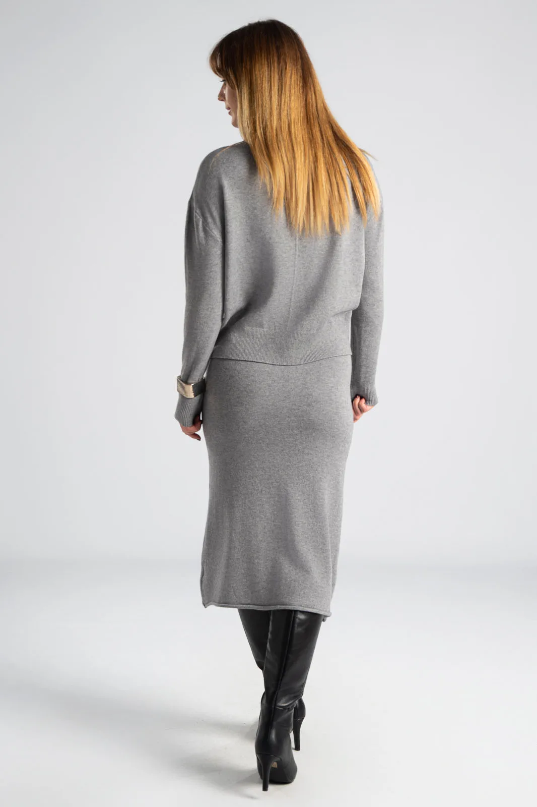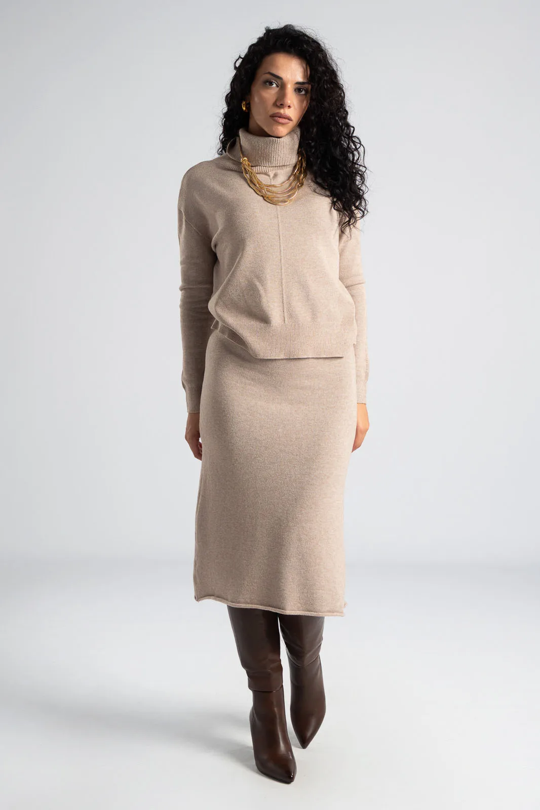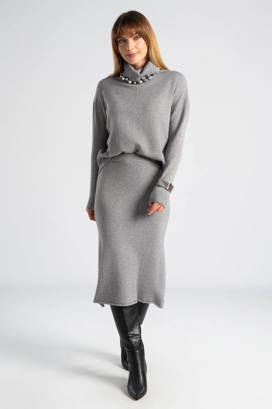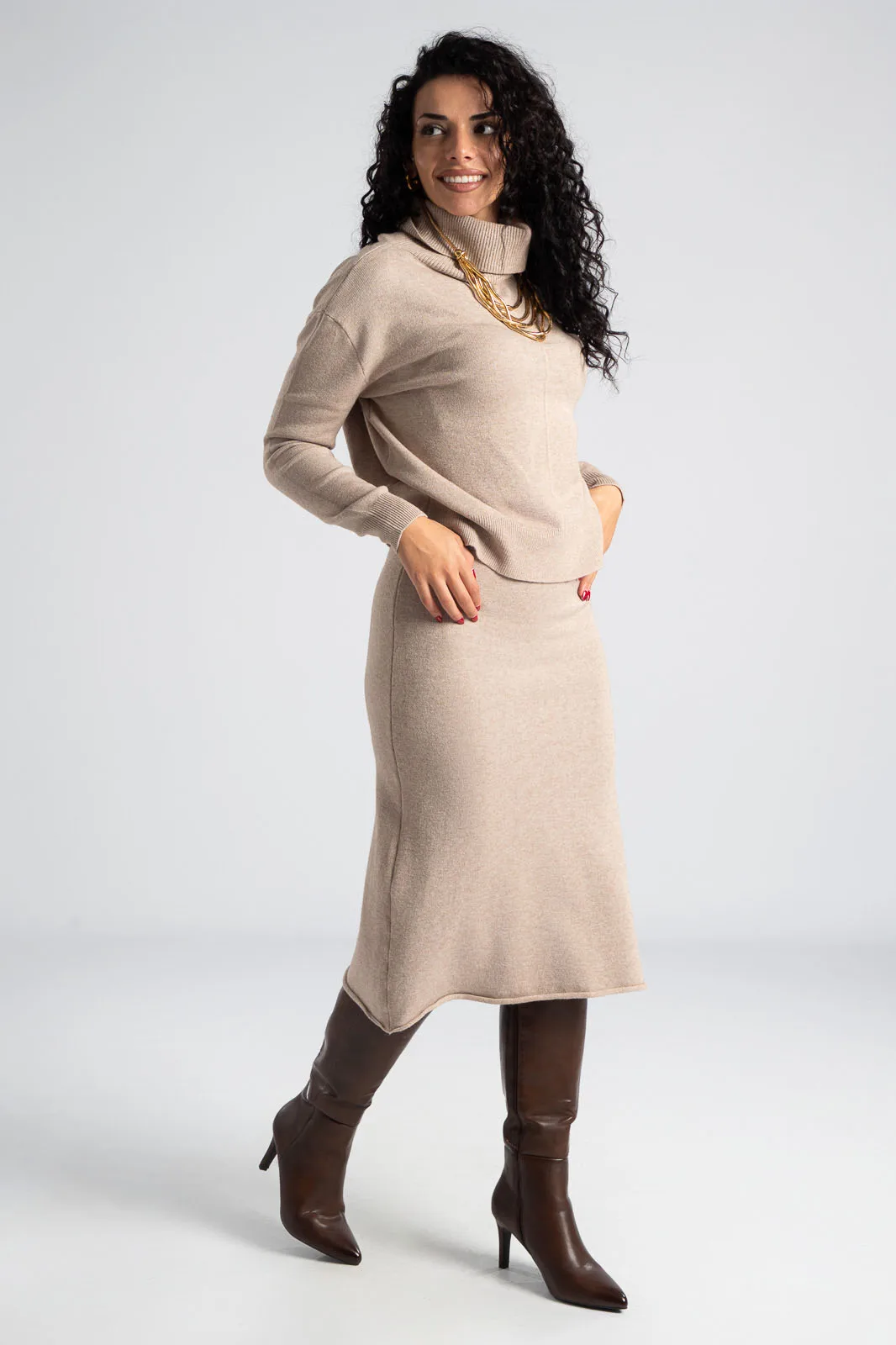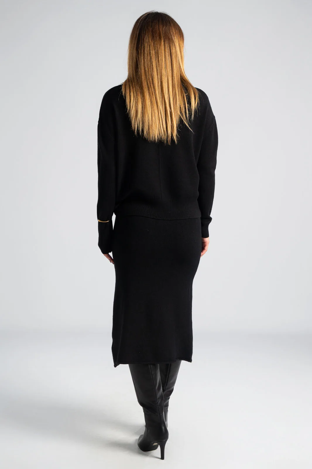 Σετ που αποτελείται από μπλούζα και φούστα με νημάτινη συμπαγή πλέξη. Η μπλούζα διαθέτει ζιβάγκο λαιμόκοψη και έχει μακριά μανίκια. Στο τελείωμα της, στη λαιμόκοψη και στο τελείωμα των μανικιών διαθέτει rib υφή. Η φούστα είναι σε ίσια γραμμή. Διαθέτει λάστιχο στη μέση και έχει rib ύφανση στο τελείωμα και στο λάστιχο. Οι μετρήσεις του πίνακα είναι αντιπροσωπευτικές για κάθε προϊόν. 51% viscose, 28% polyester, 21% polyamide.