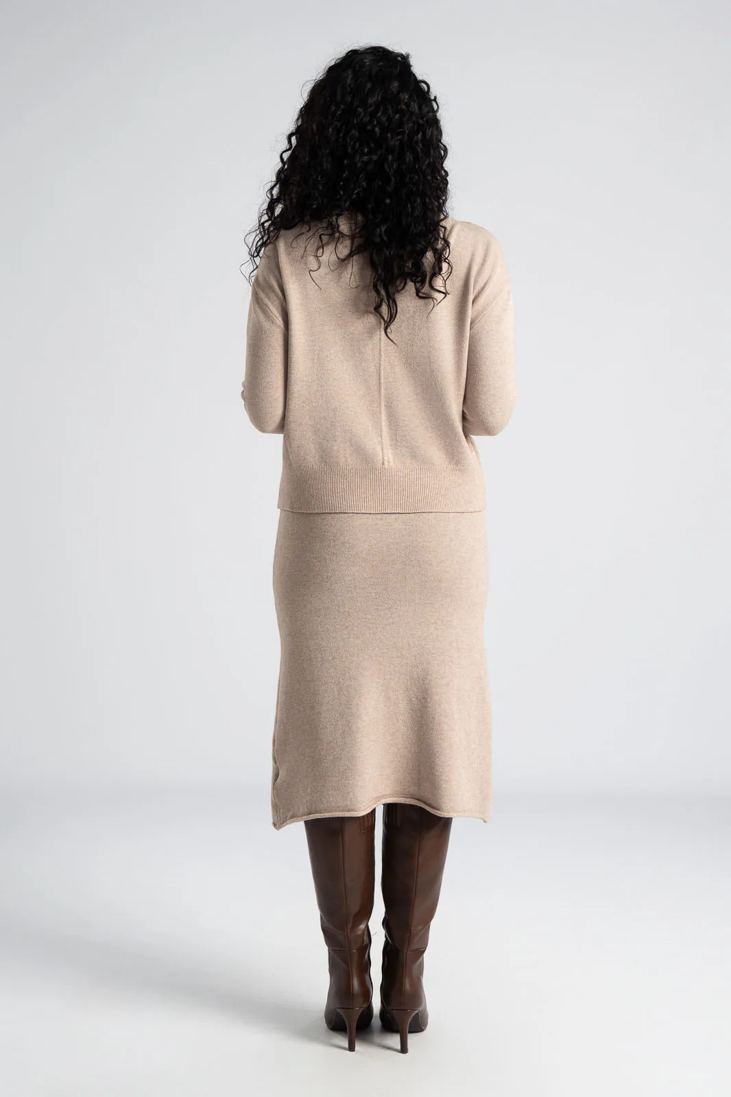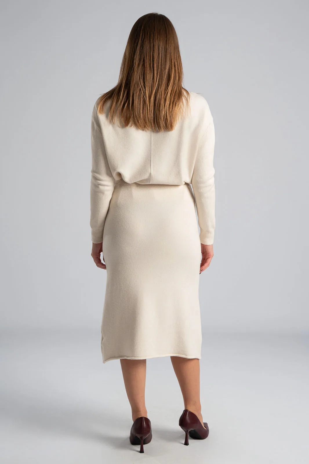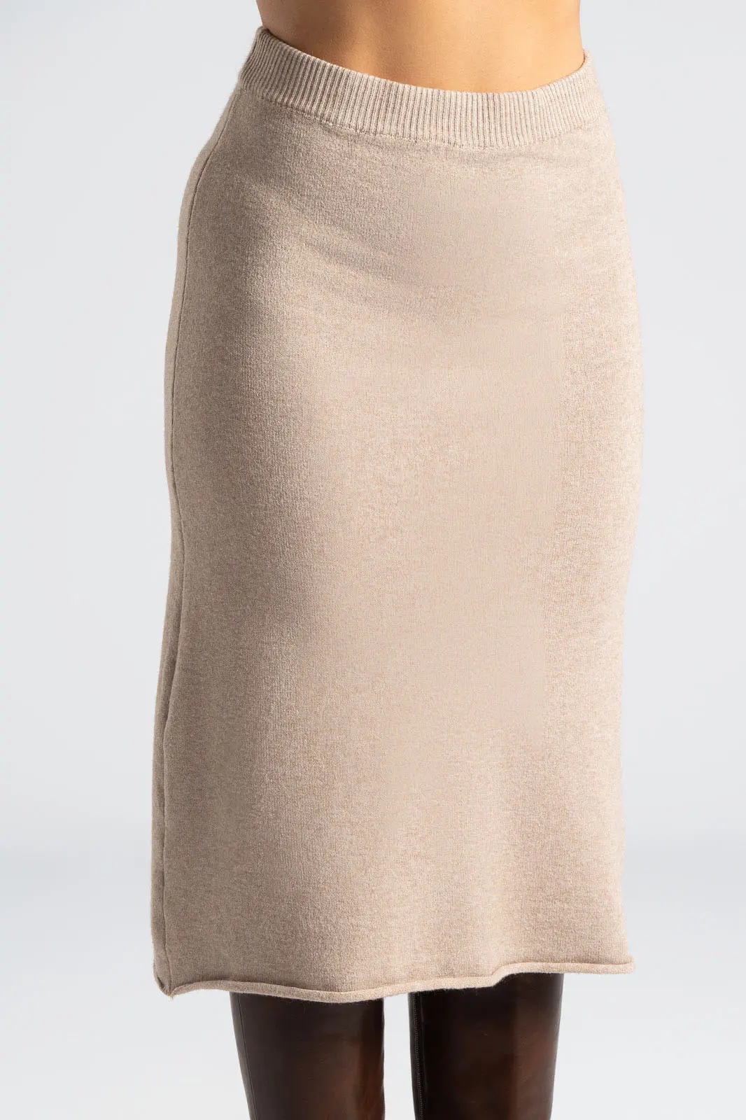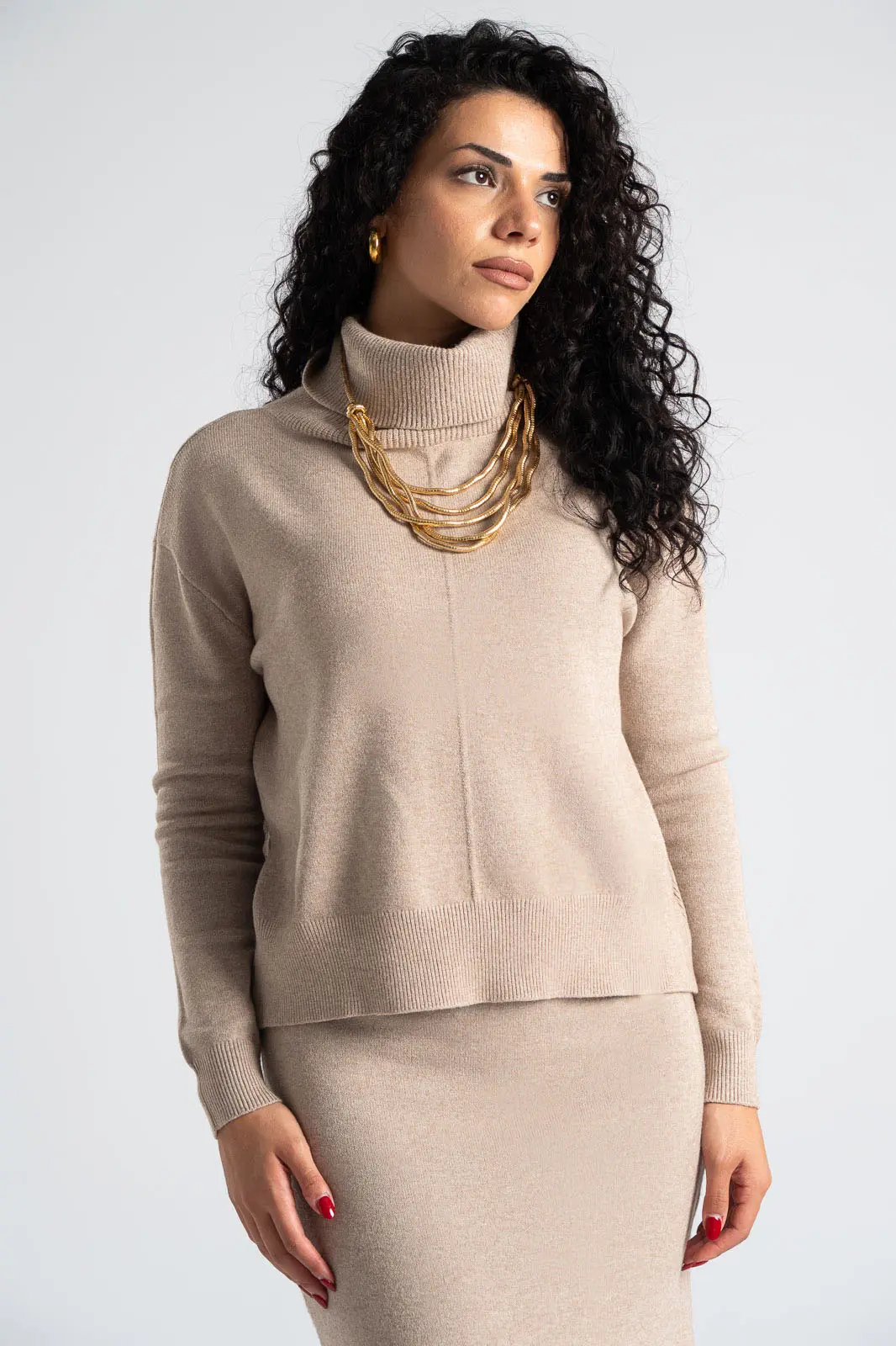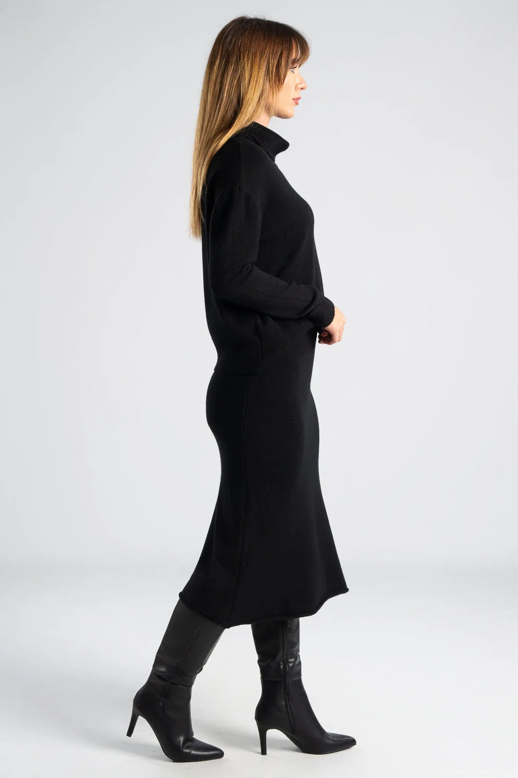 Σετ που αποτελείται από μπλούζα και φούστα με νημάτινη συμπαγή πλέξη. Η μπλούζα διαθέτει ζιβάγκο λαιμόκοψη και έχει μακριά μανίκια. Στο τελείωμα της, στη λαιμόκοψη και στο τελείωμα των μανικιών διαθέτει rib υφή. Η φούστα είναι σε ίσια γραμμή. Διαθέτει λάστιχο στη μέση και έχει rib ύφανση στο τελείωμα και στο λάστιχο. Οι μετρήσεις του πίνακα είναι αντιπροσωπευτικές για κάθε προϊόν. 51% viscose, 28% polyester, 21% polyamide.