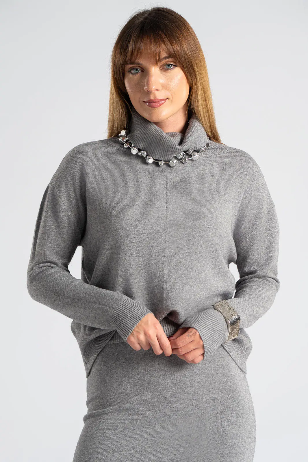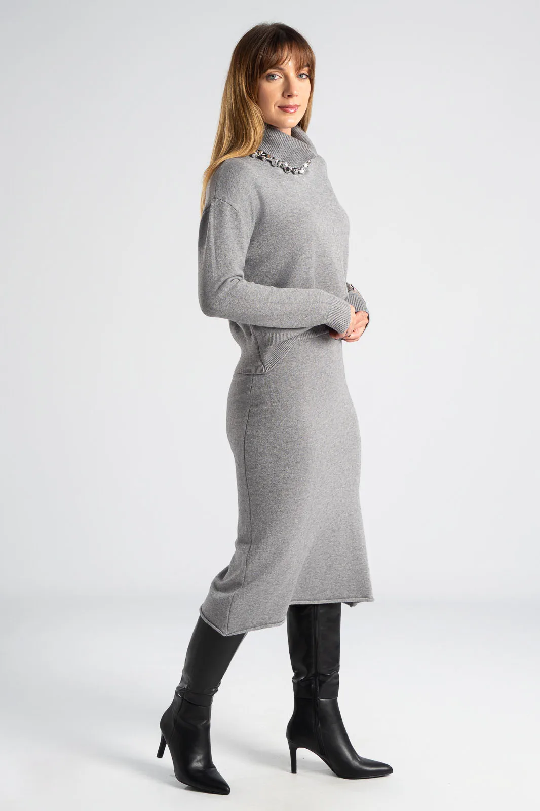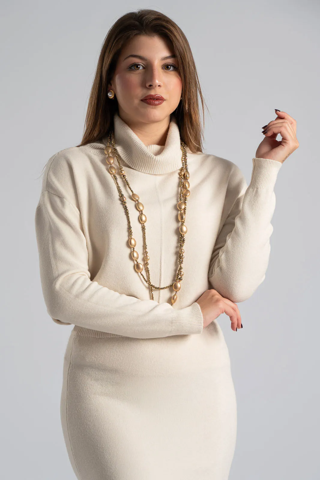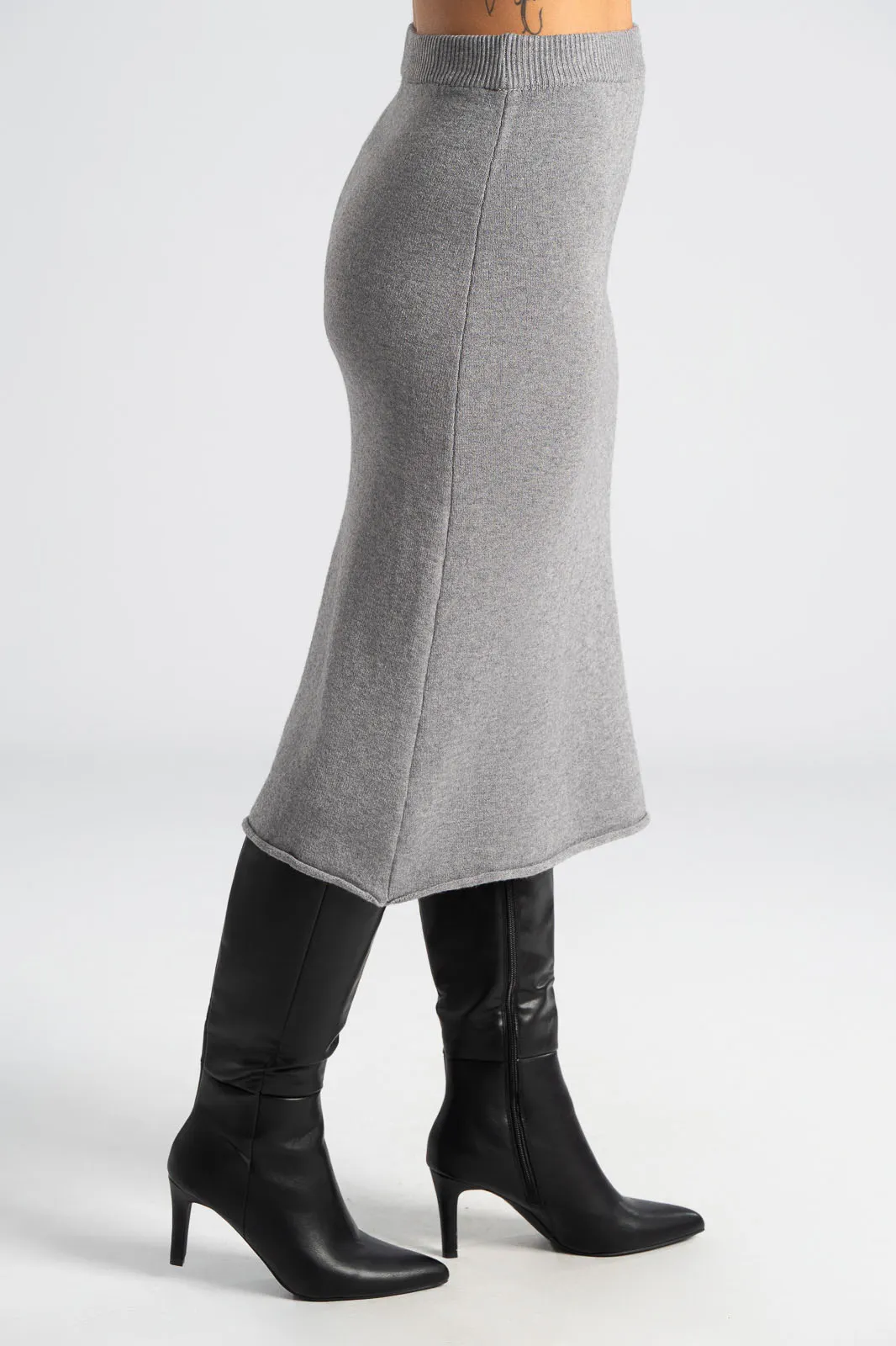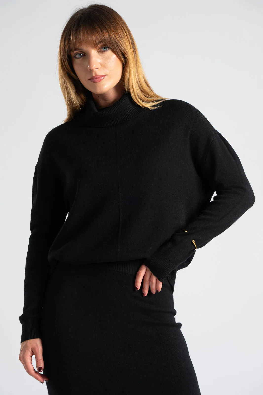 Σετ που αποτελείται από μπλούζα και φούστα με νημάτινη συμπαγή πλέξη. Η μπλούζα διαθέτει ζιβάγκο λαιμόκοψη και έχει μακριά μανίκια. Στο τελείωμα της, στη λαιμόκοψη και στο τελείωμα των μανικιών διαθέτει rib υφή. Η φούστα είναι σε ίσια γραμμή. Διαθέτει λάστιχο στη μέση και έχει rib ύφανση στο τελείωμα και στο λάστιχο. Οι μετρήσεις του πίνακα είναι αντιπροσωπευτικές για κάθε προϊόν. 51% viscose, 28% polyester, 21% polyamide.