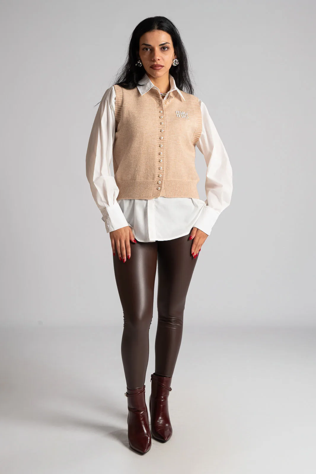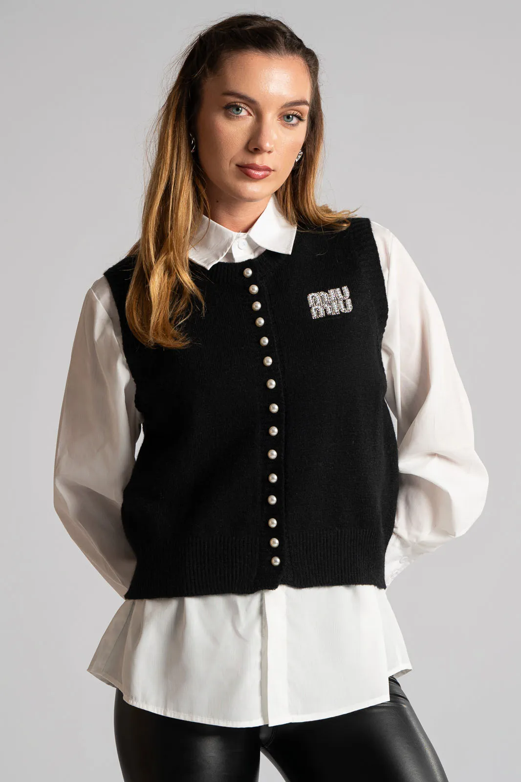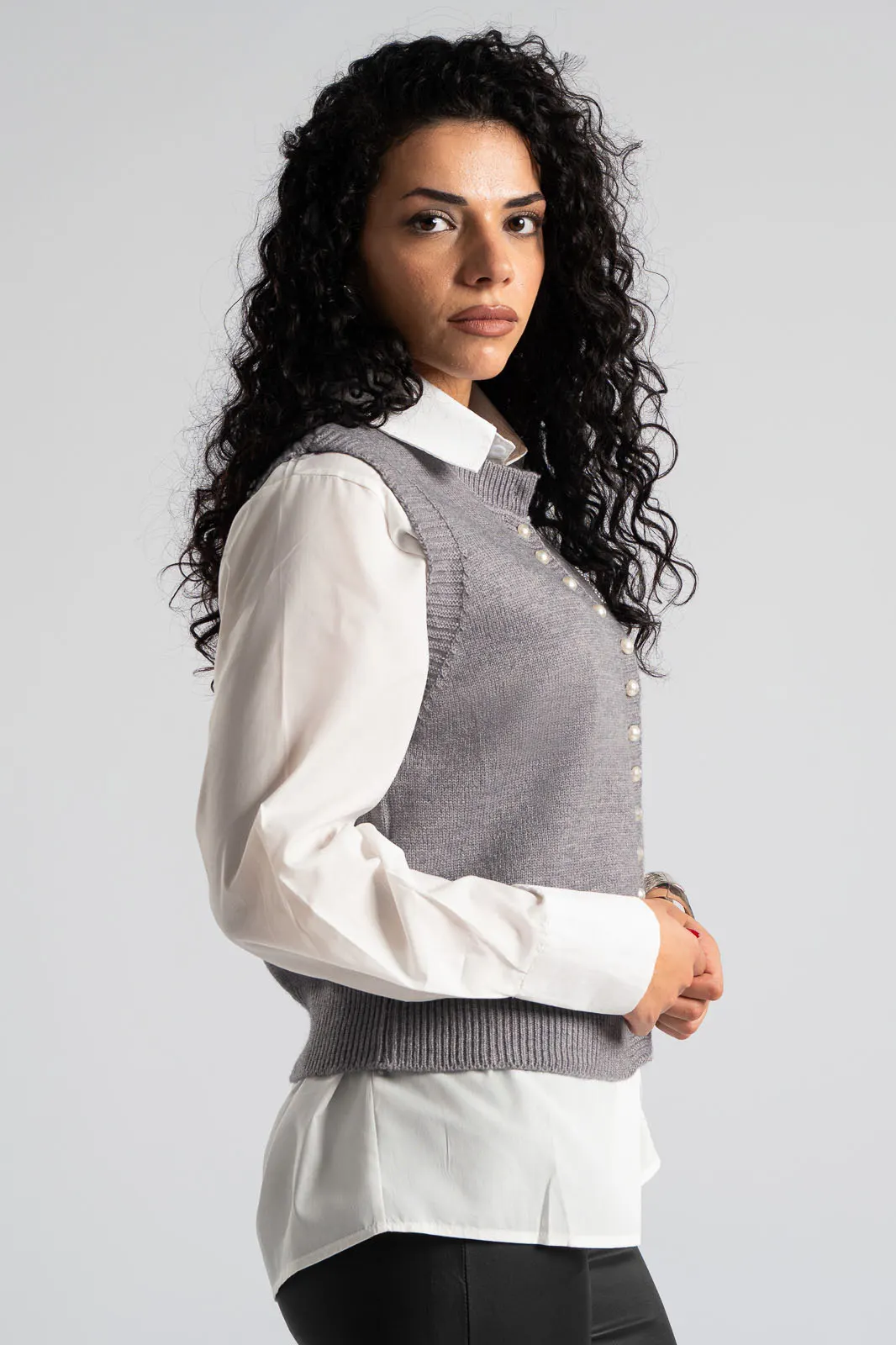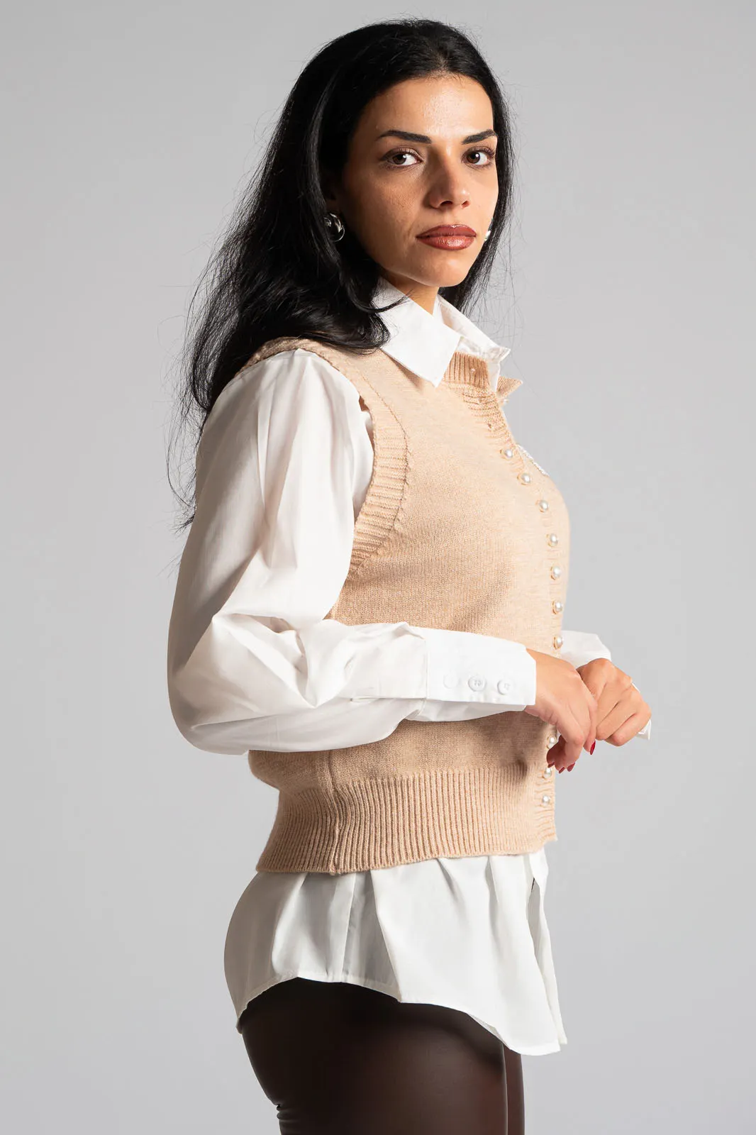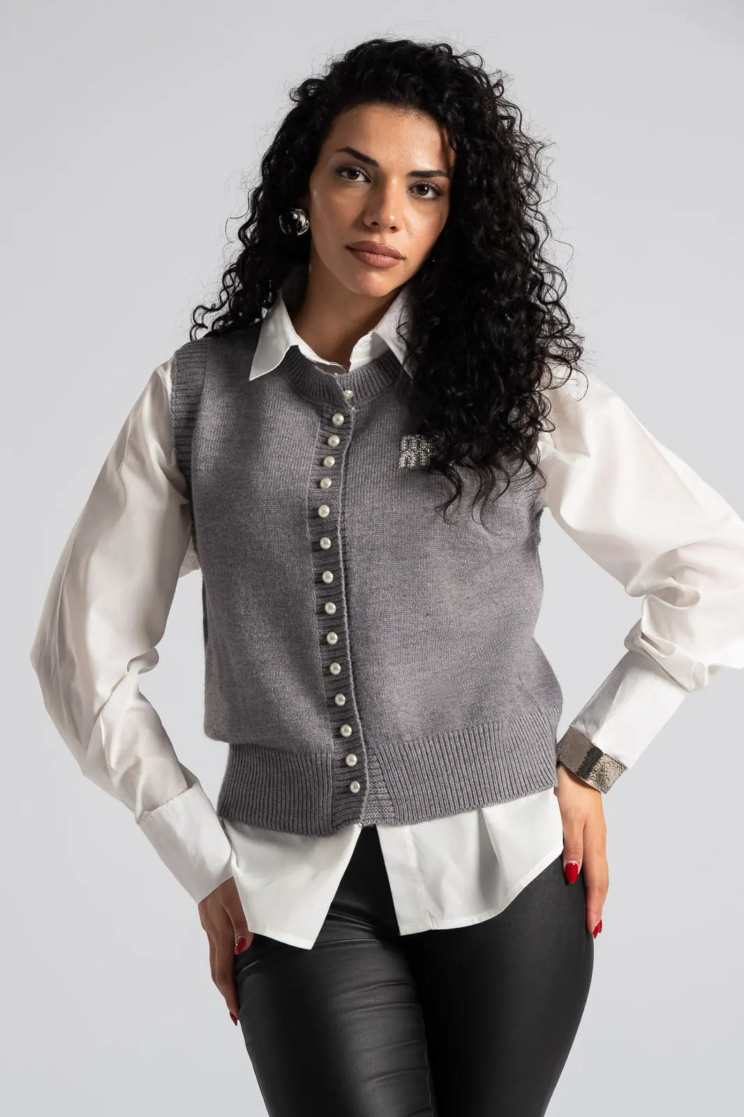 Σετ που αποτελείται από πουκάμισο και γιλέκο. Το πουκάμισο είναι σε ίσια γραμμή. Διαθέτει γιακά και μακριά μανίκια. Το γιλέκο είναι αμάνικο και κλείνει με κουμπιά. Έχει νημάτινη συμπαγή πλέξη και διακοσμητικές πέρλες στο ύψος του στήθους. Οι μετρήσεις του πίνακα είναι αντιπροσωπευτικές για κάθε προϊόν. Γιλέκο: 100% viscose. Πουκάμισο: 65% viscose, 33% polyester, 2% elastan.
