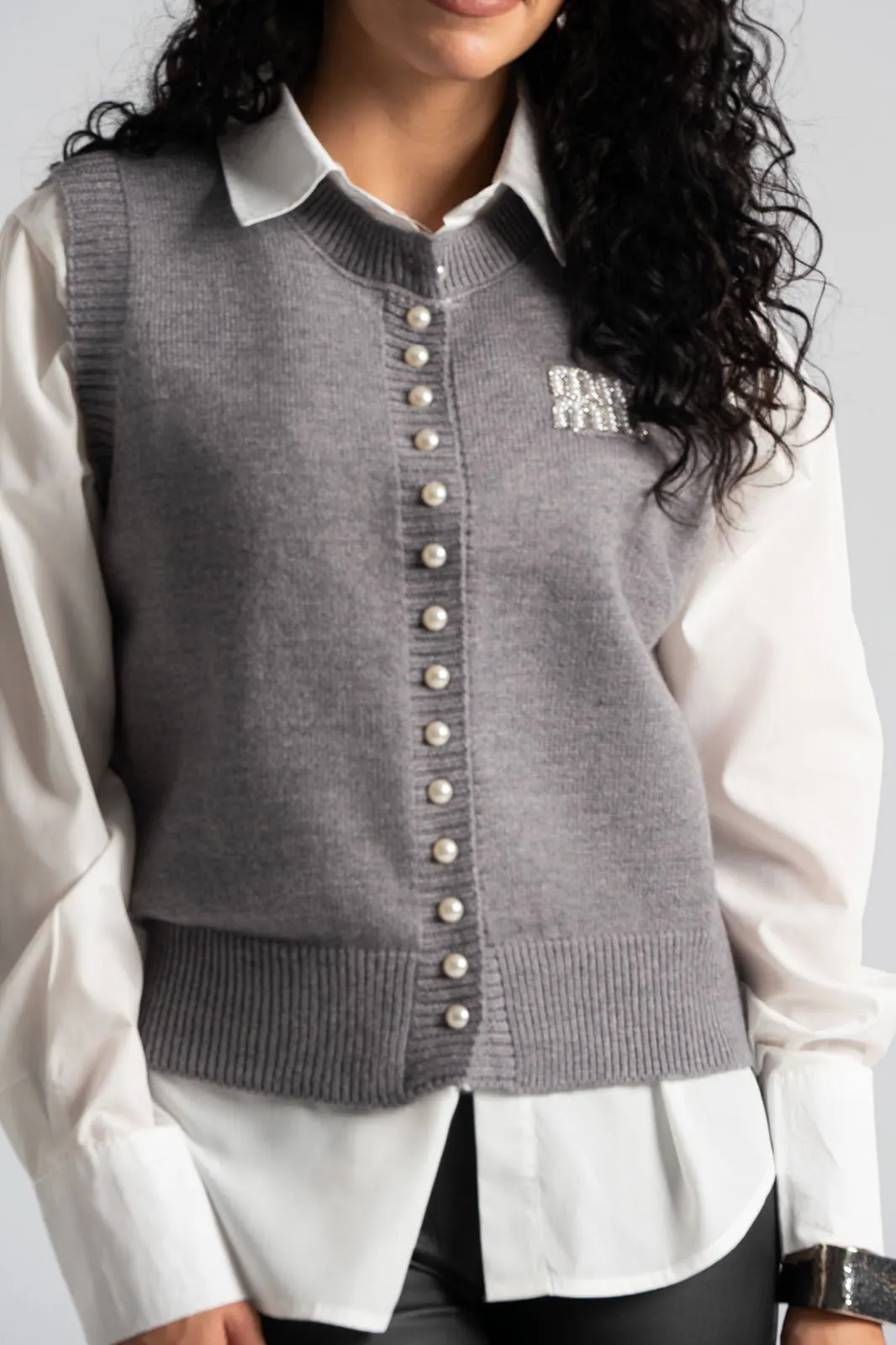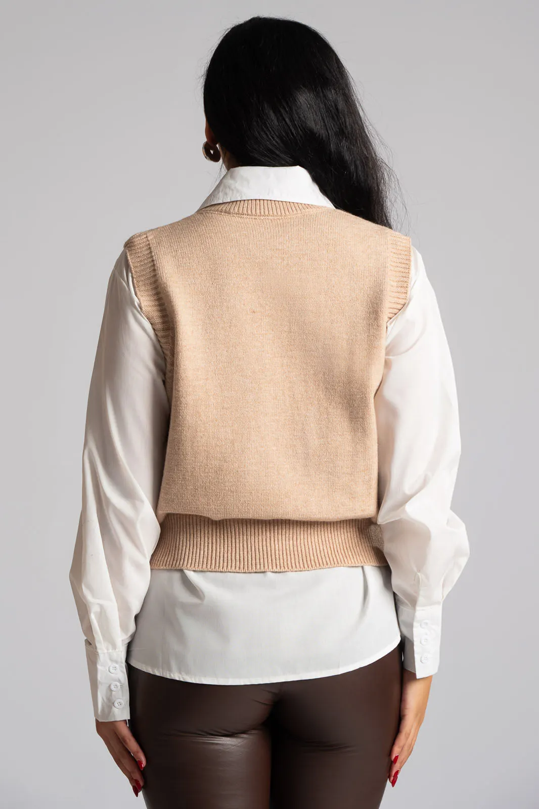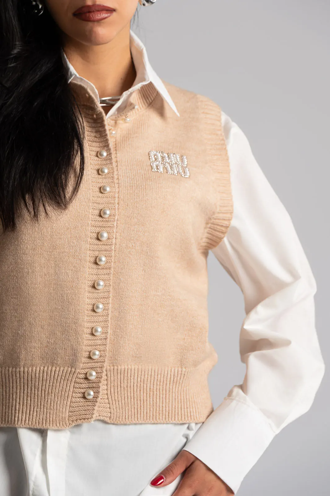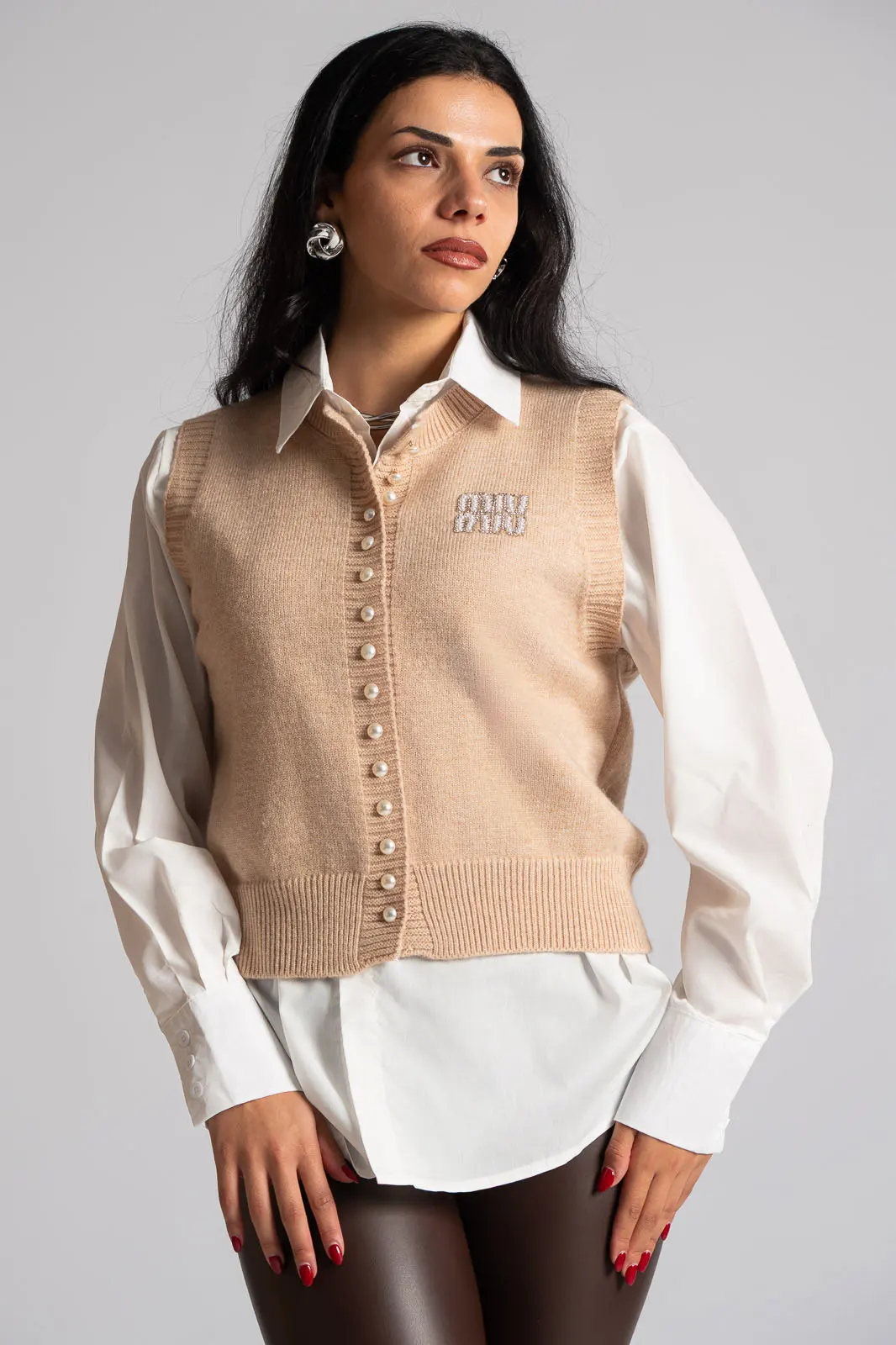 Σετ που αποτελείται από πουκάμισο και γιλέκο. Το πουκάμισο είναι σε ίσια γραμμή. Διαθέτει γιακά και μακριά μανίκια. Το γιλέκο είναι αμάνικο και κλείνει με κουμπιά. Έχει νημάτινη συμπαγή πλέξη και διακοσμητικές πέρλες στο ύψος του στήθους. Οι μετρήσεις του πίνακα είναι αντιπροσωπευτικές για κάθε προϊόν. Γιλέκο: 100% viscose. Πουκάμισο: 65% viscose, 33% polyester, 2% elastan.