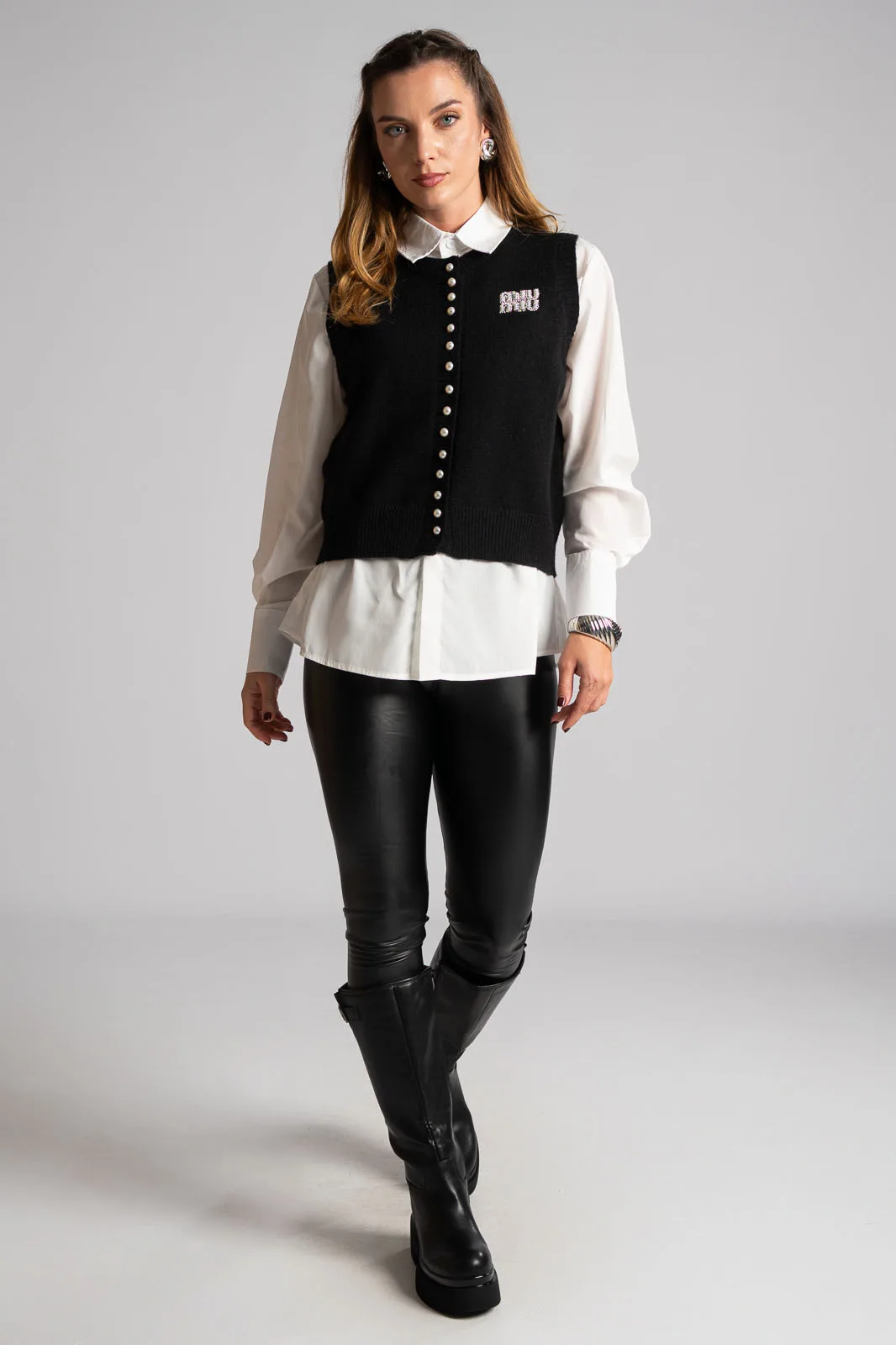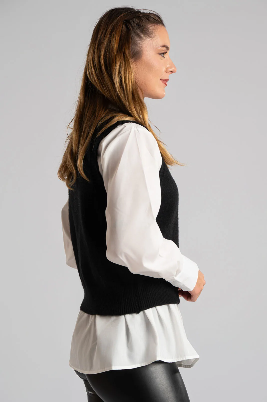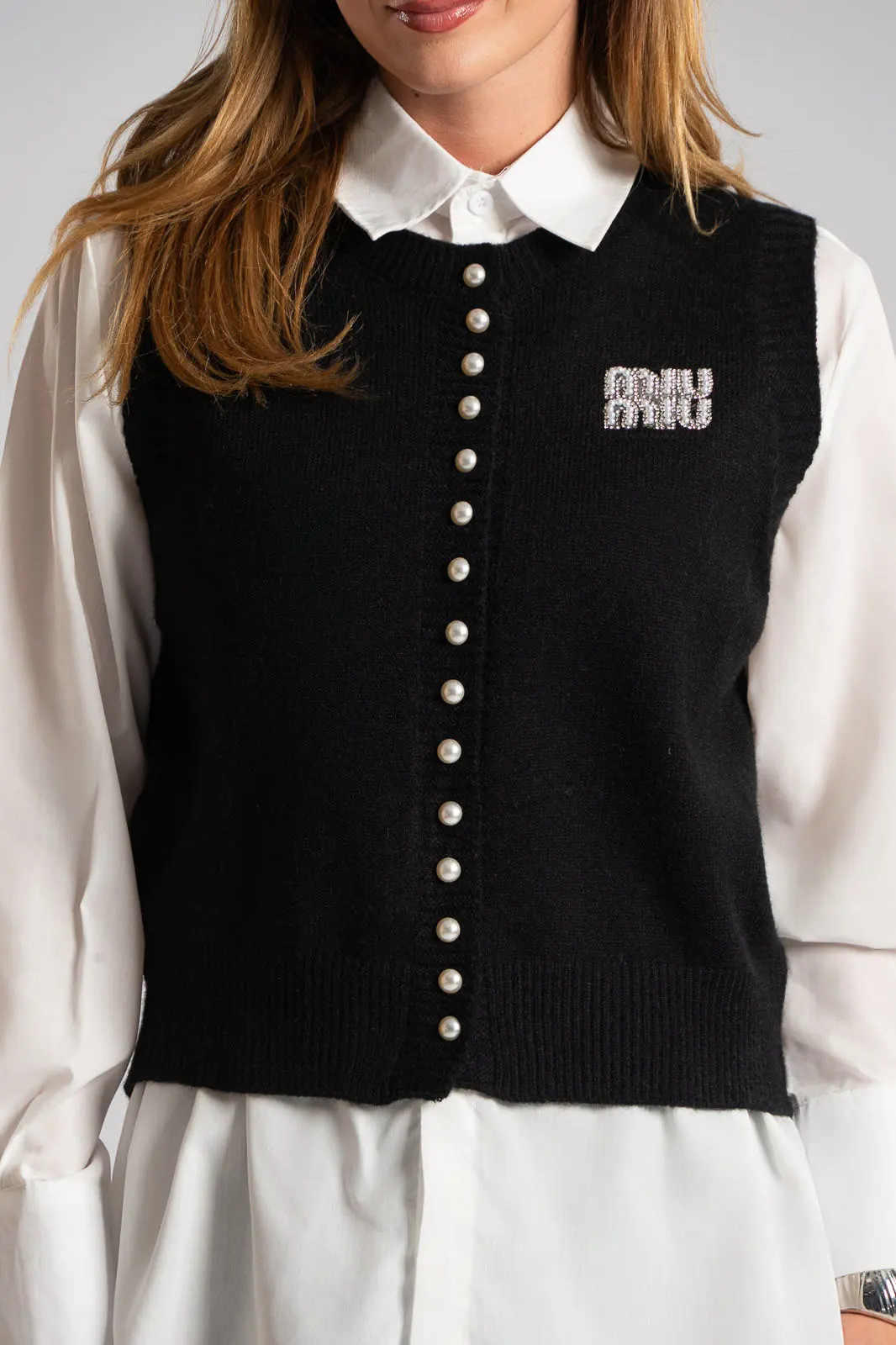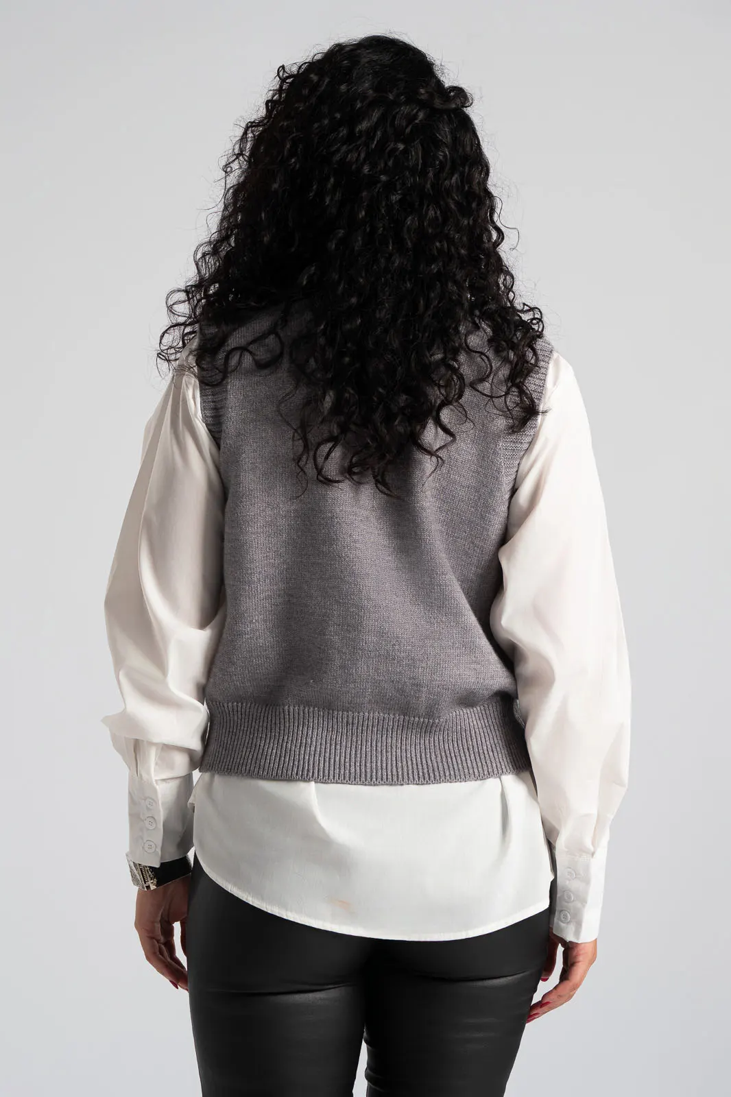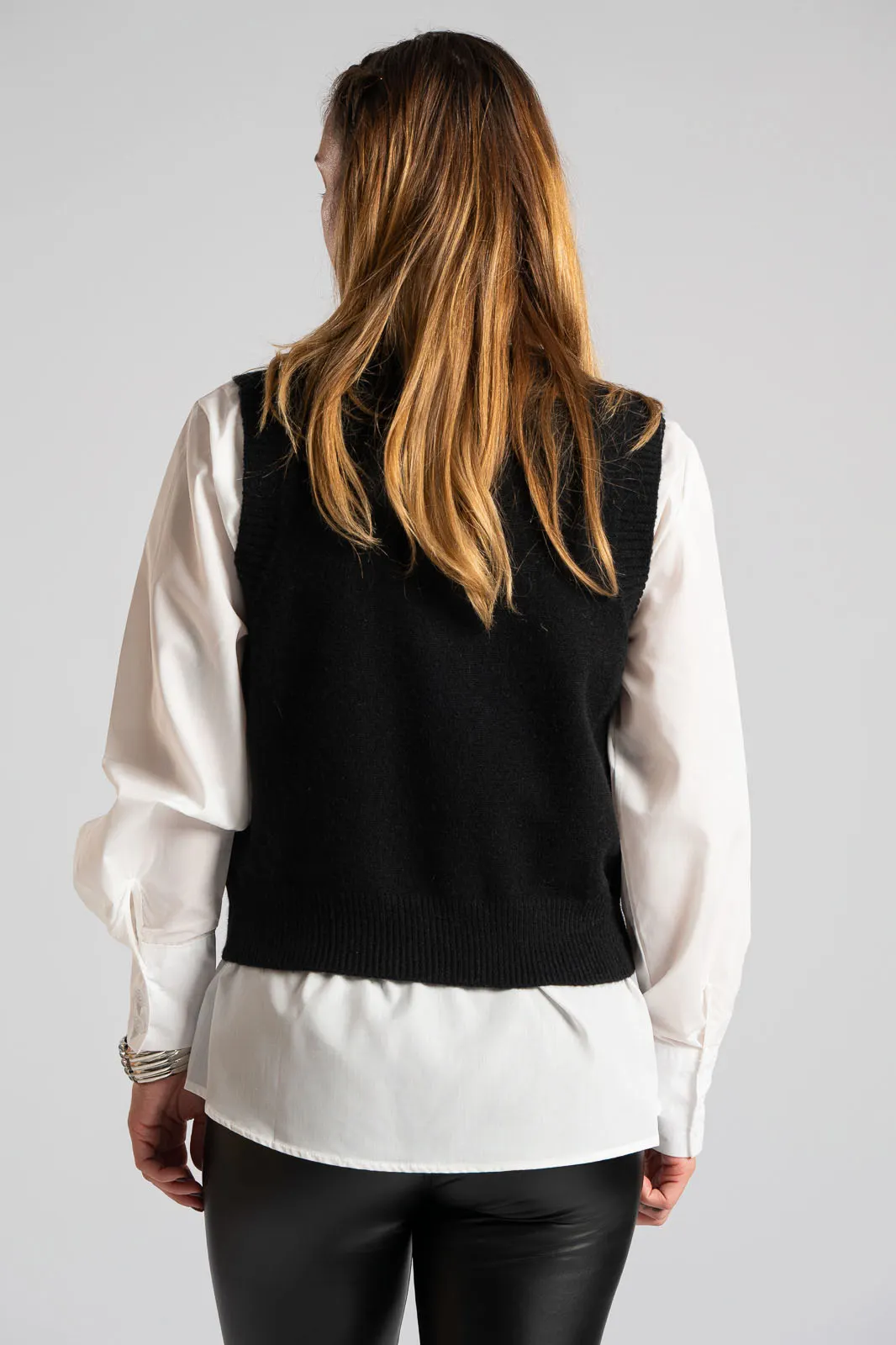Σετ που αποτελείται από πουκάμισο και γιλέκο. Το πουκάμισο είναι σε ίσια γραμμή. Διαθέτει γιακά και μακριά μανίκια. Το γιλέκο είναι αμάνικο και κλείνει με κουμπιά. Έχει νημάτινη συμπαγή πλέξη και διακοσμητικές πέρλες στο ύψος του στήθους. Οι μετρήσεις του πίνακα είναι αντιπροσωπευτικές για κάθε προϊόν. Γιλέκο: 100% viscose. Πουκάμισο: 65% viscose, 33% polyester, 2% elastan.