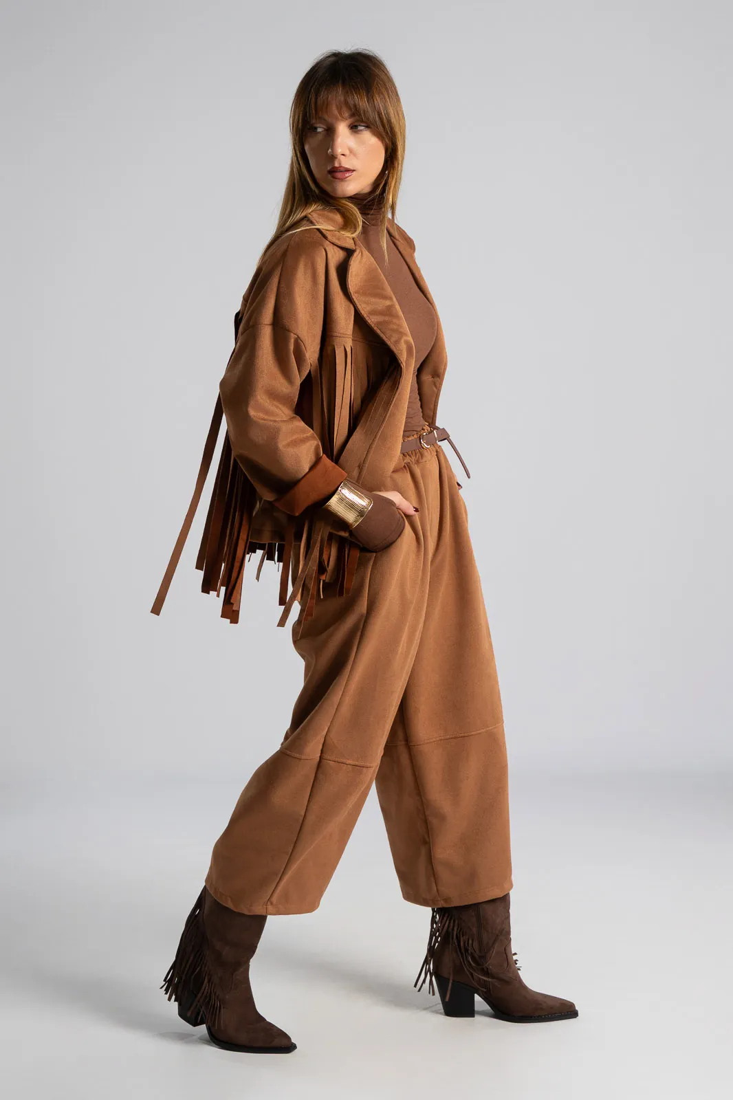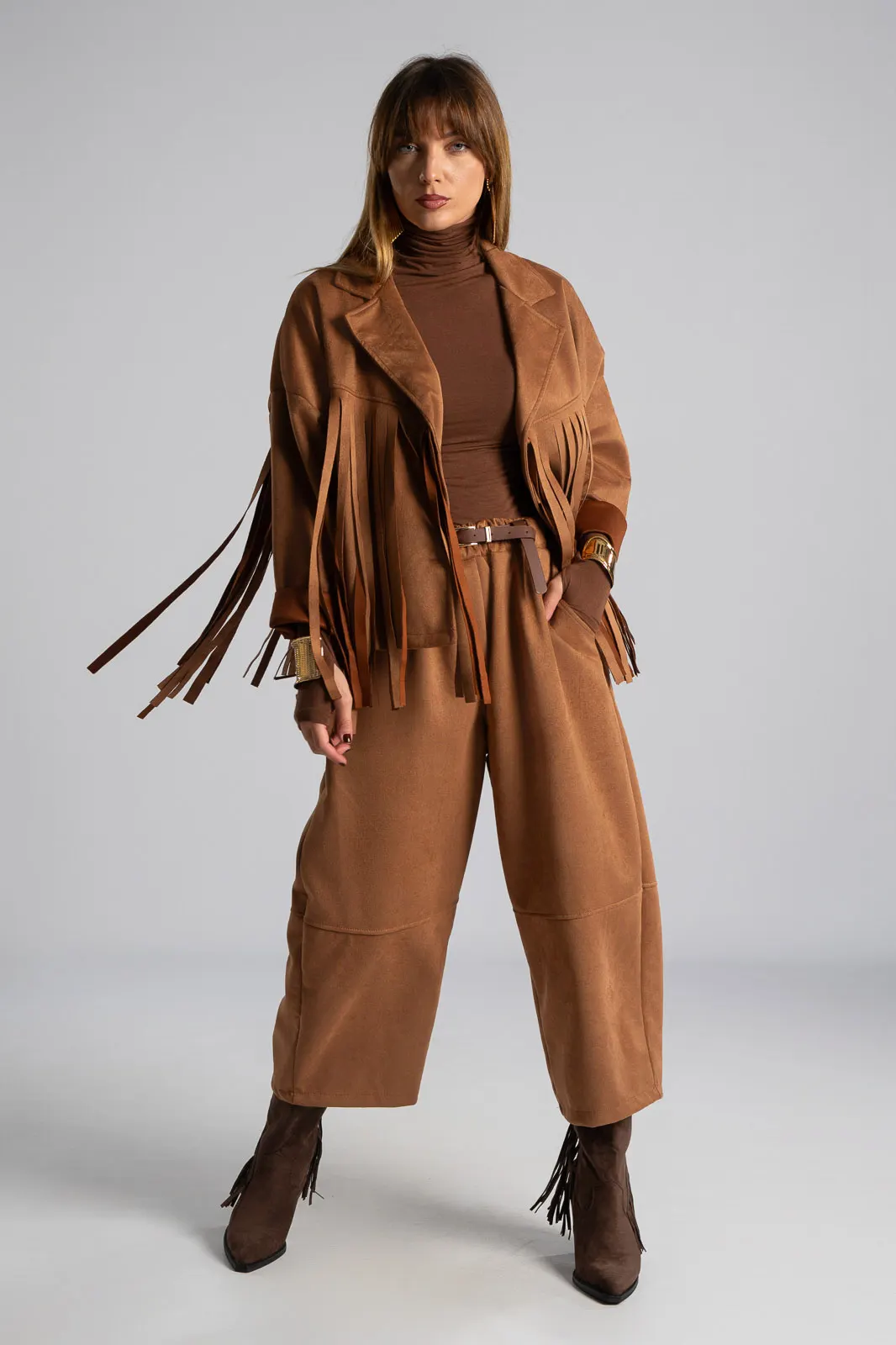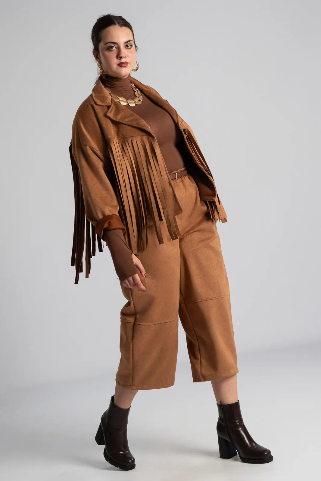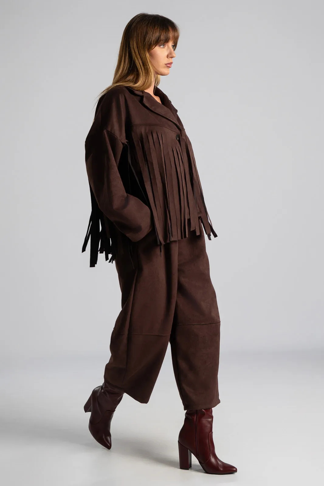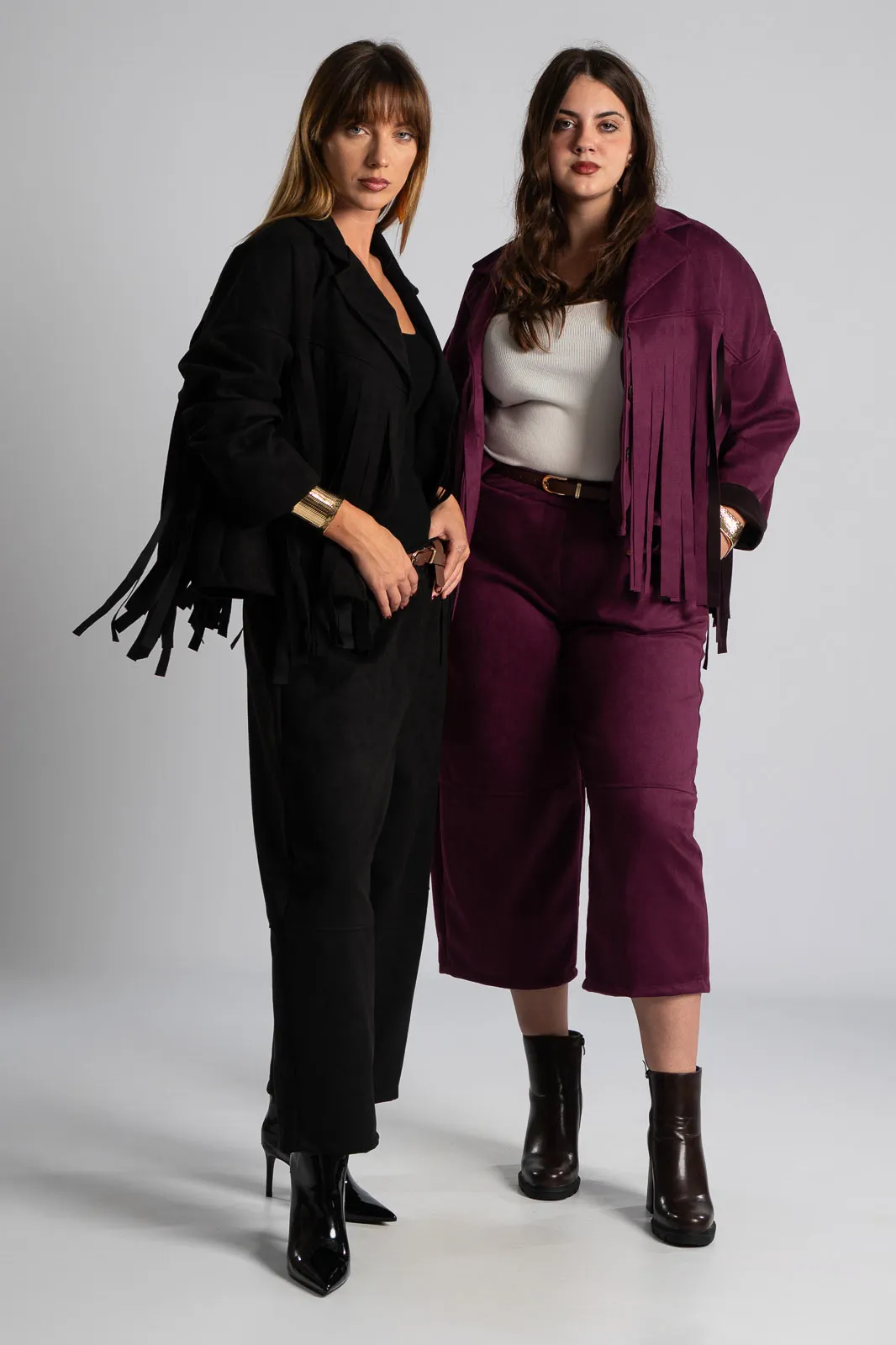 Σετ που αποτελείται από σακάκι και παντελόνι. Το σακάκι έχει μακριά μανίκια και κλείνει με κουμπιά στο μπροστινό μέρος. Σε όλη την επιφάνεια περιμετρικά διαθέτει διακοσμητικά κρόσια κατά μήκος του. Έχει γιακά και πέτο. Το παντελόνι έχει λάστιχο στην μέση με δική του ζώνη για καλύτερη εφαρμογή. Διαθέτει πλαινές τσέπες. Σε όλη την επιφάνεια έχει σουέτ υφή. Η μέτρηση στο σακάκι έχει γίνει με κλειστά τα κουμπιά. Οι μετρήσεις του πίνακα είναι αντιπροσωπευτικές για κάθε κωδικό. 95% polyester, 5% elastan.