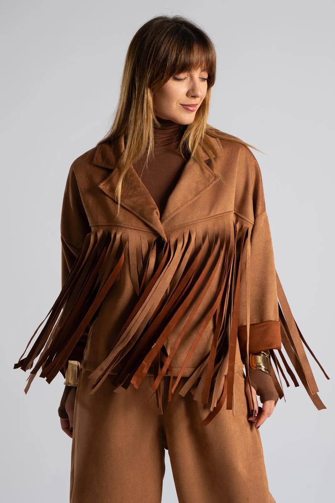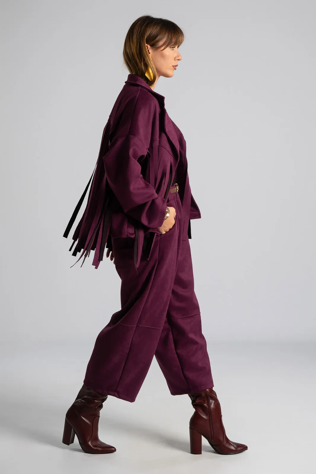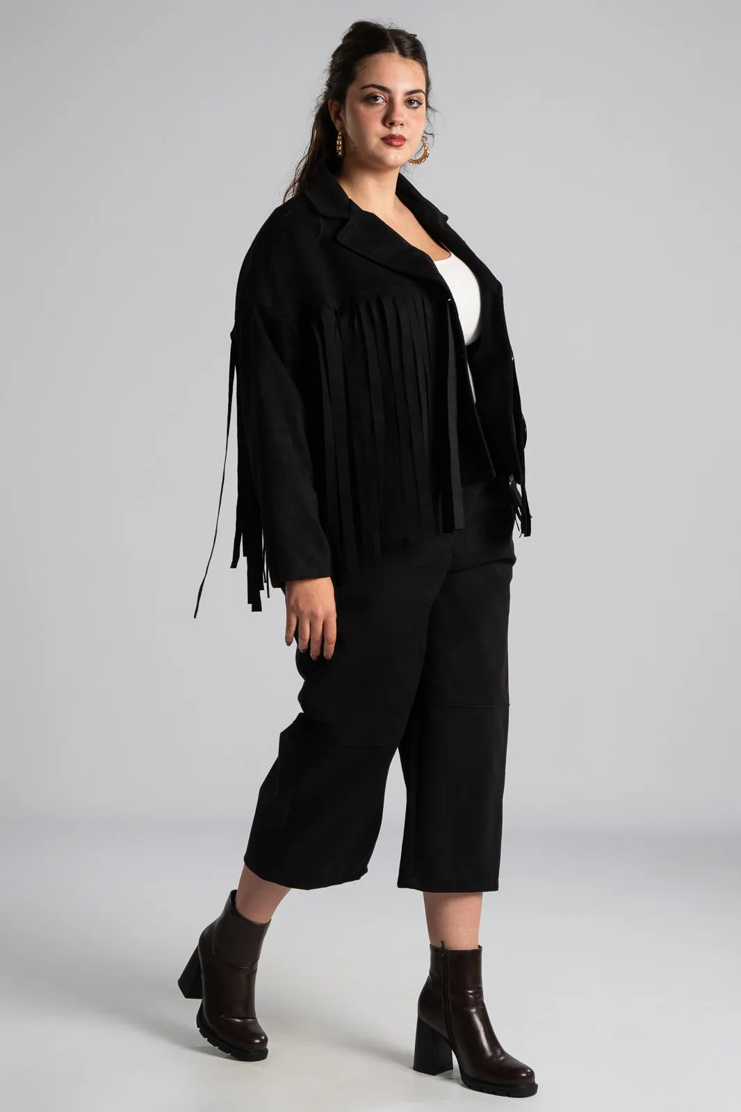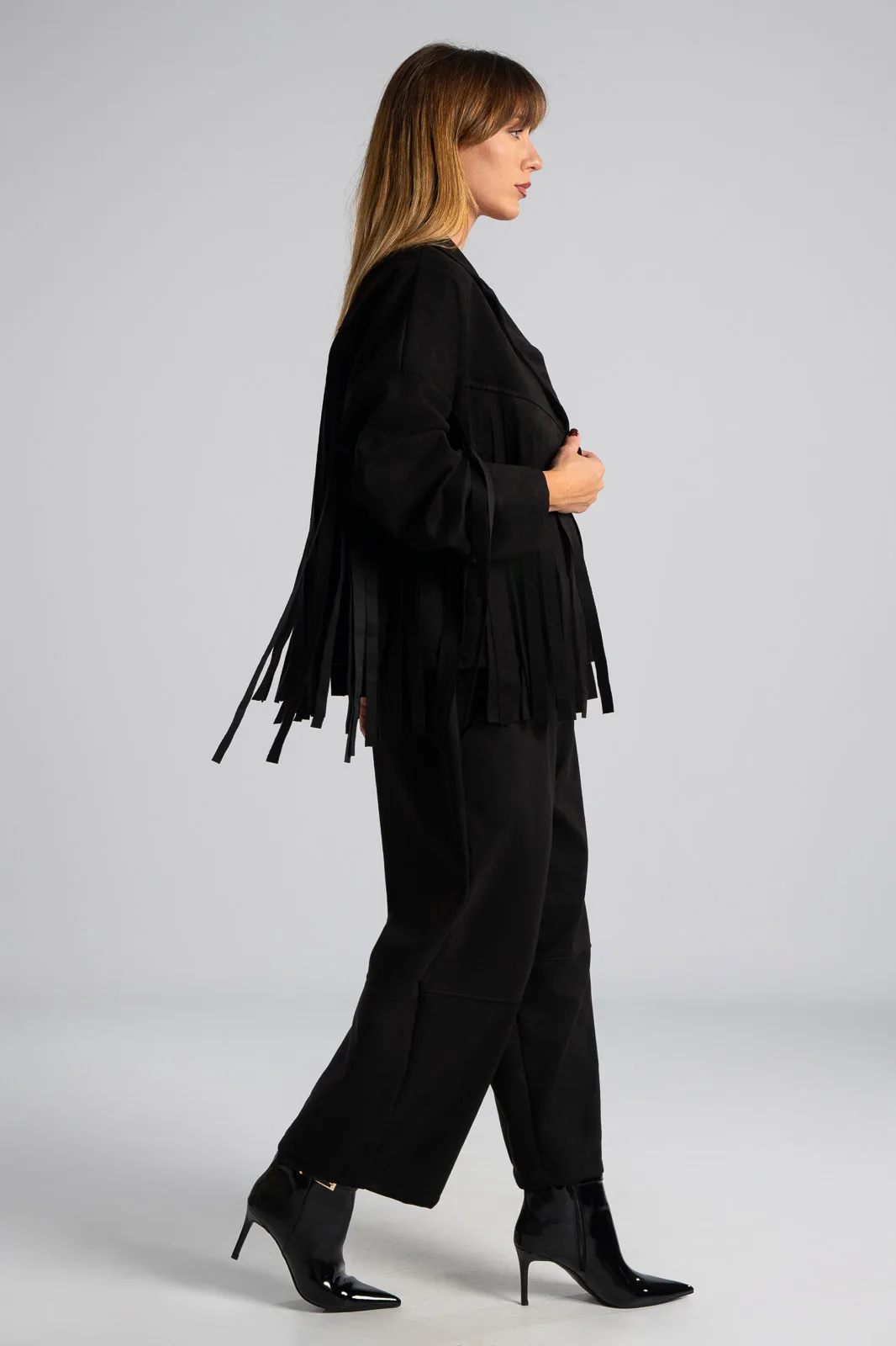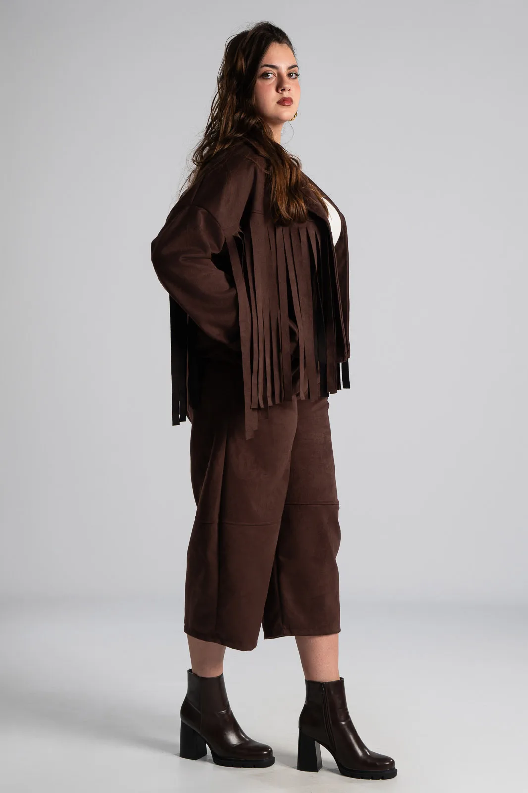 Σετ που αποτελείται από σακάκι και παντελόνι. Το σακάκι έχει μακριά μανίκια και κλείνει με κουμπιά στο μπροστινό μέρος. Σε όλη την επιφάνεια περιμετρικά διαθέτει διακοσμητικά κρόσια κατά μήκος του. Έχει γιακά και πέτο. Το παντελόνι έχει λάστιχο στην μέση με δική του ζώνη για καλύτερη εφαρμογή. Διαθέτει πλαινές τσέπες. Σε όλη την επιφάνεια έχει σουέτ υφή. Η μέτρηση στο σακάκι έχει γίνει με κλειστά τα κουμπιά. Οι μετρήσεις του πίνακα είναι αντιπροσωπευτικές για κάθε κωδικό. 95% polyester, 5% elastan.
