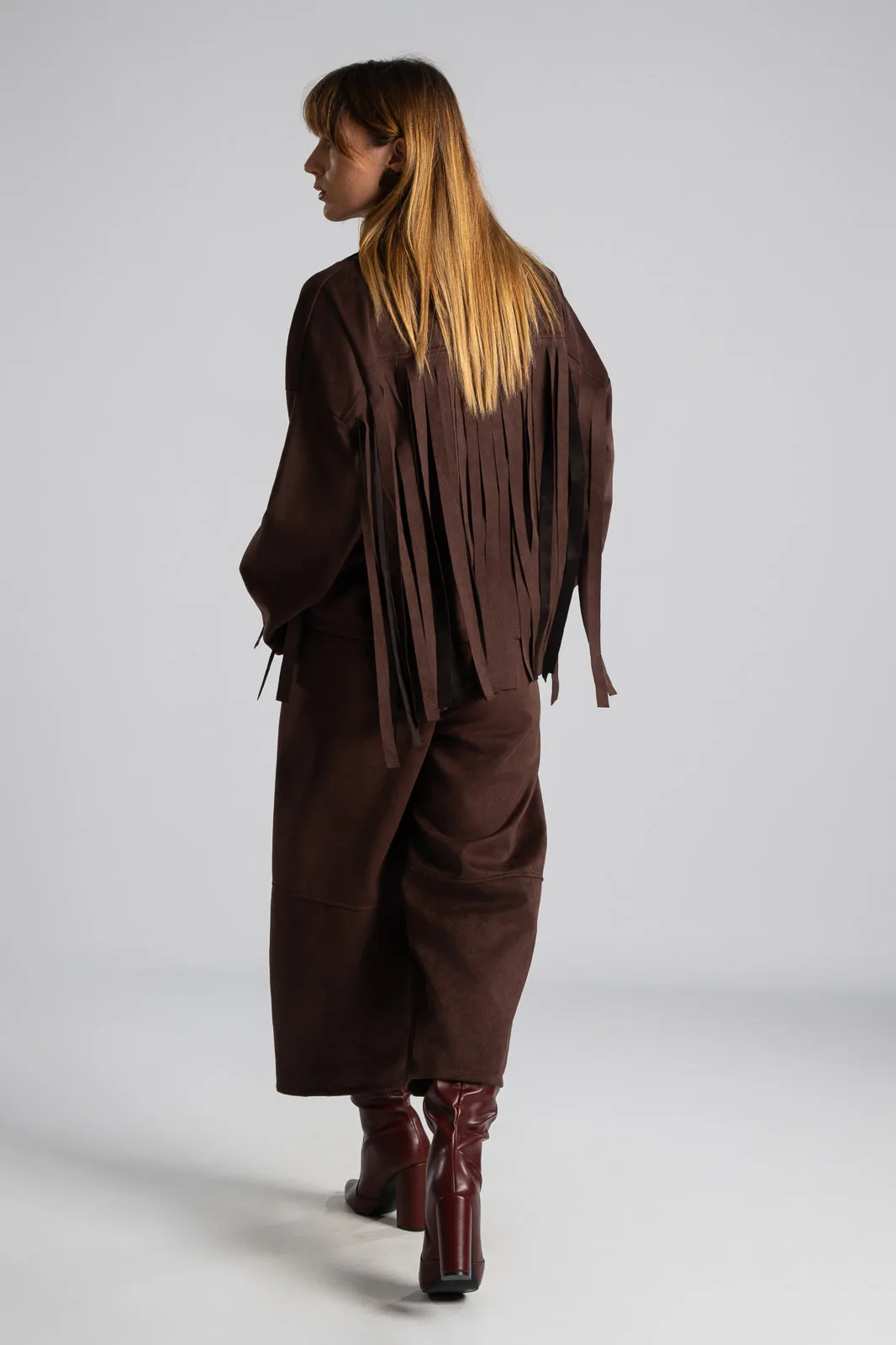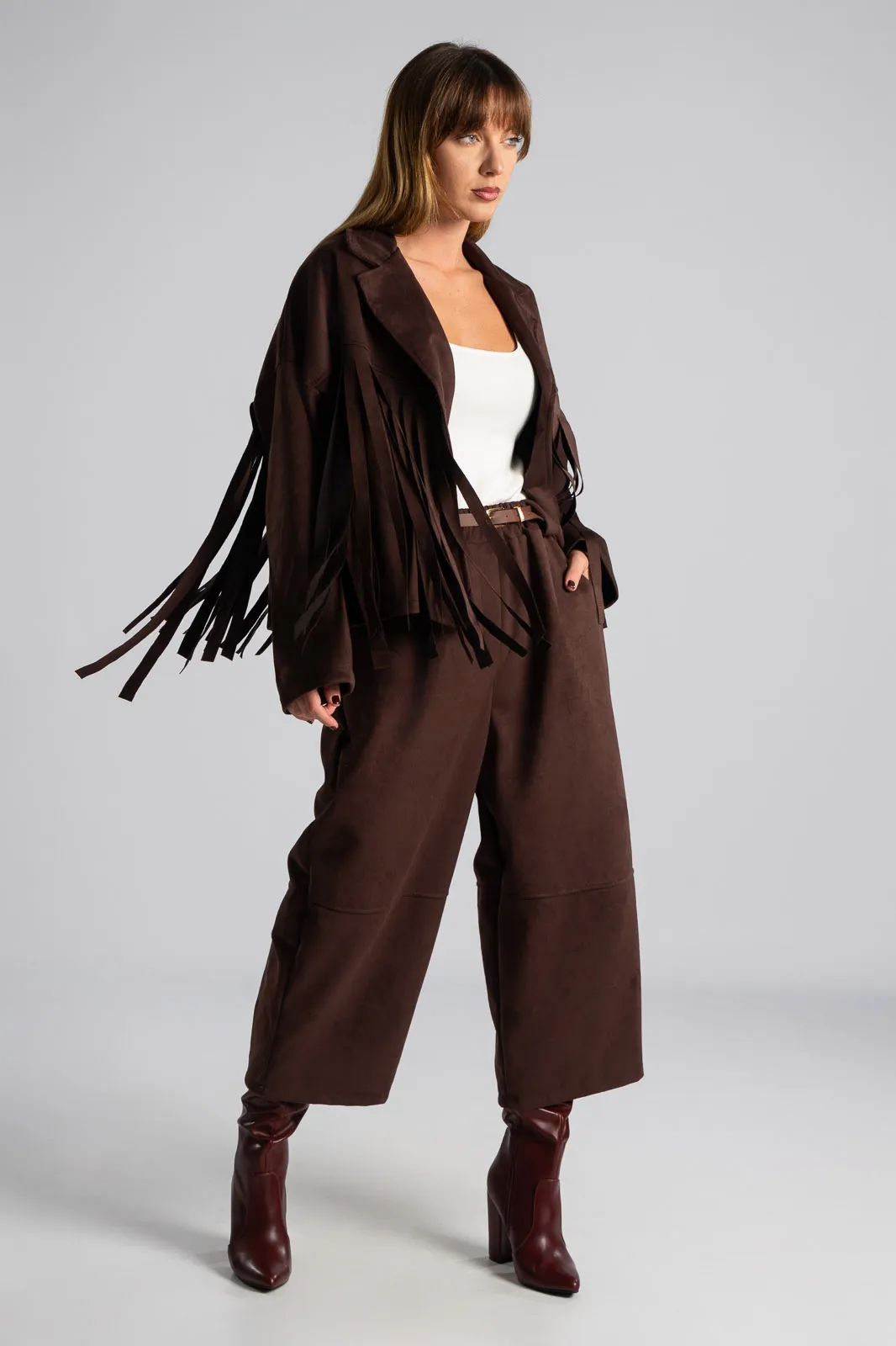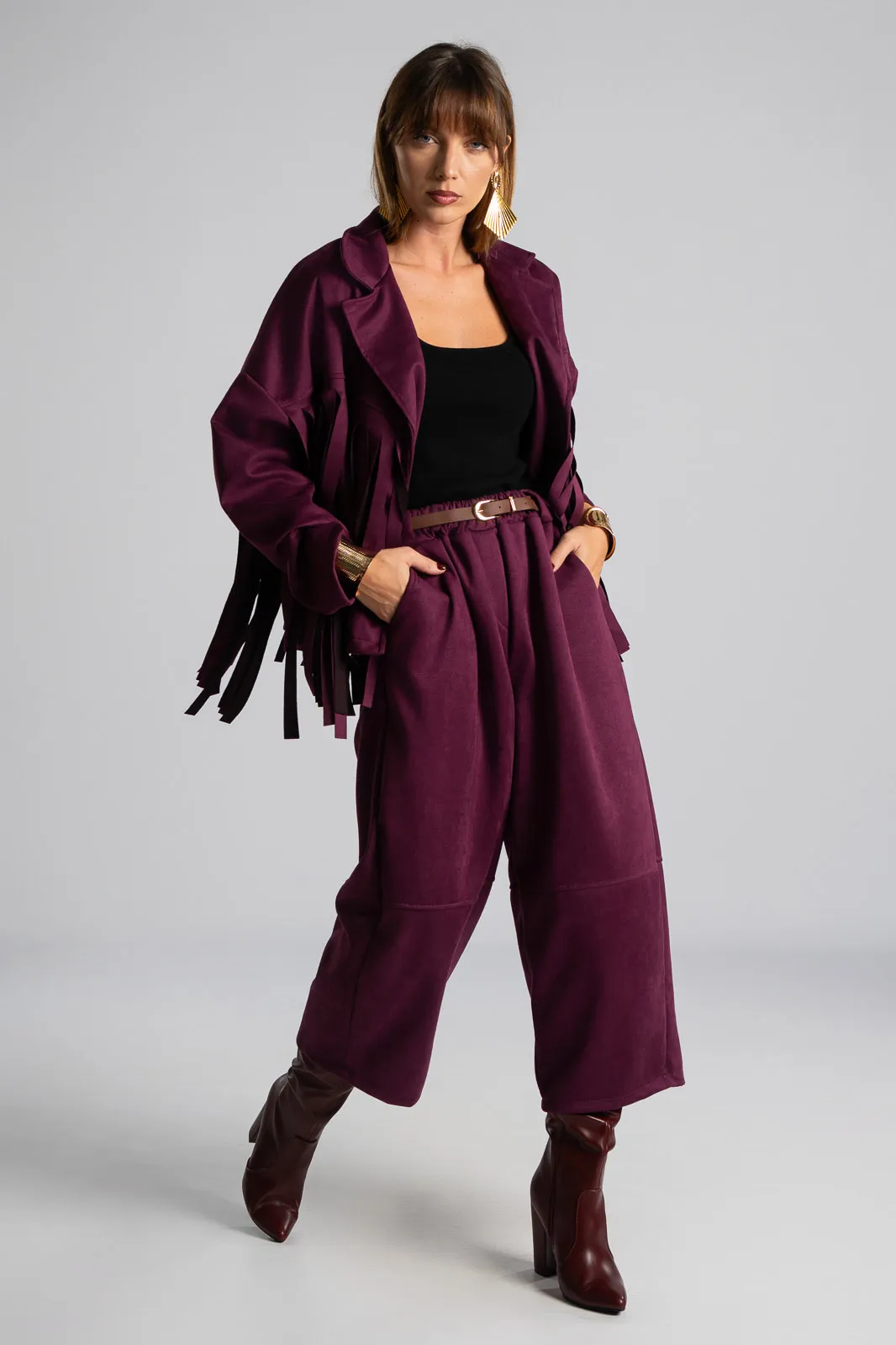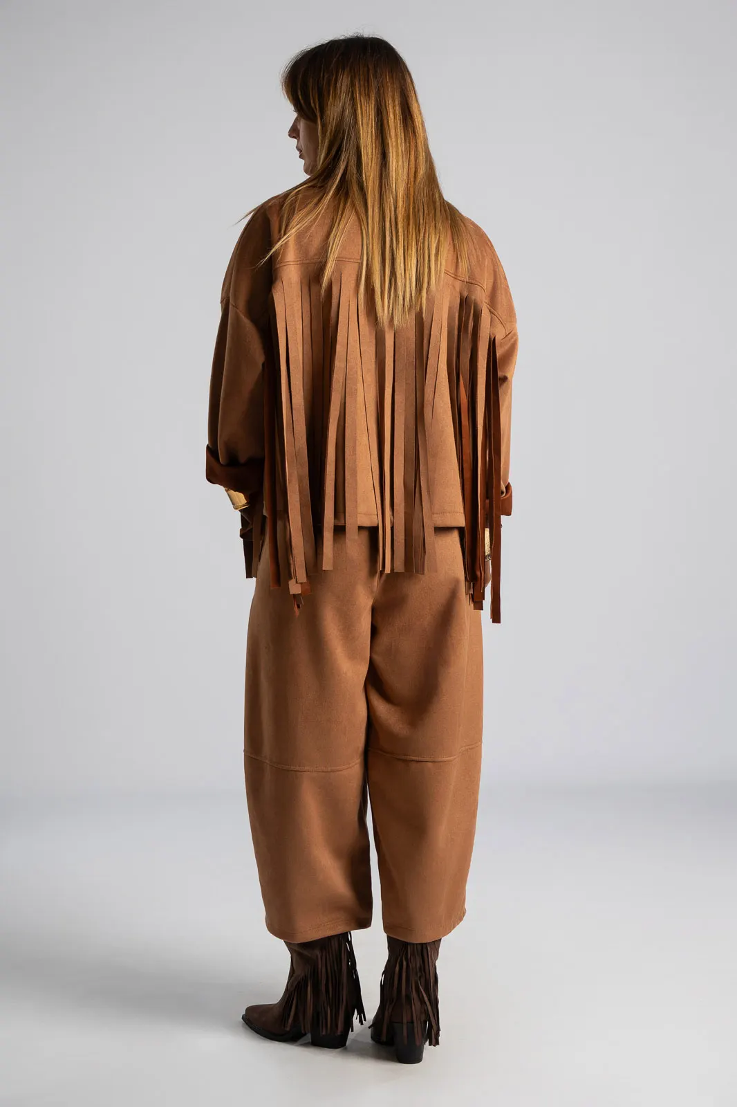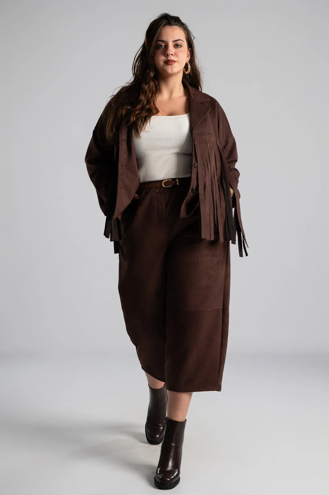Σετ που αποτελείται από σακάκι και παντελόνι. Το σακάκι έχει μακριά μανίκια και κλείνει με κουμπιά στο μπροστινό μέρος. Σε όλη την επιφάνεια περιμετρικά διαθέτει διακοσμητικά κρόσια κατά μήκος του. Έχει γιακά και πέτο. Το παντελόνι έχει λάστιχο στην μέση με δική του ζώνη για καλύτερη εφαρμογή. Διαθέτει πλαινές τσέπες. Σε όλη την επιφάνεια έχει σουέτ υφή. Η μέτρηση στο σακάκι έχει γίνει με κλειστά τα κουμπιά. Οι μετρήσεις του πίνακα είναι αντιπροσωπευτικές για κάθε κωδικό. 95% polyester, 5% elastan.