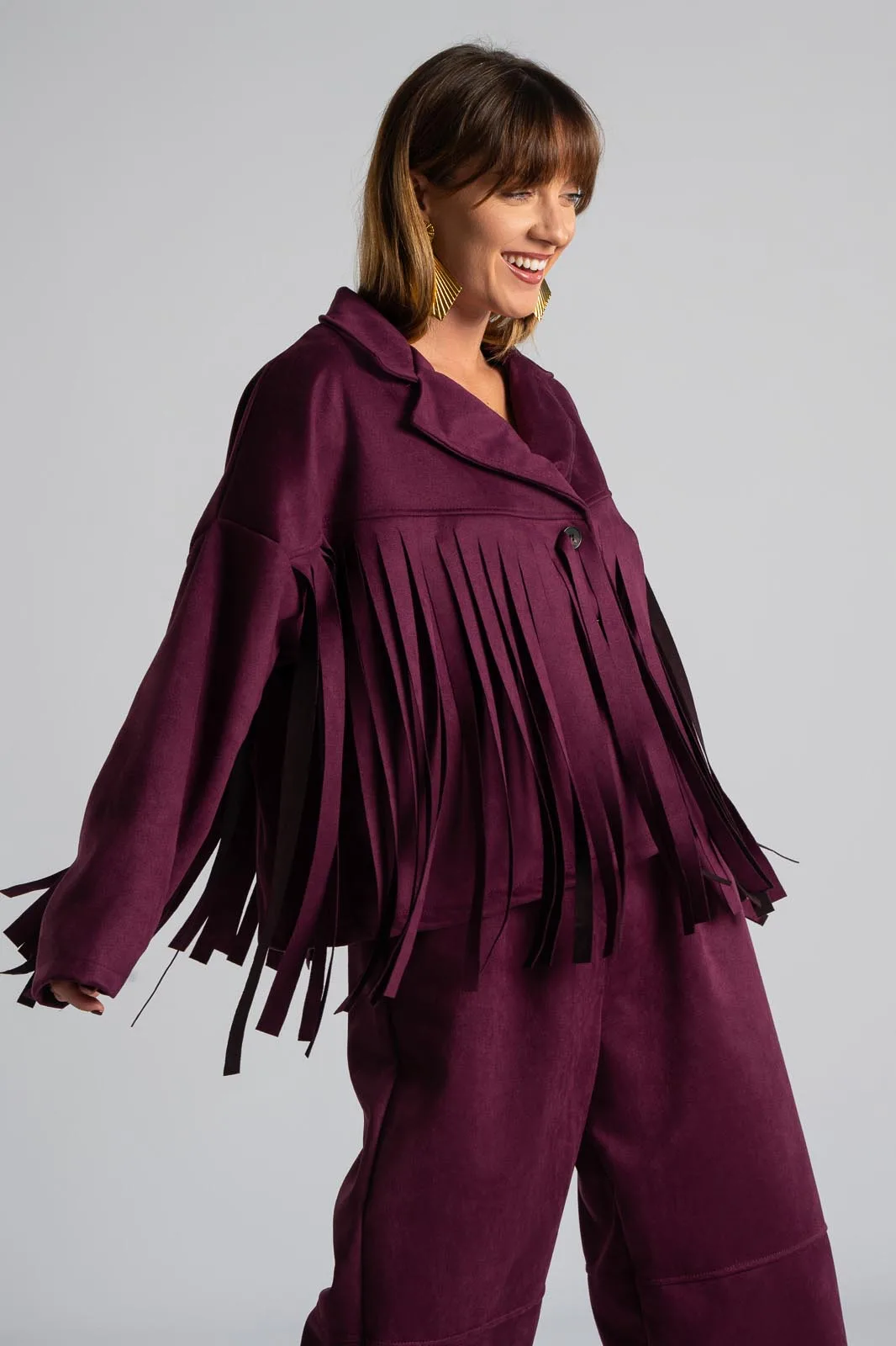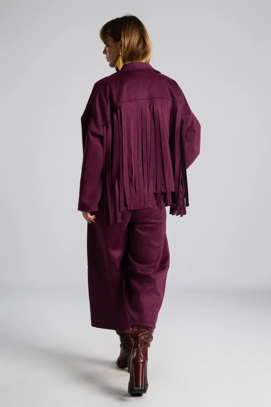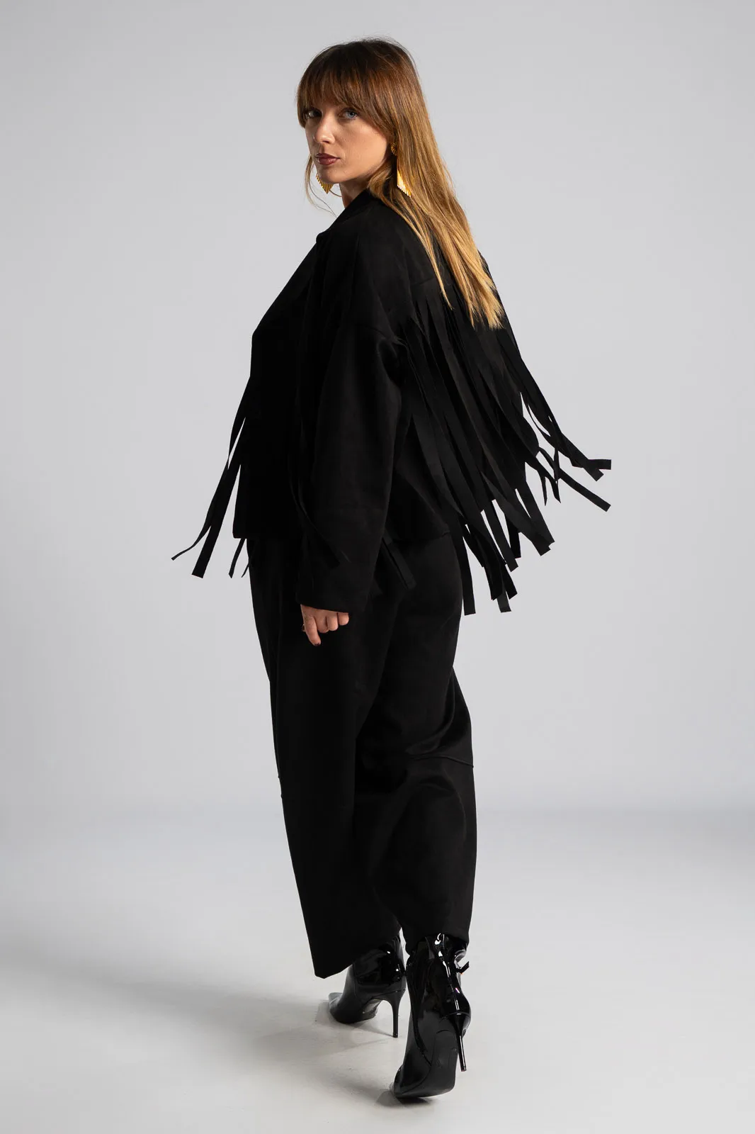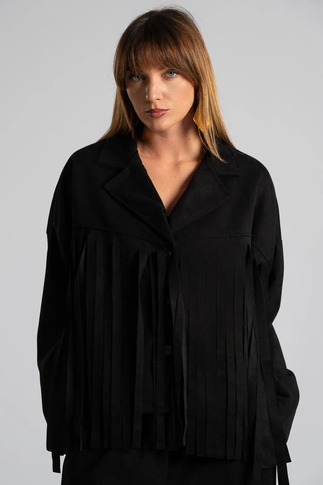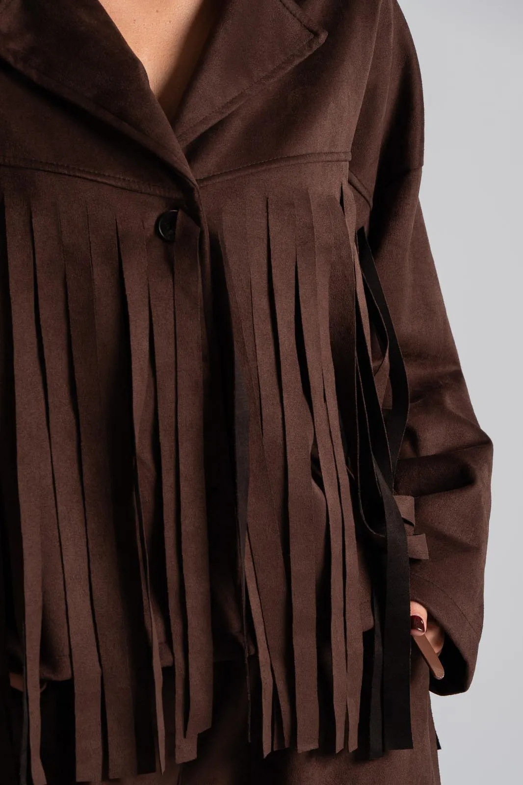 Σετ που αποτελείται από σακάκι και παντελόνι. Το σακάκι έχει μακριά μανίκια και κλείνει με κουμπιά στο μπροστινό μέρος. Σε όλη την επιφάνεια περιμετρικά διαθέτει διακοσμητικά κρόσια κατά μήκος του. Έχει γιακά και πέτο. Το παντελόνι έχει λάστιχο στην μέση με δική του ζώνη για καλύτερη εφαρμογή. Διαθέτει πλαινές τσέπες. Σε όλη την επιφάνεια έχει σουέτ υφή. Η μέτρηση στο σακάκι έχει γίνει με κλειστά τα κουμπιά. Οι μετρήσεις του πίνακα είναι αντιπροσωπευτικές για κάθε κωδικό. 95% polyester, 5% elastan.
