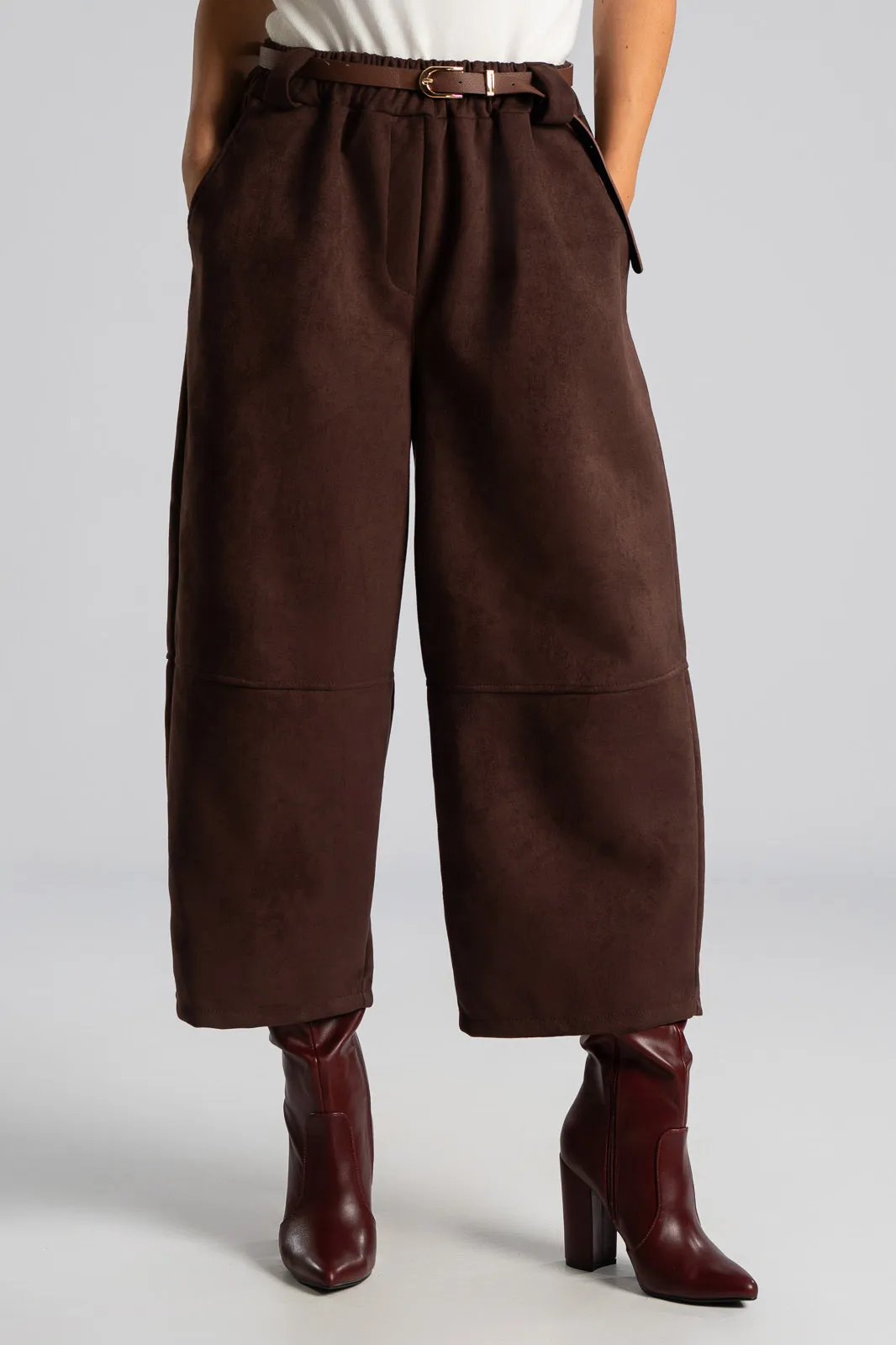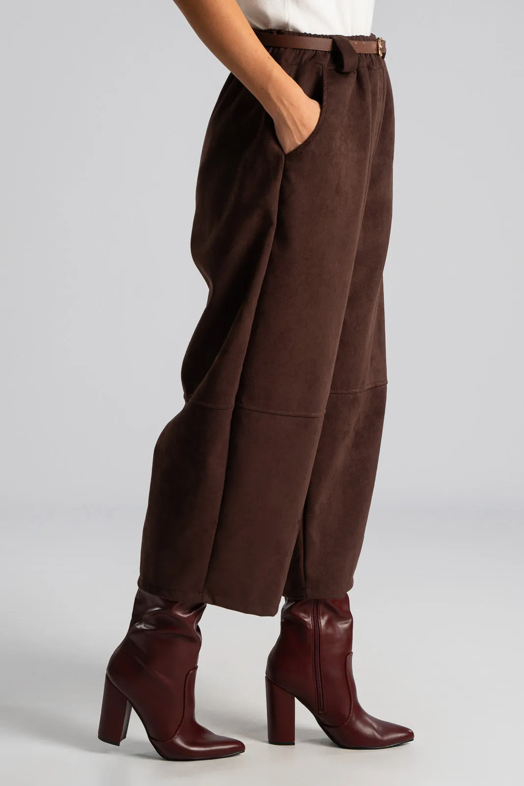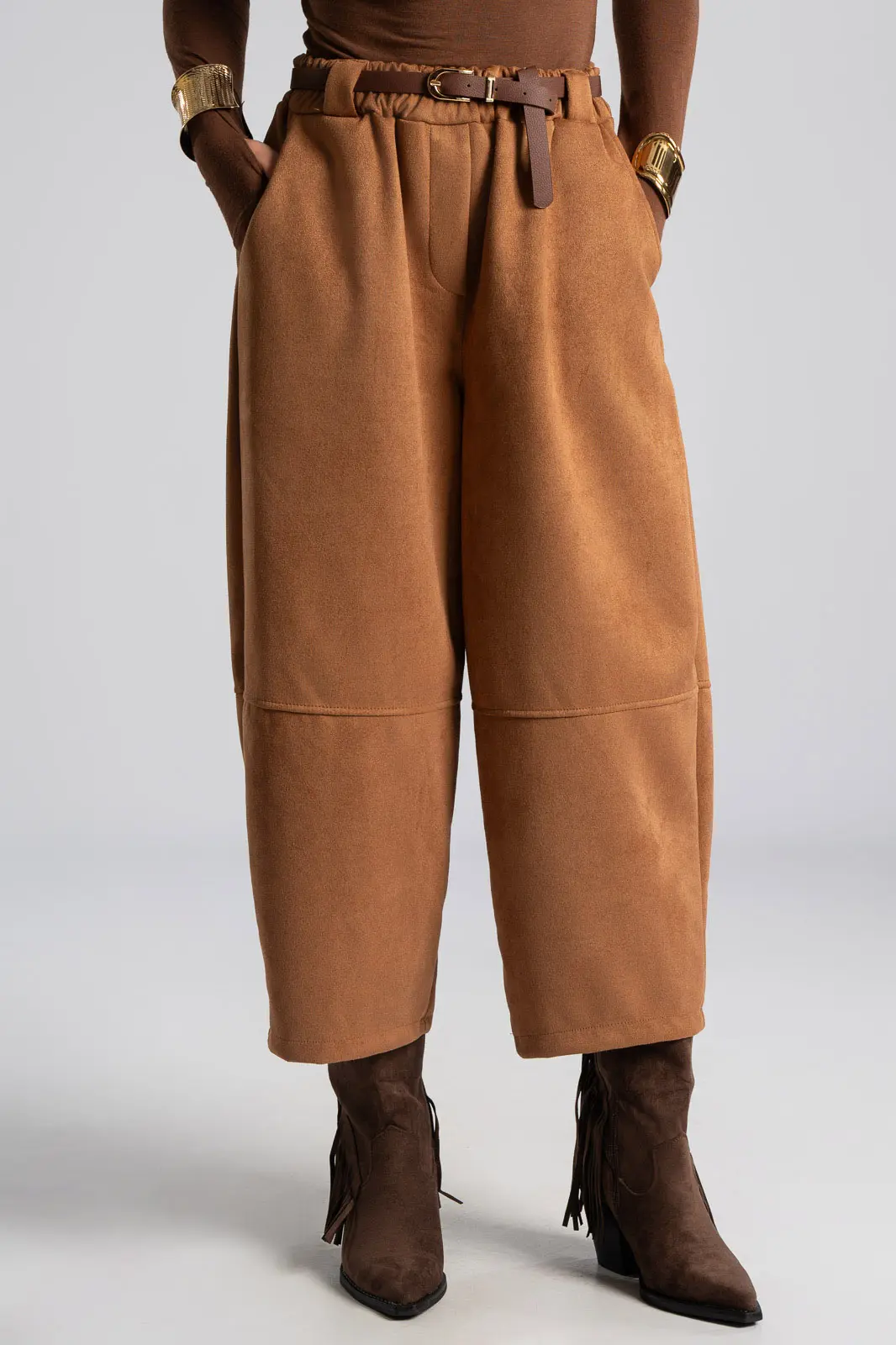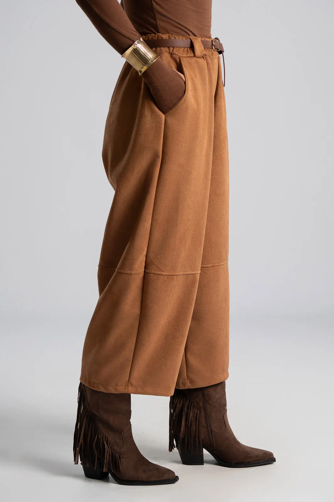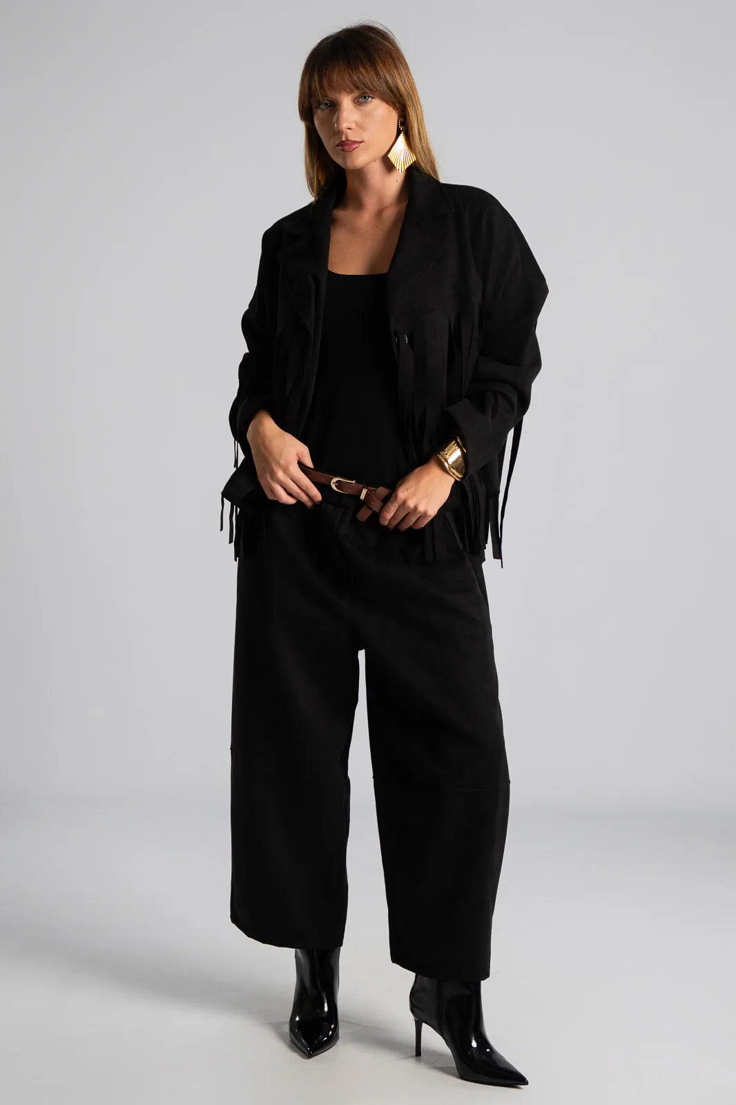 Σετ που αποτελείται από σακάκι και παντελόνι. Το σακάκι έχει μακριά μανίκια και κλείνει με κουμπιά στο μπροστινό μέρος. Σε όλη την επιφάνεια περιμετρικά διαθέτει διακοσμητικά κρόσια κατά μήκος του. Έχει γιακά και πέτο. Το παντελόνι έχει λάστιχο στην μέση με δική του ζώνη για καλύτερη εφαρμογή. Διαθέτει πλαινές τσέπες. Σε όλη την επιφάνεια έχει σουέτ υφή. Η μέτρηση στο σακάκι έχει γίνει με κλειστά τα κουμπιά. Οι μετρήσεις του πίνακα είναι αντιπροσωπευτικές για κάθε κωδικό. 95% polyester, 5% elastan.