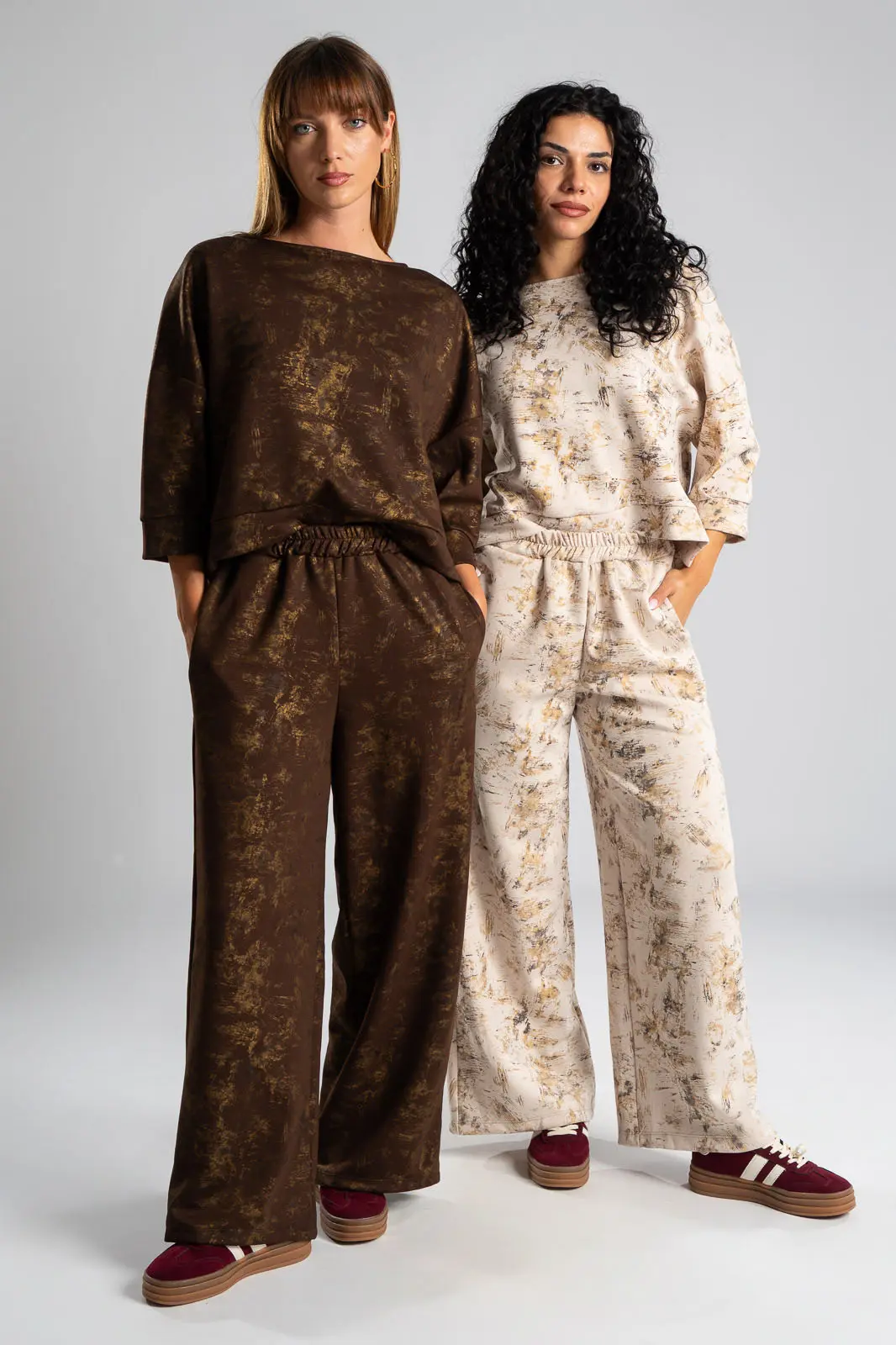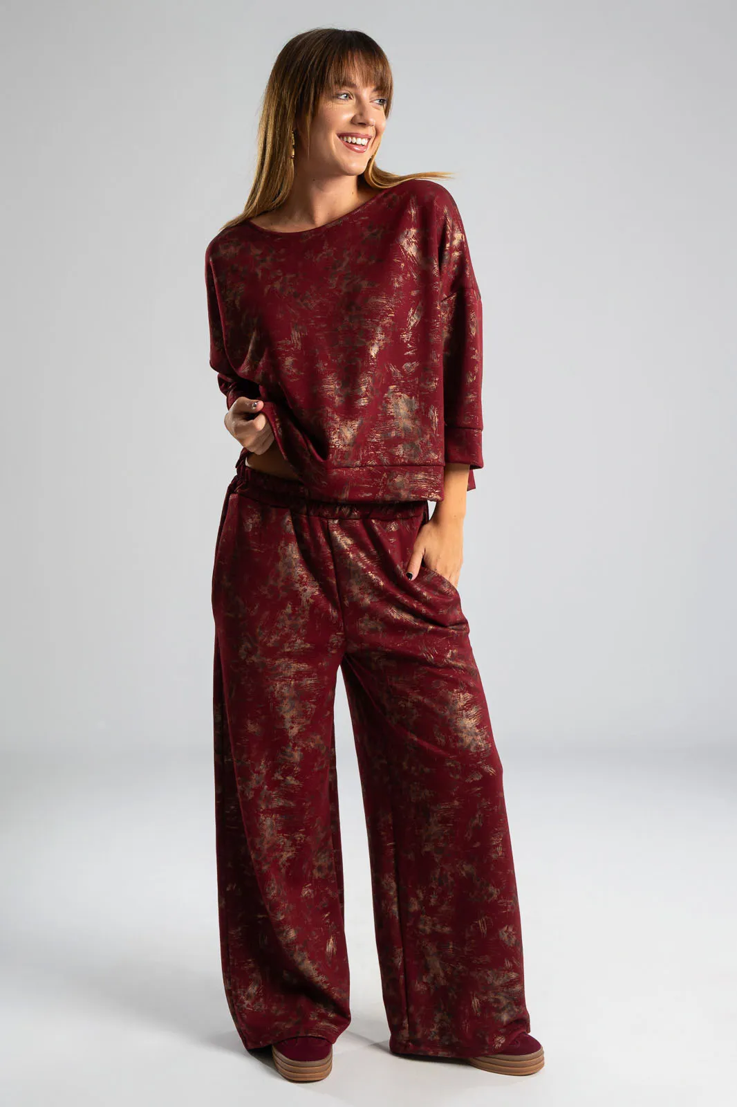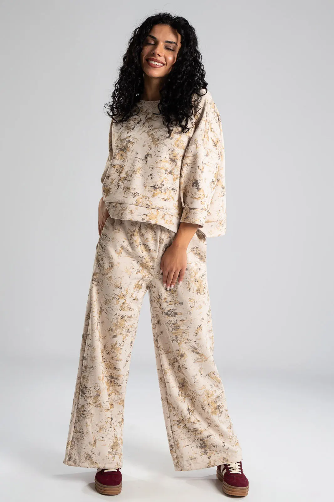 Set consisting of a top and pants. The top has a round neckline. It has long sleeves. The pants have an elastic waistband and side pockets. The measurements in the table are representative of each product. 55% polyester, 39% viscose, 6% elastane.Top:
