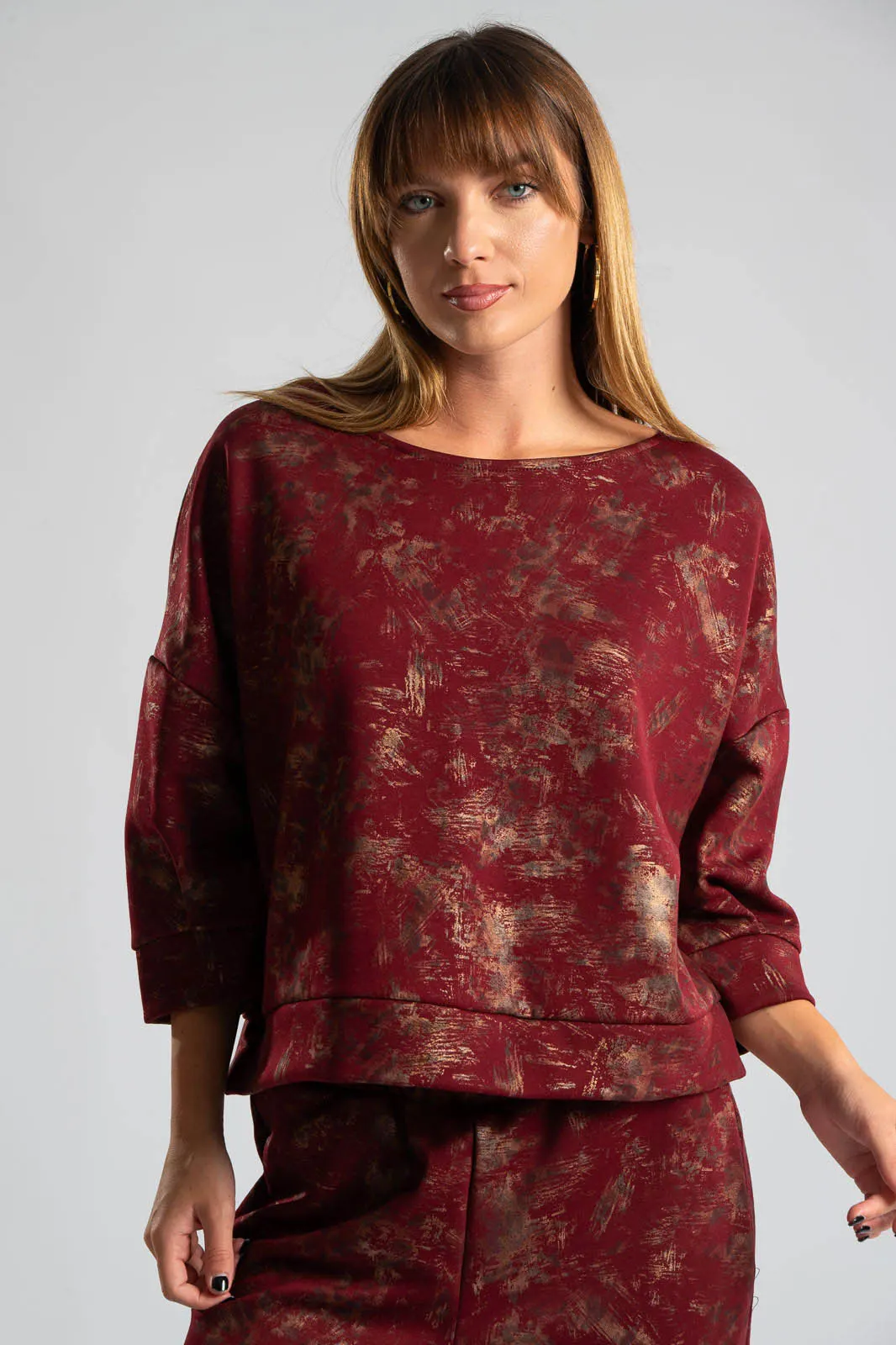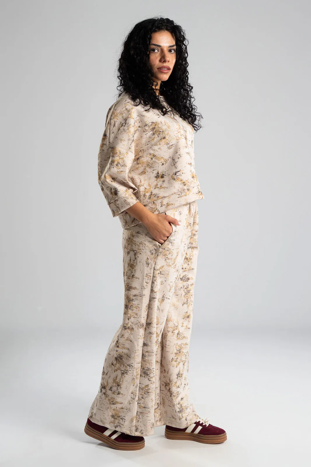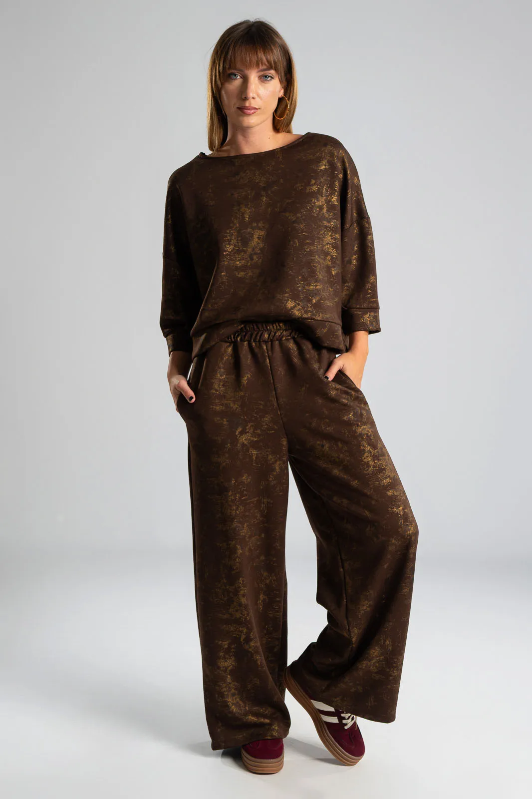 Set consisting of a top and pants. The top has a round neckline. It has long sleeves. The pants have an elastic waistband and side pockets. The measurements in the table are representative of each product. 55% polyester, 39% viscose, 6% elastane.Top: