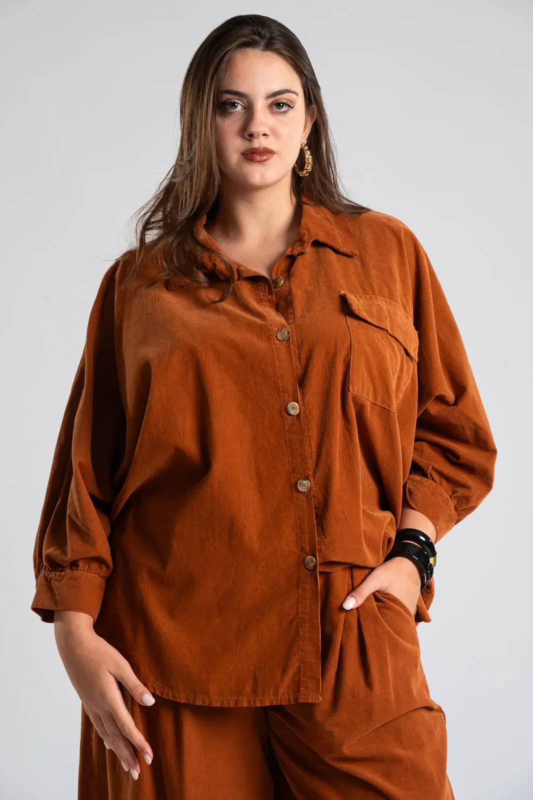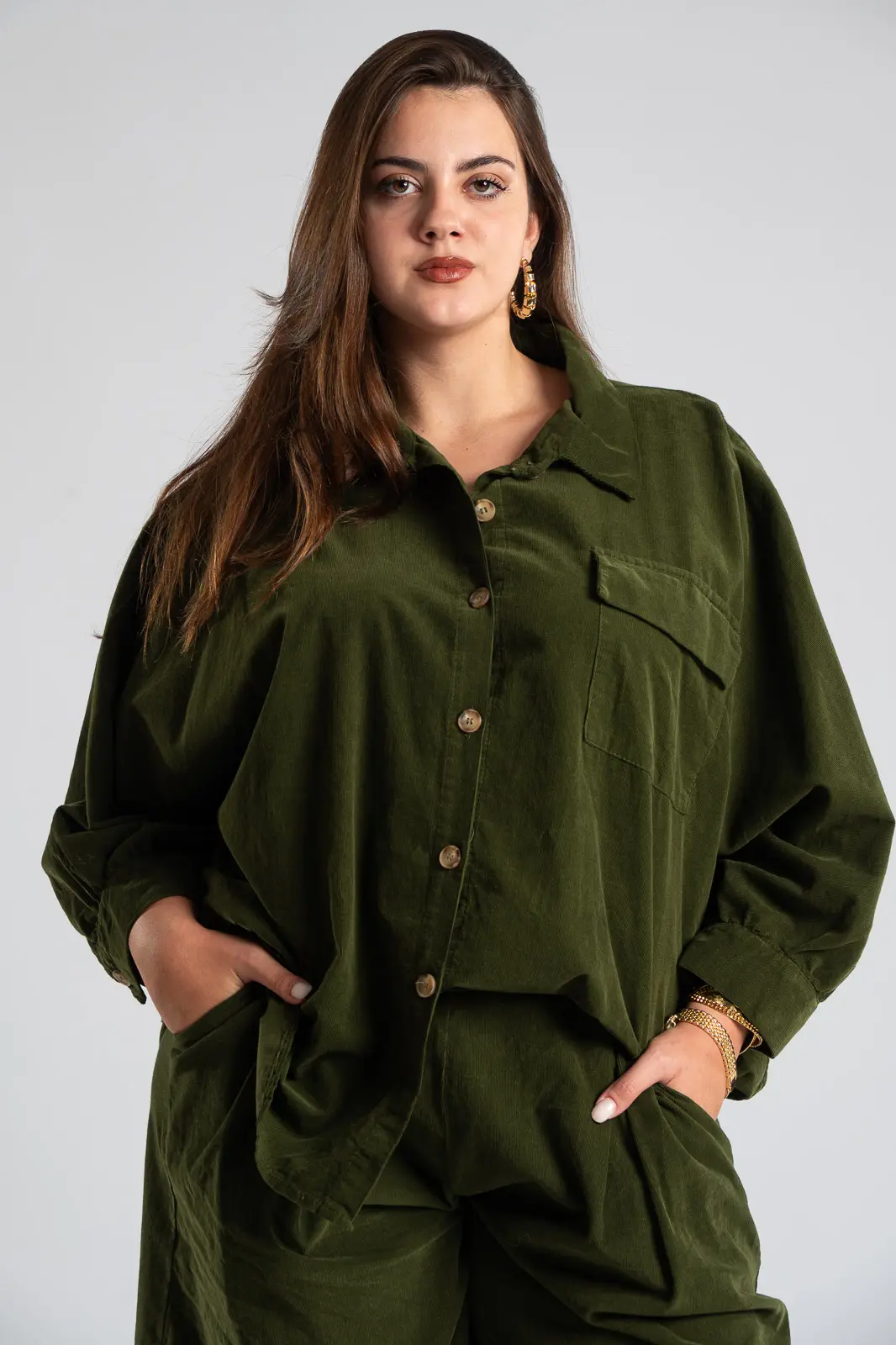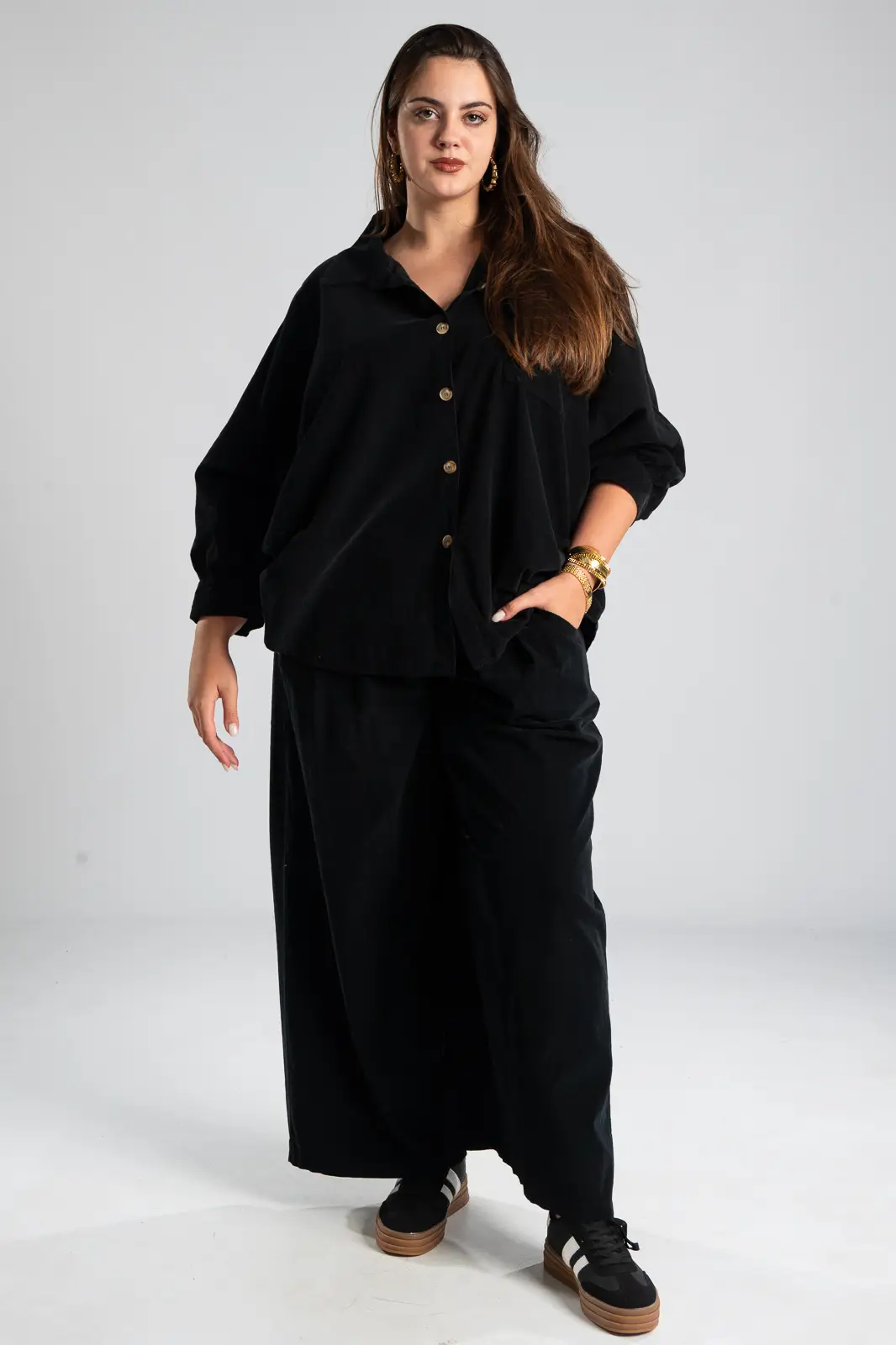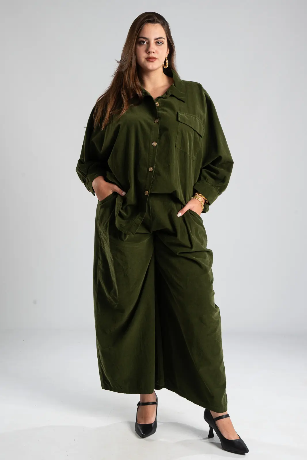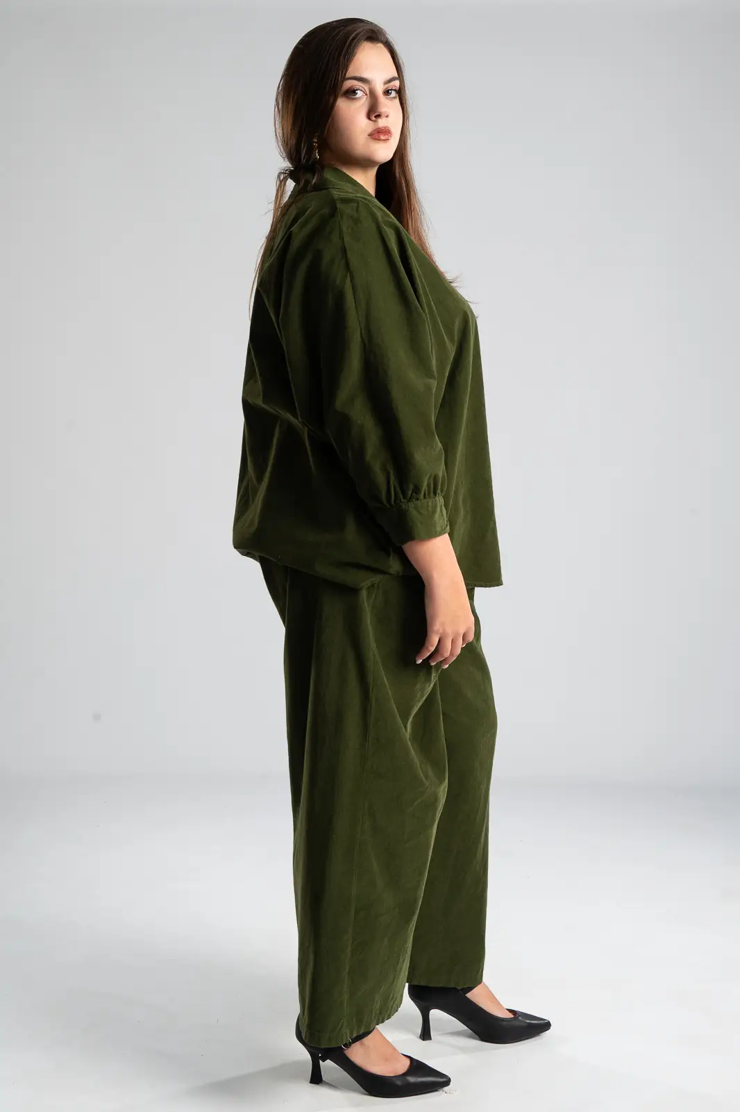 Κοτλέ βαμβακερό σετ που αποτελείται από πουκάμισο και παντελόνι. Το πουκάμισο έχει μακριά μανίκια τύπου νυχτερίδα που κλείνουν με κουμπί. Είναι σε ίσια γραμμή. Το παντελόνι έχει λάστιχο στο πίσω μέρος για να προσαρμόζεται καλύτερα. Είναι ψηλόμεσο και έχει ίσια γραμμή. Διαθέτει δική του ζώνη δερματίνη. Στο πλάι διαθέτει τσέπες και στο μπροστινό μέρος διαθέτει πιέτες. Οι μετρήσεις του πίνακα είναι αντιπροσωπευτικές για κάθε προϊόν. 100% cotton.