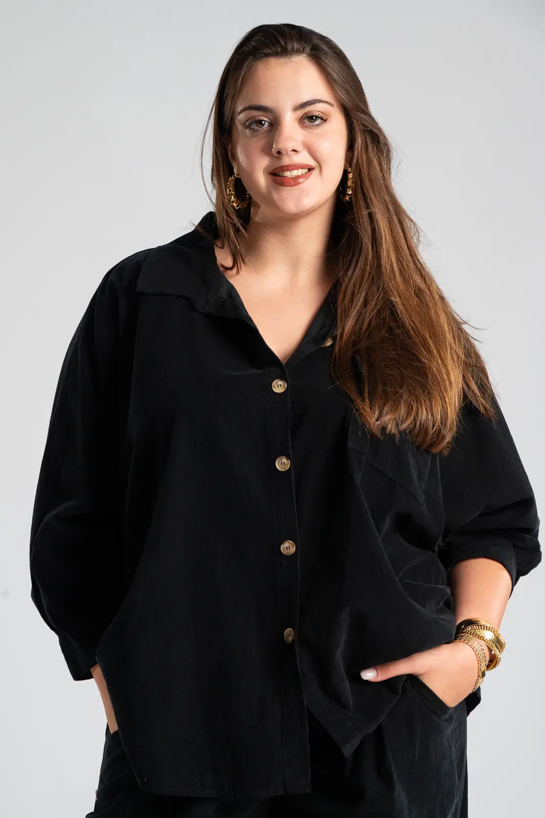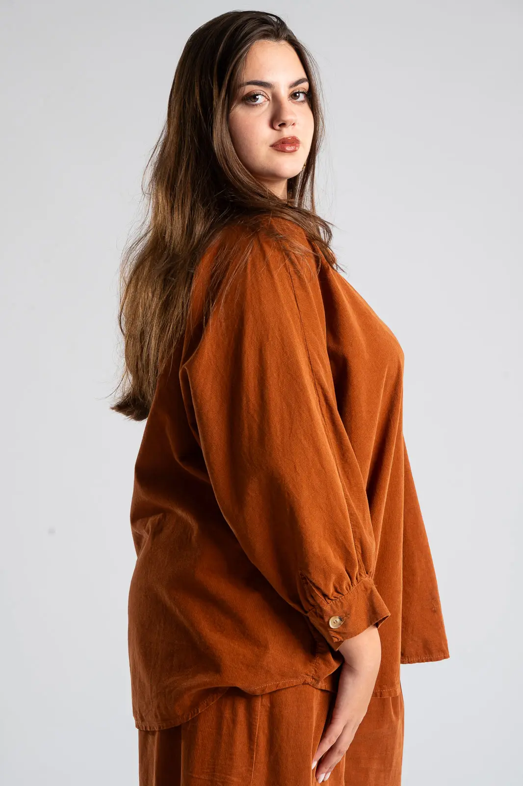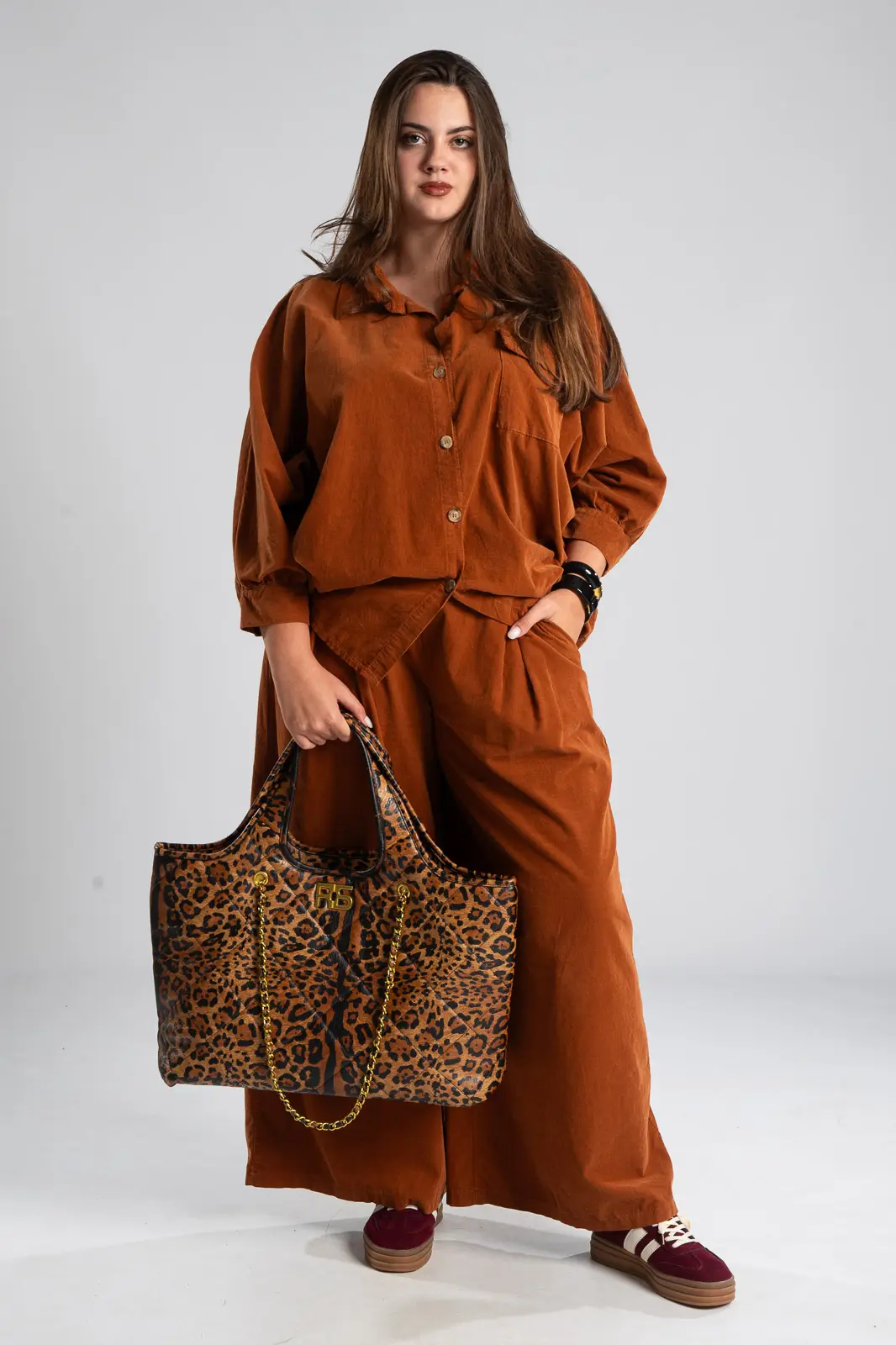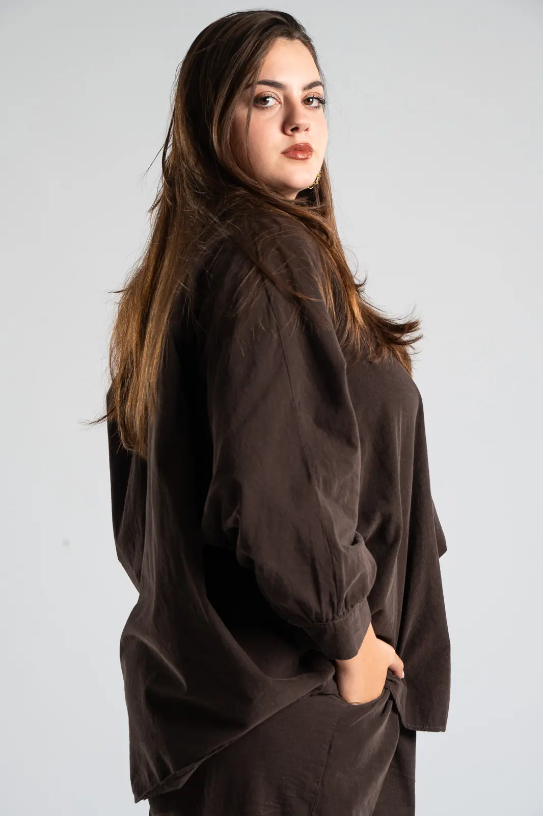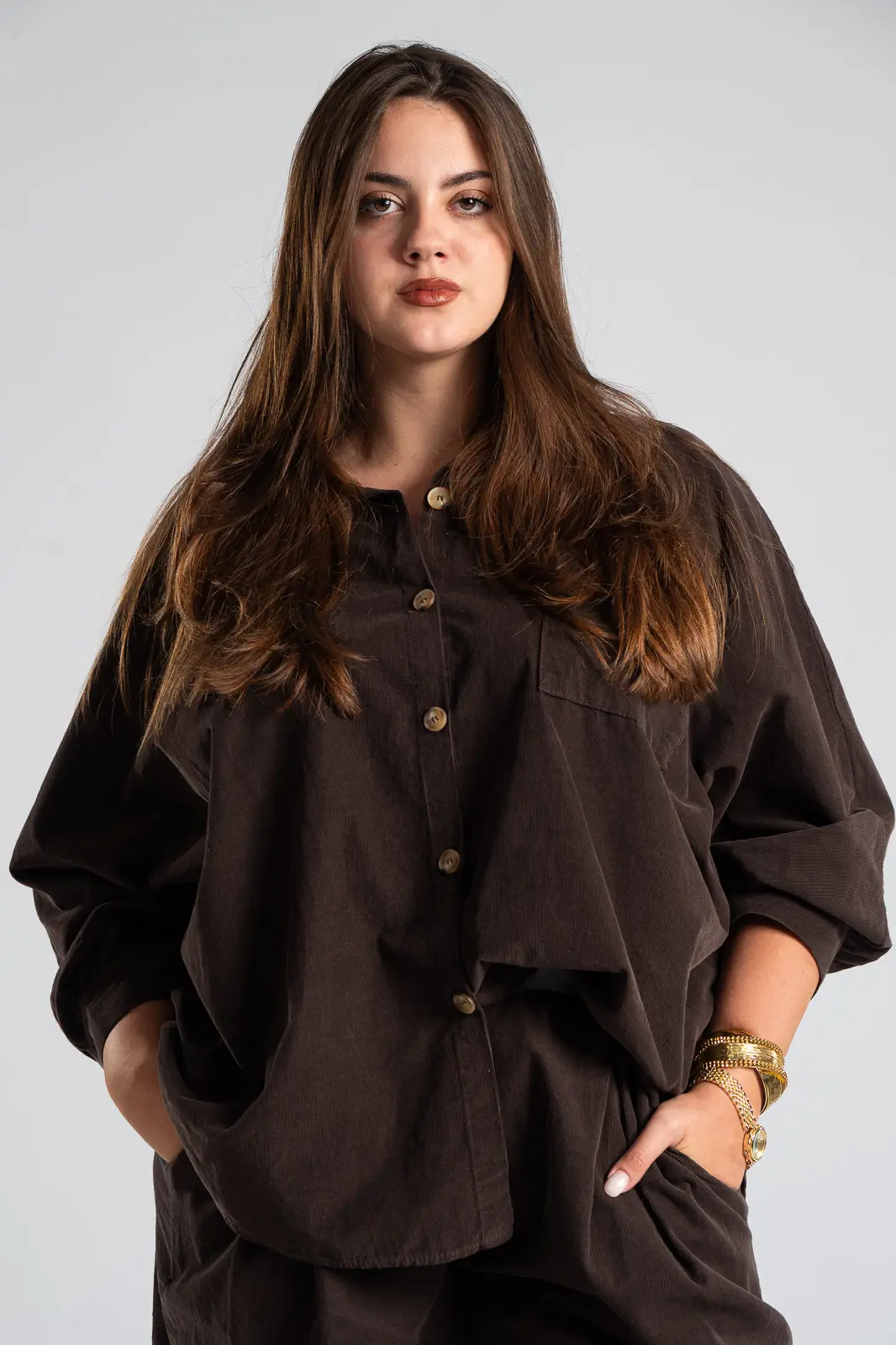 Κοτλέ βαμβακερό σετ που αποτελείται από πουκάμισο και παντελόνι. Το πουκάμισο έχει μακριά μανίκια τύπου νυχτερίδα που κλείνουν με κουμπί. Είναι σε ίσια γραμμή. Το παντελόνι έχει λάστιχο στο πίσω μέρος για να προσαρμόζεται καλύτερα. Είναι ψηλόμεσο και έχει ίσια γραμμή. Διαθέτει δική του ζώνη δερματίνη. Στο πλάι διαθέτει τσέπες και στο μπροστινό μέρος διαθέτει πιέτες. Οι μετρήσεις του πίνακα είναι αντιπροσωπευτικές για κάθε προϊόν. 100% cotton.