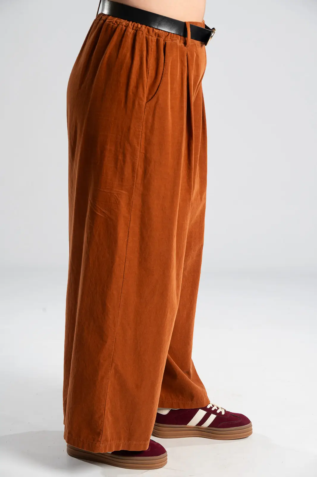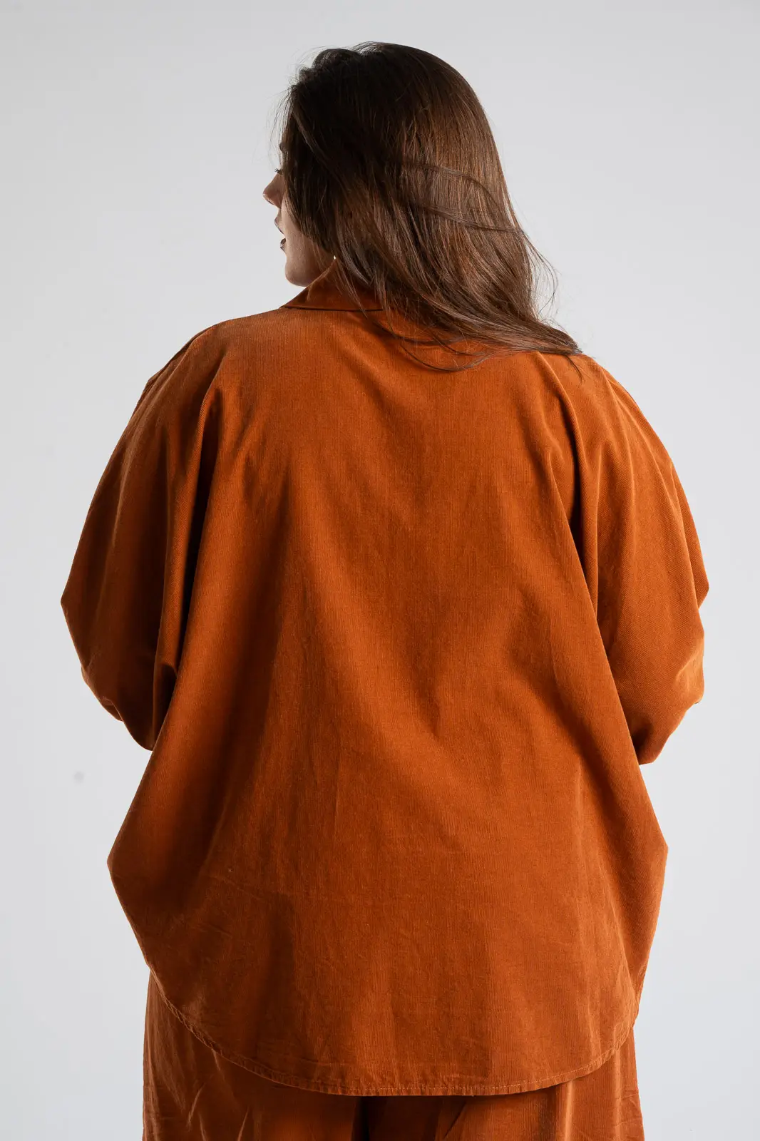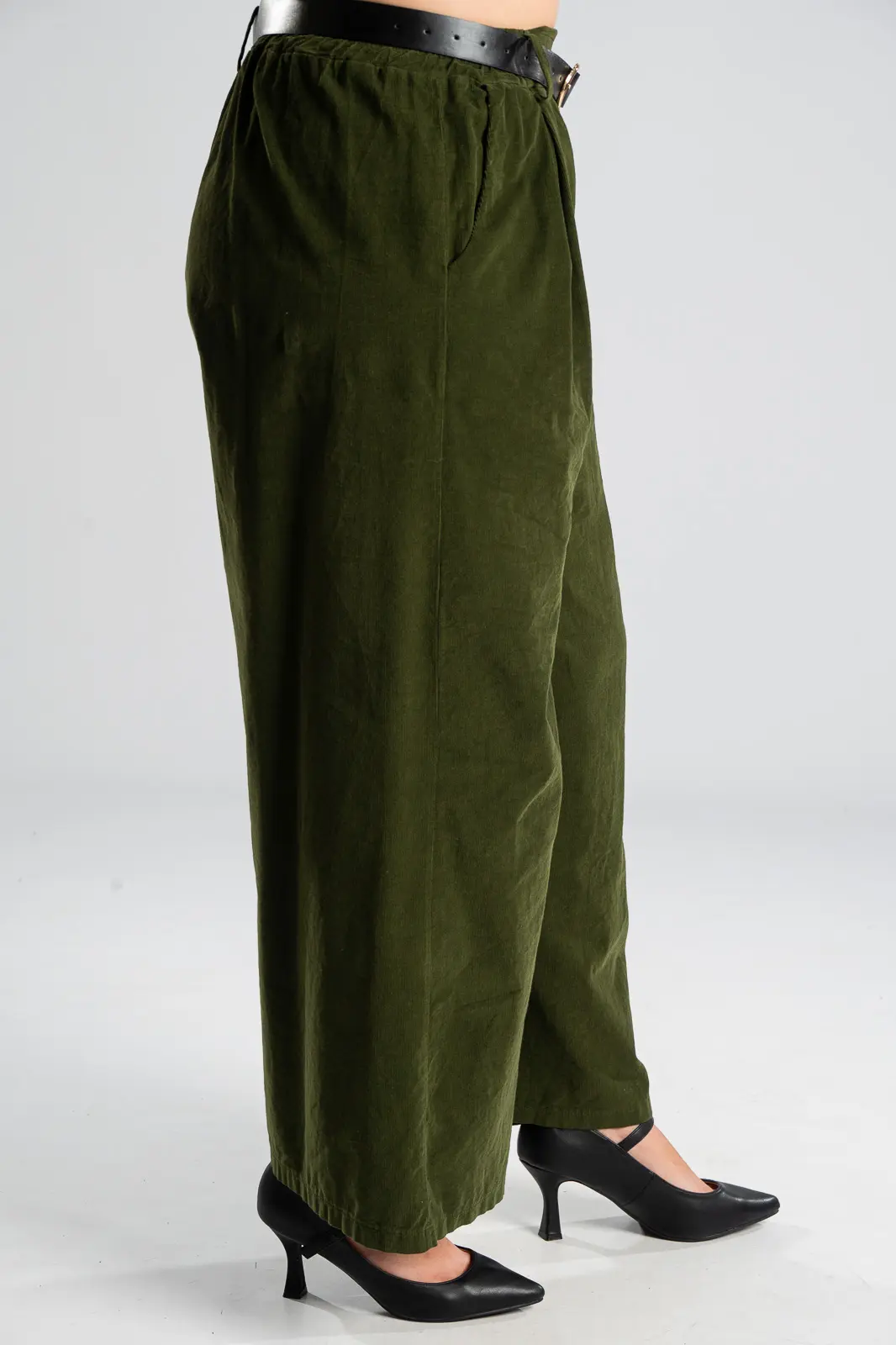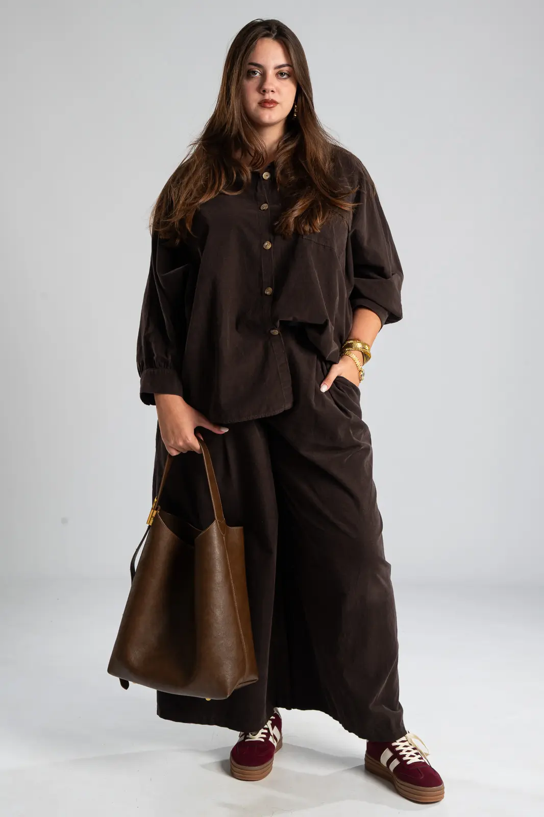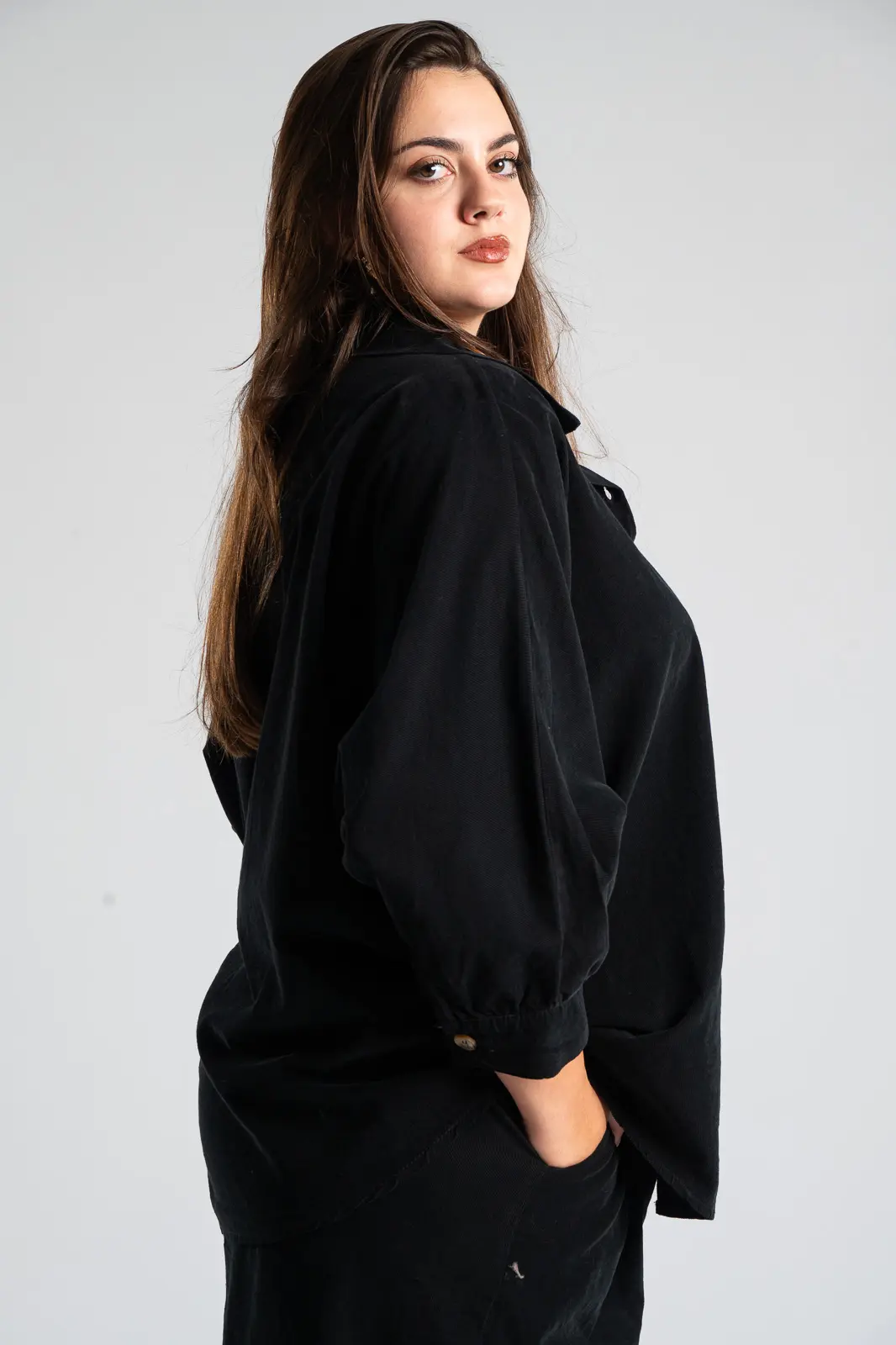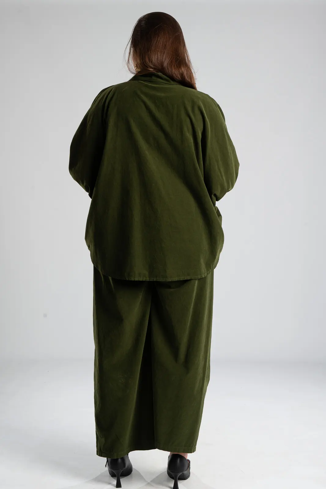 Κοτλέ βαμβακερό σετ που αποτελείται από πουκάμισο και παντελόνι. Το πουκάμισο έχει μακριά μανίκια τύπου νυχτερίδα που κλείνουν με κουμπί. Είναι σε ίσια γραμμή. Το παντελόνι έχει λάστιχο στο πίσω μέρος για να προσαρμόζεται καλύτερα. Είναι ψηλόμεσο και έχει ίσια γραμμή. Διαθέτει δική του ζώνη δερματίνη. Στο πλάι διαθέτει τσέπες και στο μπροστινό μέρος διαθέτει πιέτες. Οι μετρήσεις του πίνακα είναι αντιπροσωπευτικές για κάθε προϊόν. 100% cotton.
