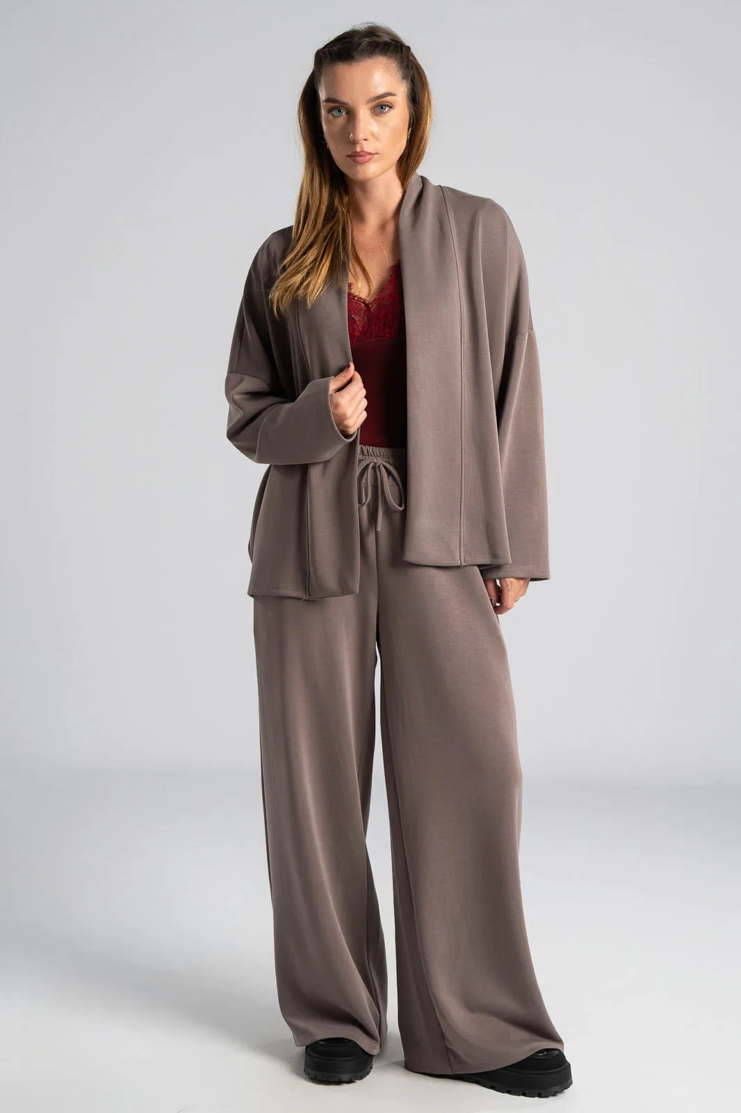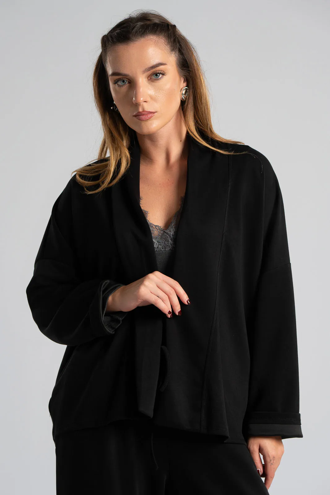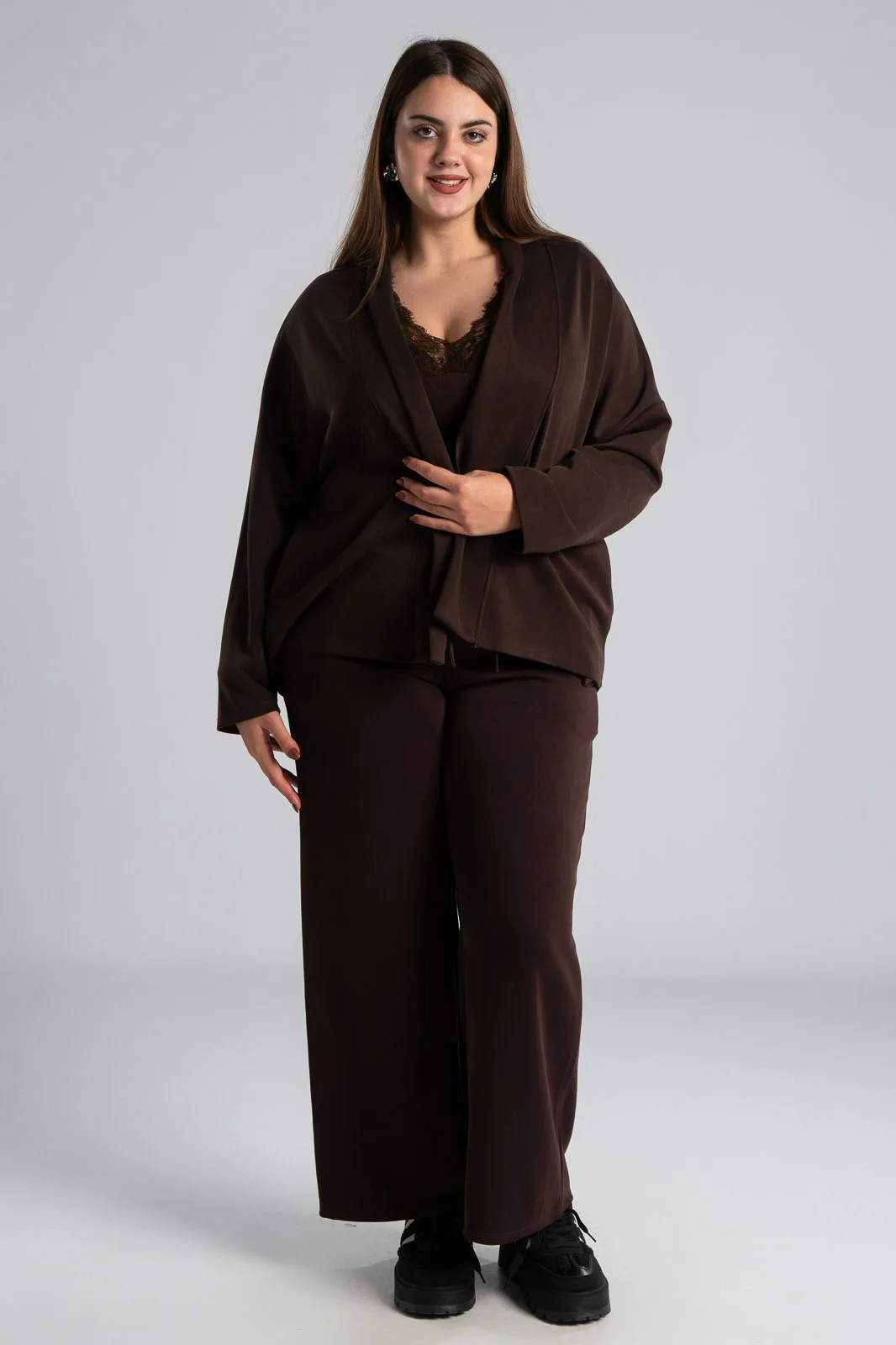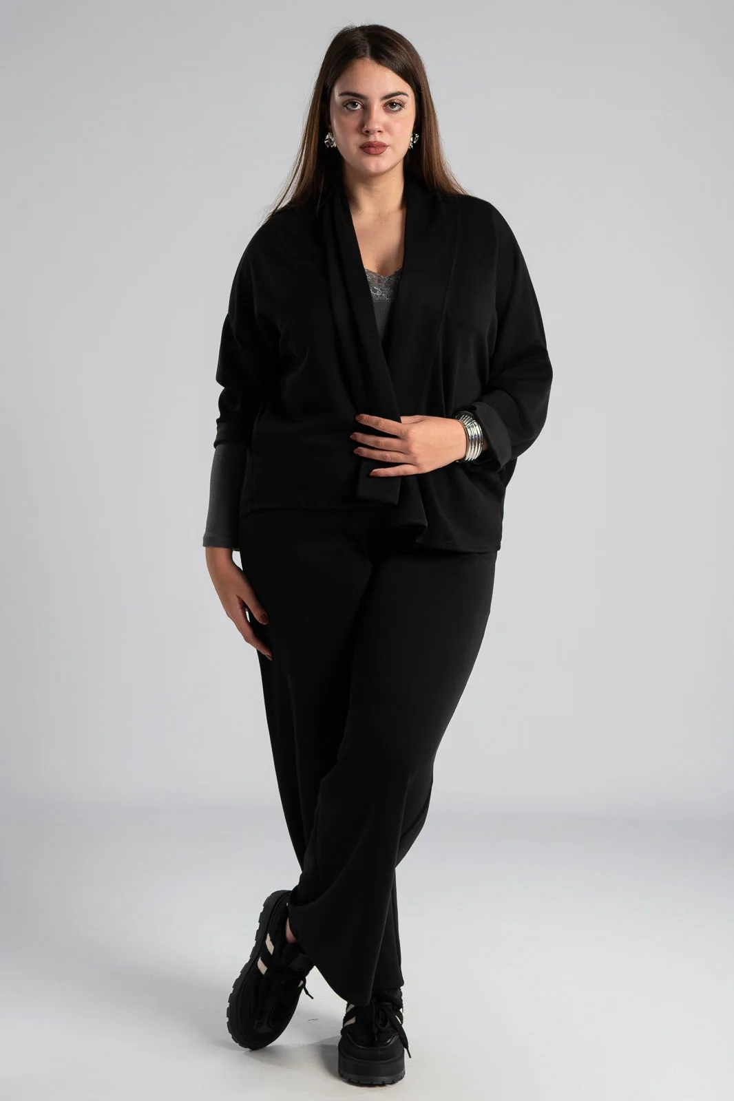 Σετ που αποτελείται από ζακέτα και παντελόνι. Η ζακέτα έχει μακριά μανίκια σε ύφος νυχτερίδας. Δεν διαθέτει κουμπί η φερμουάρ. Το παντελόνι έχει λαστιχο στη μέση και εσωτερικό κορδόνι για καλύτερη εφαρμογή. Στα πλαινά έχει τσέπες. Είναι σε ύφος φόρμας. Οι μετρήσεις του πίνακα είναι αντιπροσωπευτικές για κάθε κωδικό. 47% nylon, 46% polyester, 7% elastan.