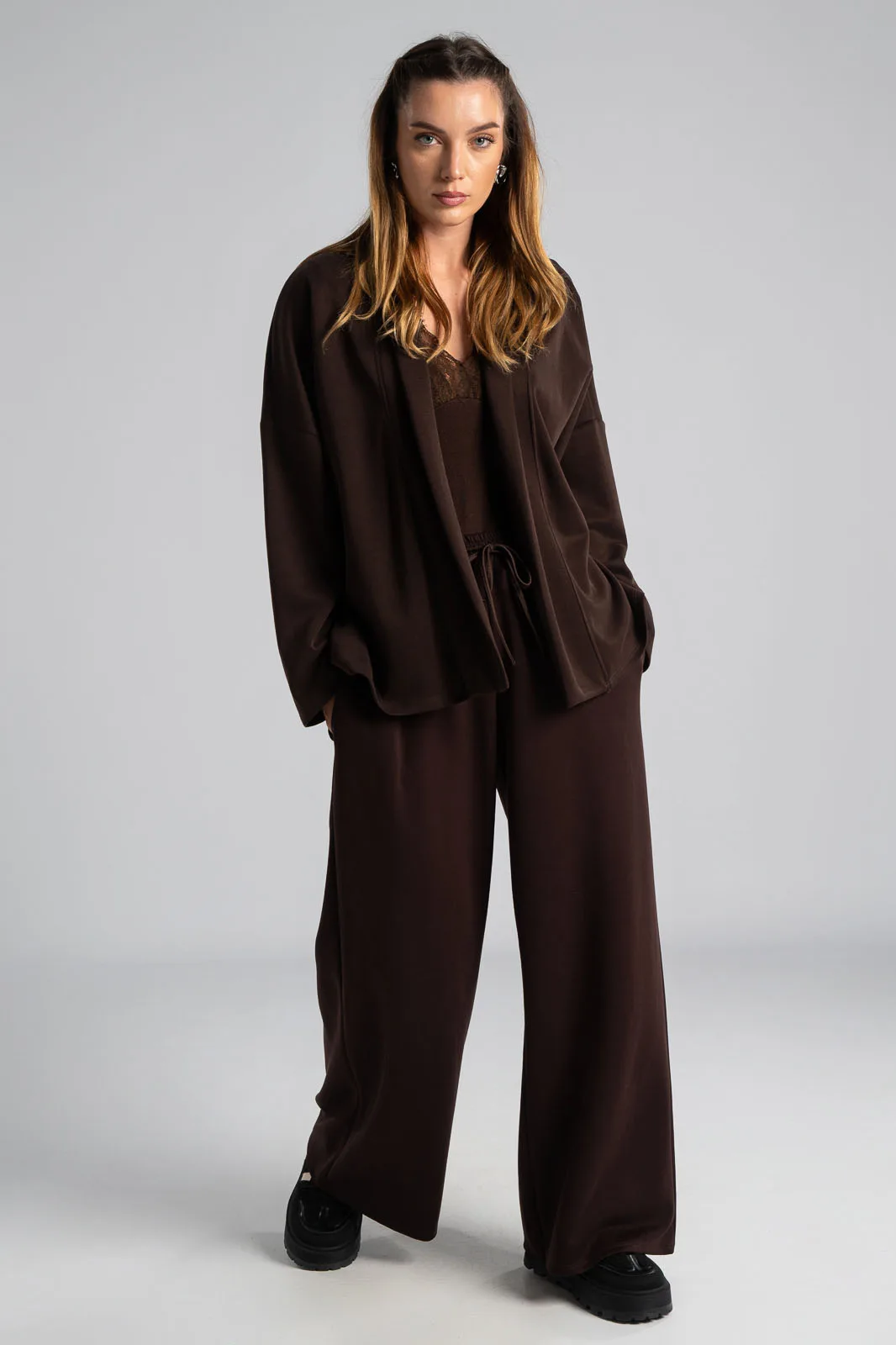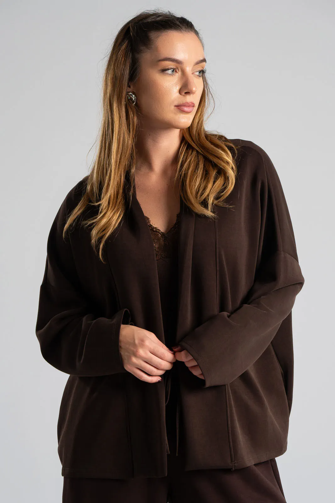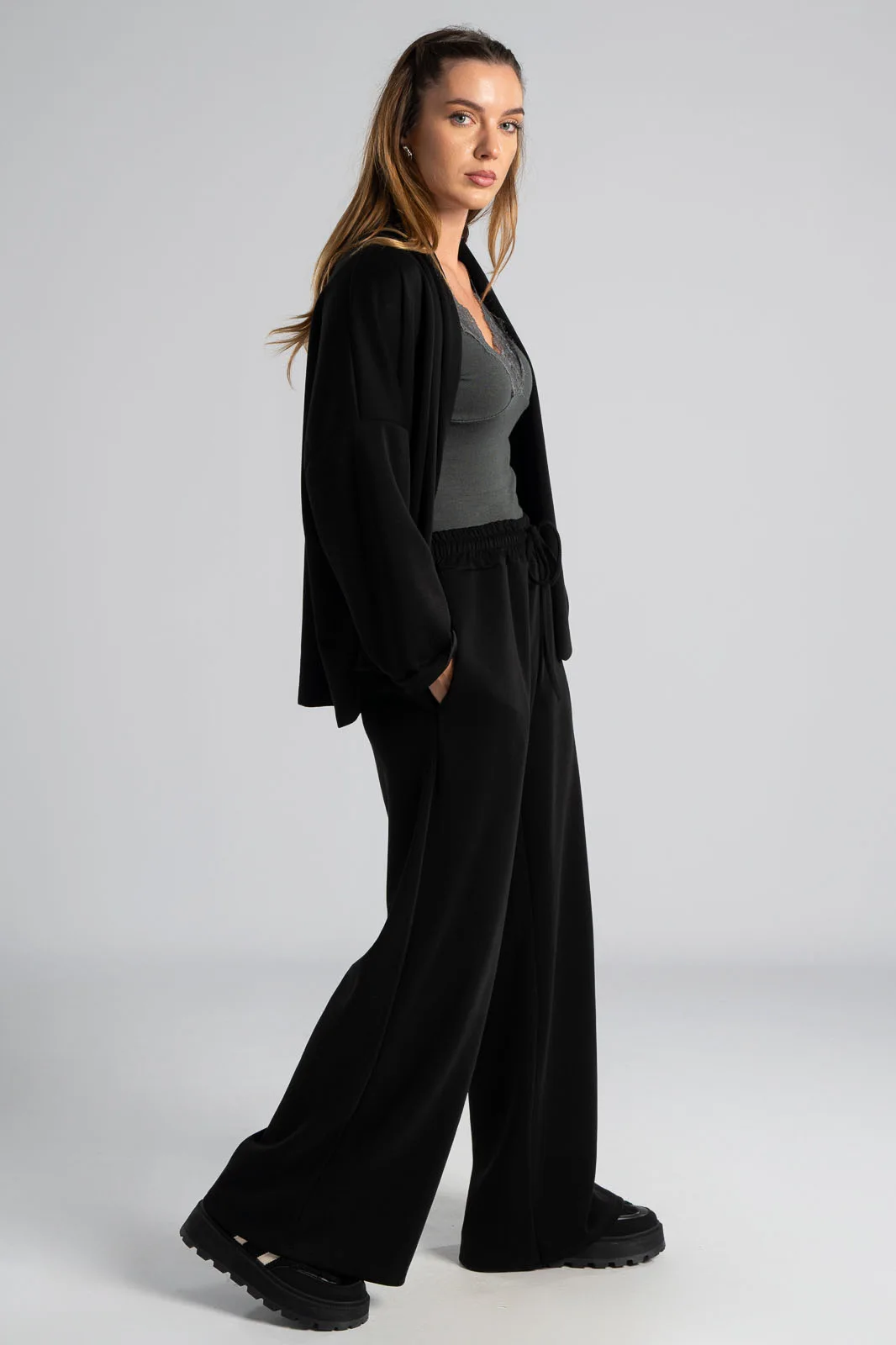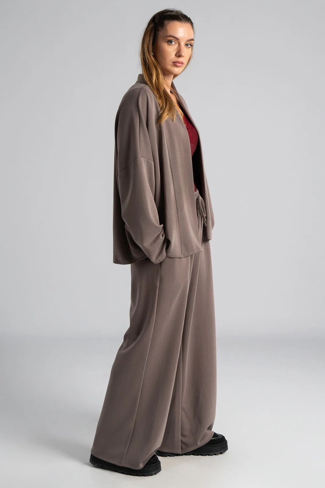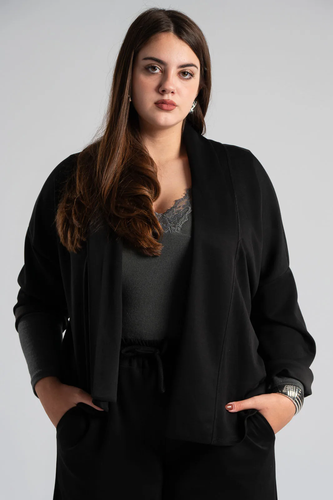 Σετ που αποτελείται από ζακέτα και παντελόνι. Η ζακέτα έχει μακριά μανίκια σε ύφος νυχτερίδας. Δεν διαθέτει κουμπί η φερμουάρ. Το παντελόνι έχει λαστιχο στη μέση και εσωτερικό κορδόνι για καλύτερη εφαρμογή. Στα πλαινά έχει τσέπες. Είναι σε ύφος φόρμας. Οι μετρήσεις του πίνακα είναι αντιπροσωπευτικές για κάθε κωδικό. 47% nylon, 46% polyester, 7% elastan.