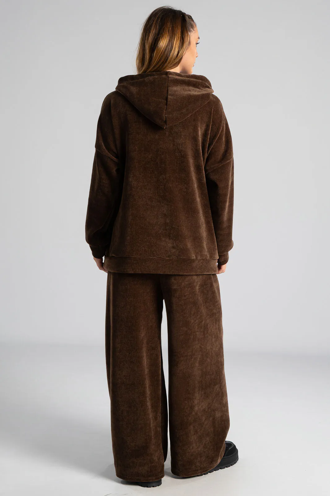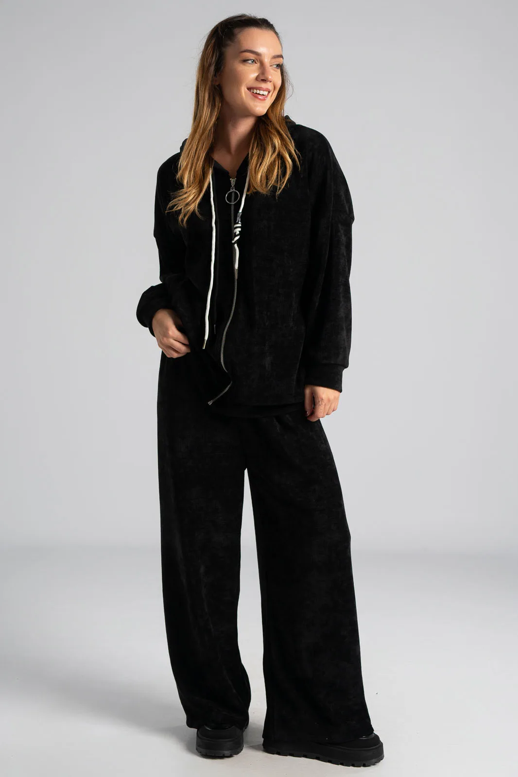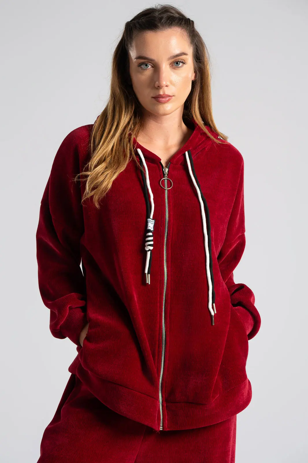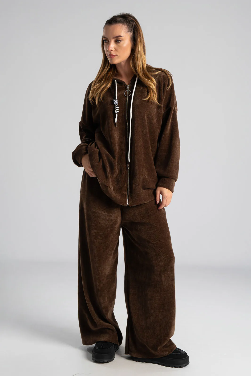 Σετ βαμβακερό το οποίο αποτελείται από παντελόνι και ζακέτα. Το ύφασμα του είναι βελούδο κοτλέ και είναι πολύ μαλακό. Η ζακέτα είναι σε κλασσική ίσια γραμμή. Κλείνει με φερμουάρ και έχει μακριά μανίκια. Διαθέτει κουκούλα και έχει κορδόνια σε λευκό και μαύρο χρώμα. Διαθέτει πλαϊνές τσέπες. Το παντελόνι έχει λάστιχο στη μέση περιμετρικά για καλύτερη εφαρμογή. Είναι σε ίσια γραμμή και δε διαθέτει τσέπες. Οι μετρήσεις του πίνακα είναι αντιπροσωπευτικές για κάθε κωδικό. 95% cotton, 5% elastan.