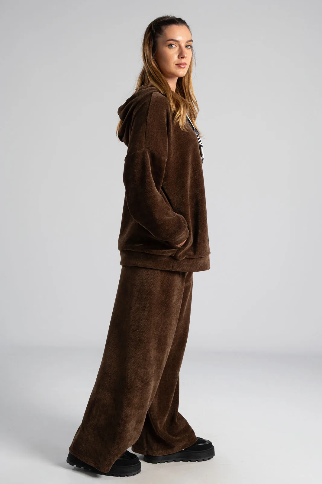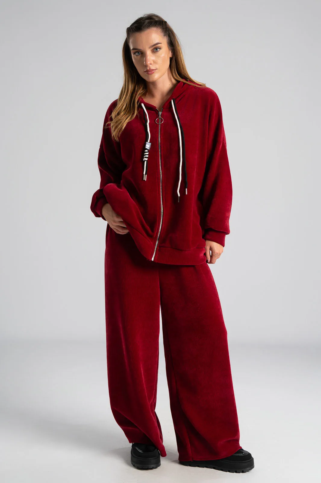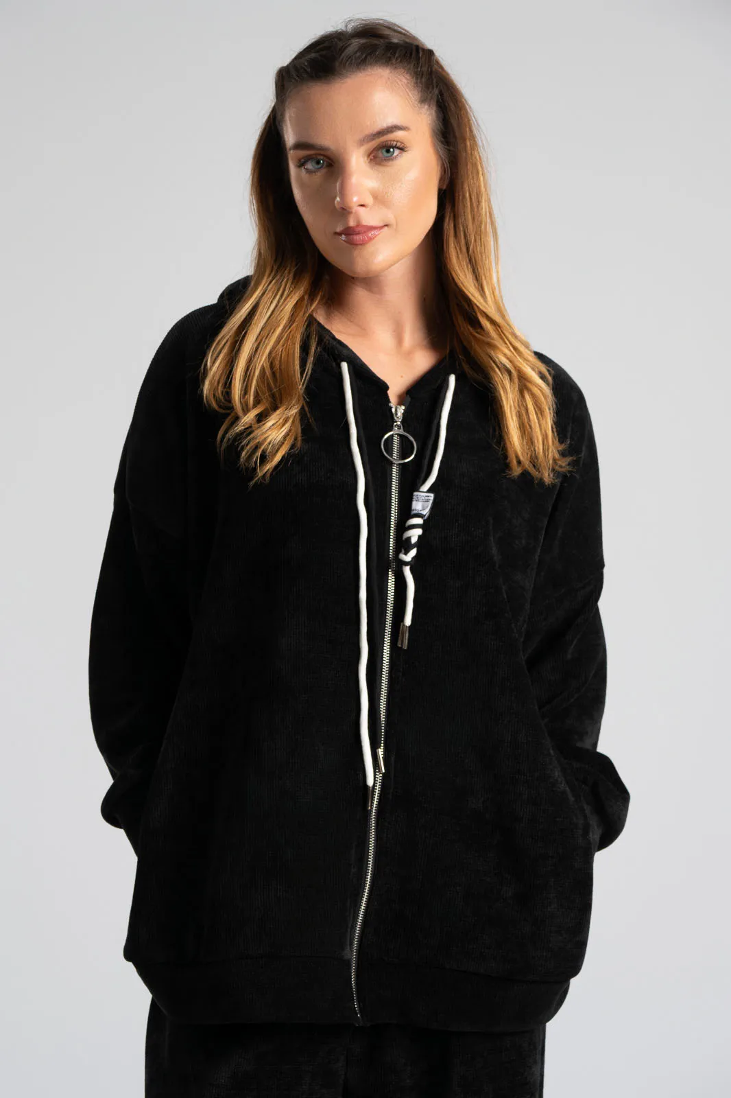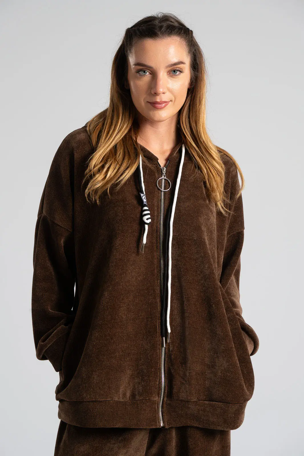 Σετ βαμβακερό το οποίο αποτελείται από παντελόνι και ζακέτα. Το ύφασμα του είναι βελούδο κοτλέ και είναι πολύ μαλακό. Η ζακέτα είναι σε κλασσική ίσια γραμμή. Κλείνει με φερμουάρ και έχει μακριά μανίκια. Διαθέτει κουκούλα και έχει κορδόνια σε λευκό και μαύρο χρώμα. Διαθέτει πλαϊνές τσέπες. Το παντελόνι έχει λάστιχο στη μέση περιμετρικά για καλύτερη εφαρμογή. Είναι σε ίσια γραμμή και δε διαθέτει τσέπες. Οι μετρήσεις του πίνακα είναι αντιπροσωπευτικές για κάθε κωδικό. 95% cotton, 5% elastan.