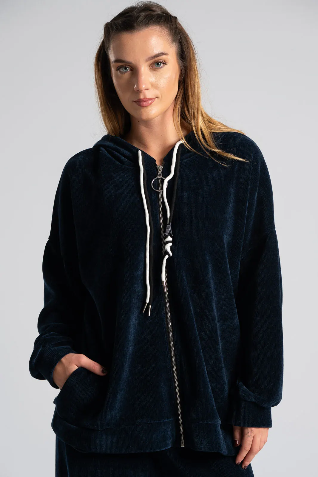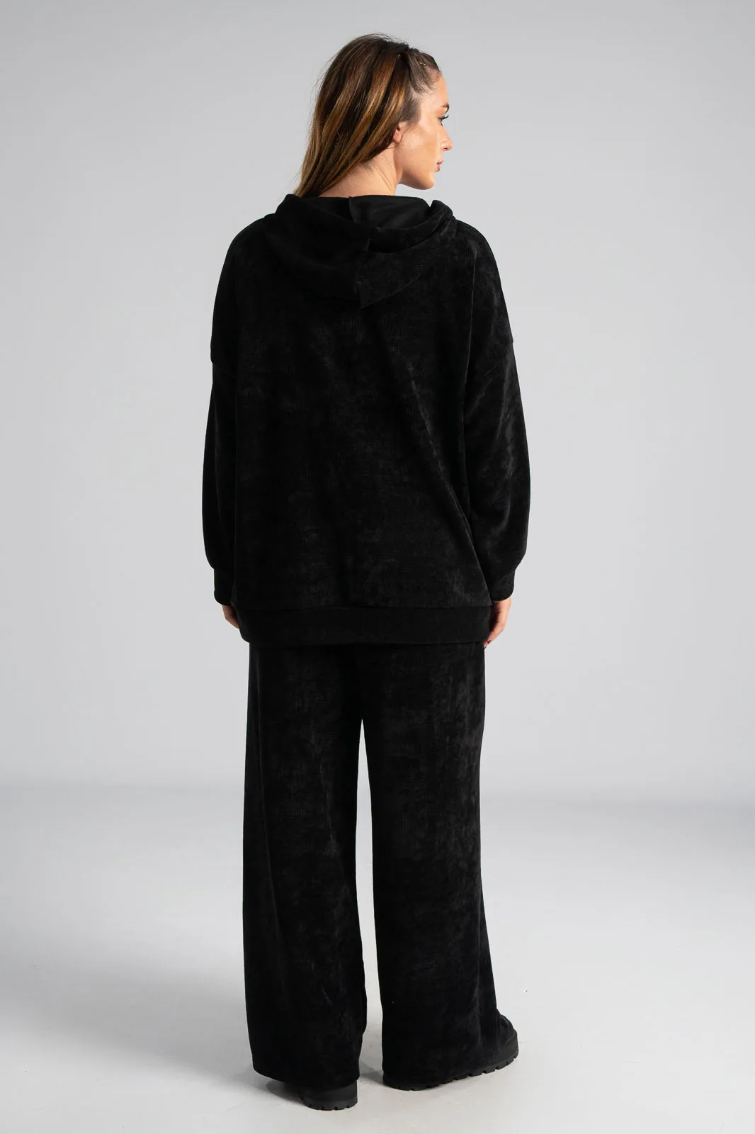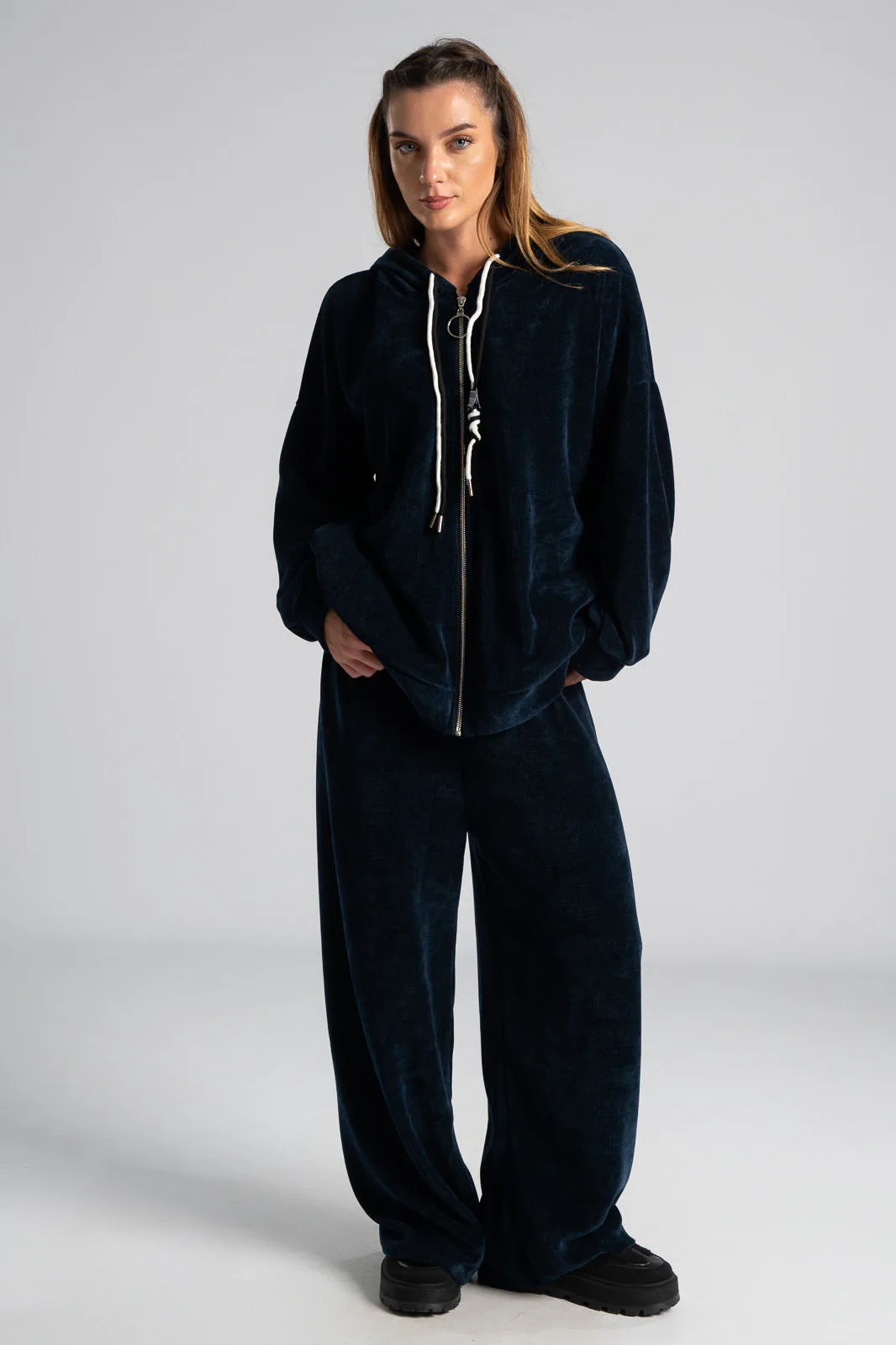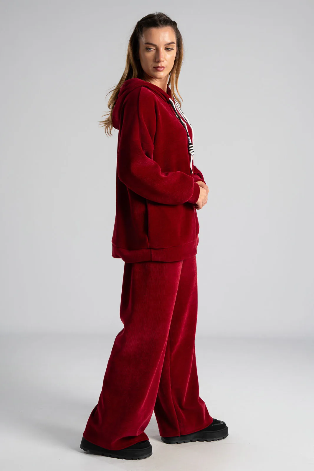 Σετ βαμβακερό το οποίο αποτελείται από παντελόνι και ζακέτα. Το ύφασμα του είναι βελούδο κοτλέ και είναι πολύ μαλακό. Η ζακέτα είναι σε κλασσική ίσια γραμμή. Κλείνει με φερμουάρ και έχει μακριά μανίκια. Διαθέτει κουκούλα και έχει κορδόνια σε λευκό και μαύρο χρώμα. Διαθέτει πλαϊνές τσέπες. Το παντελόνι έχει λάστιχο στη μέση περιμετρικά για καλύτερη εφαρμογή. Είναι σε ίσια γραμμή και δε διαθέτει τσέπες. Οι μετρήσεις του πίνακα είναι αντιπροσωπευτικές για κάθε κωδικό. 95% cotton, 5% elastan.