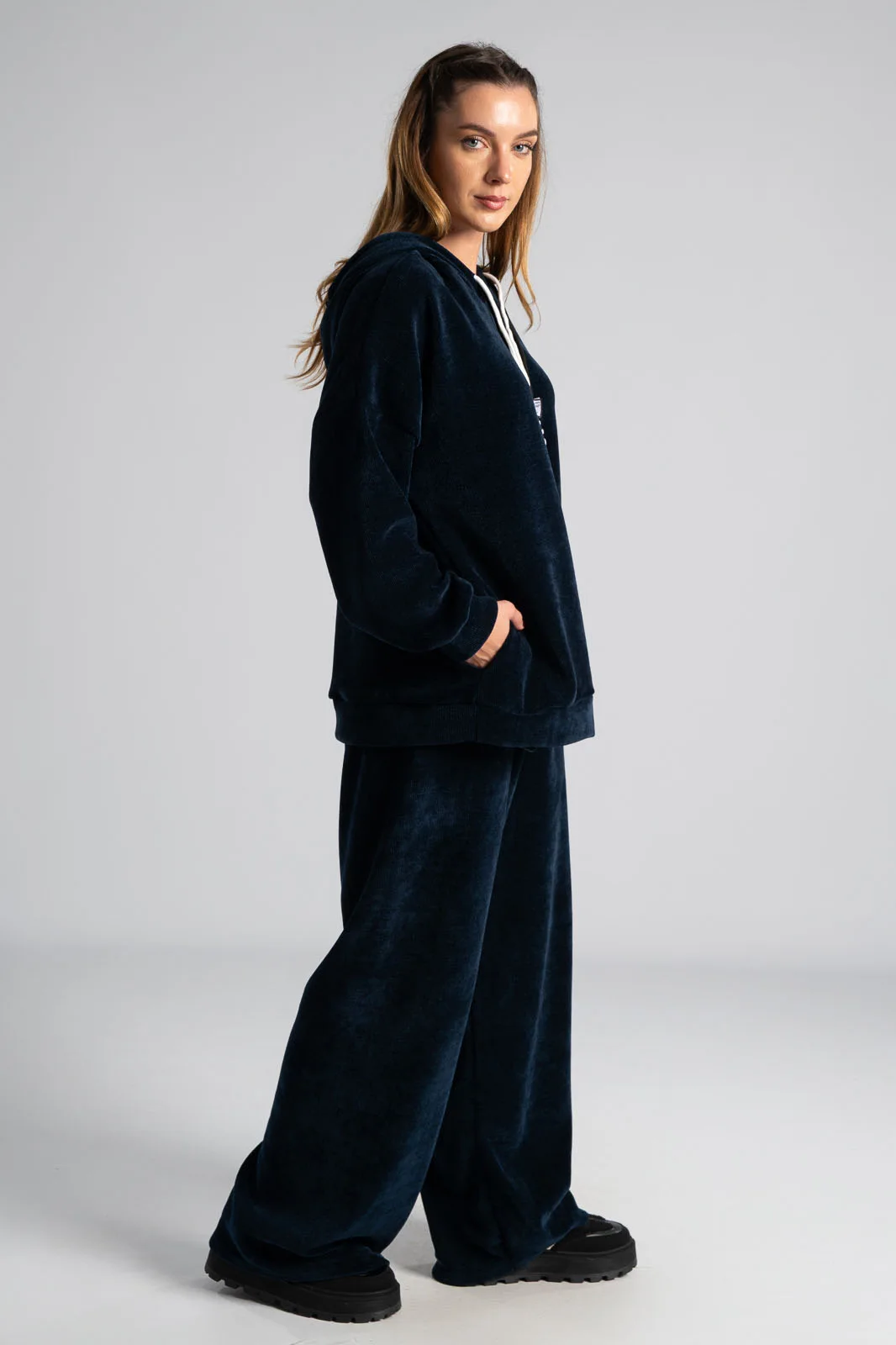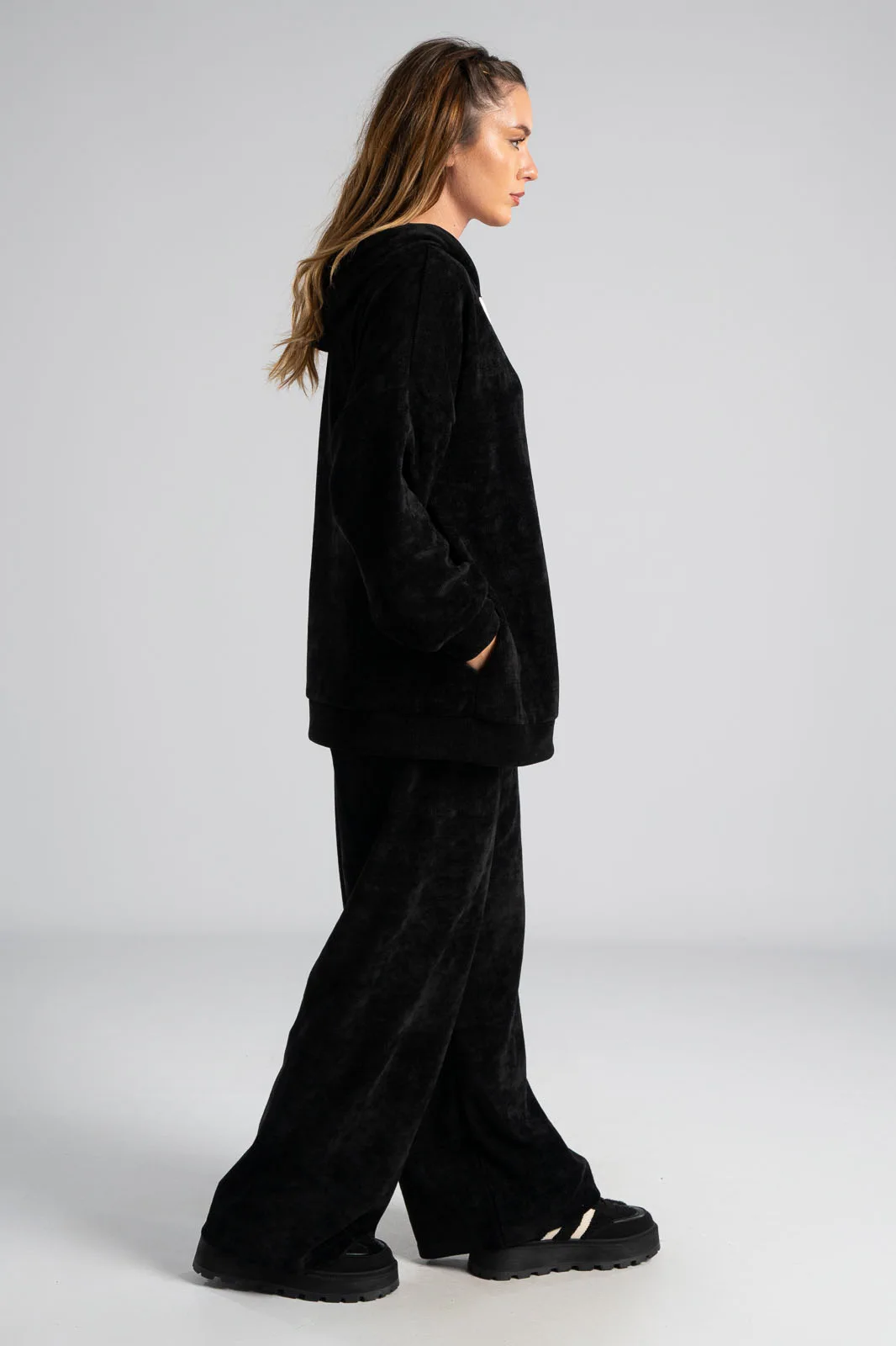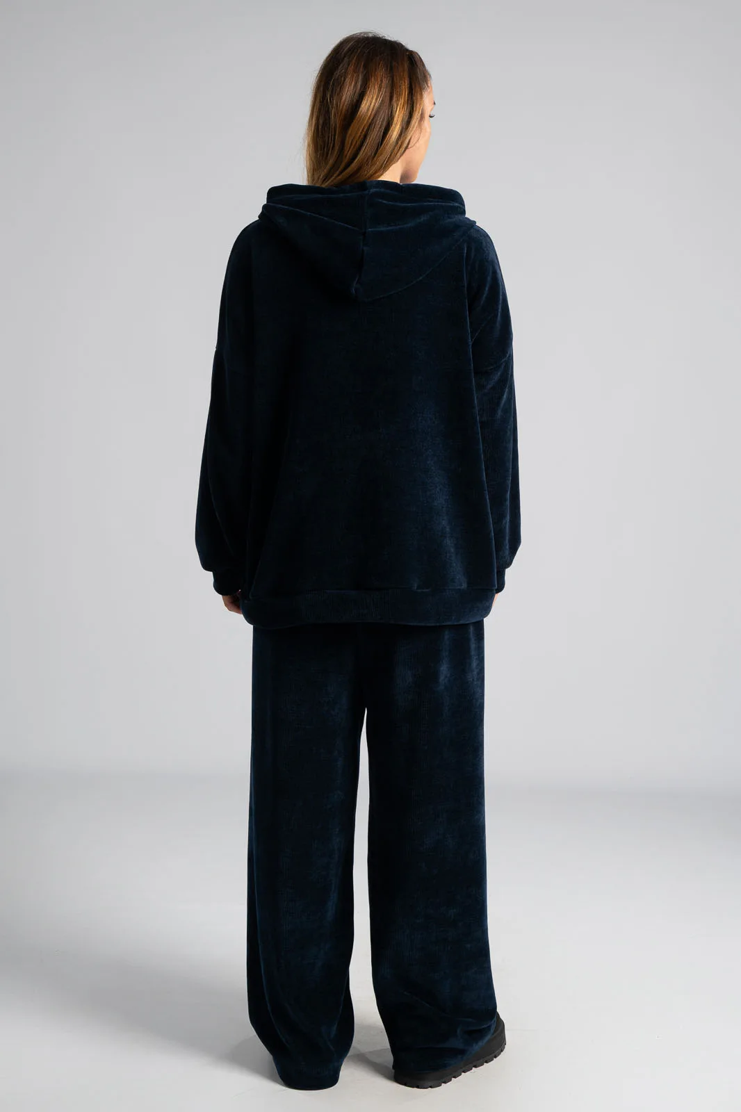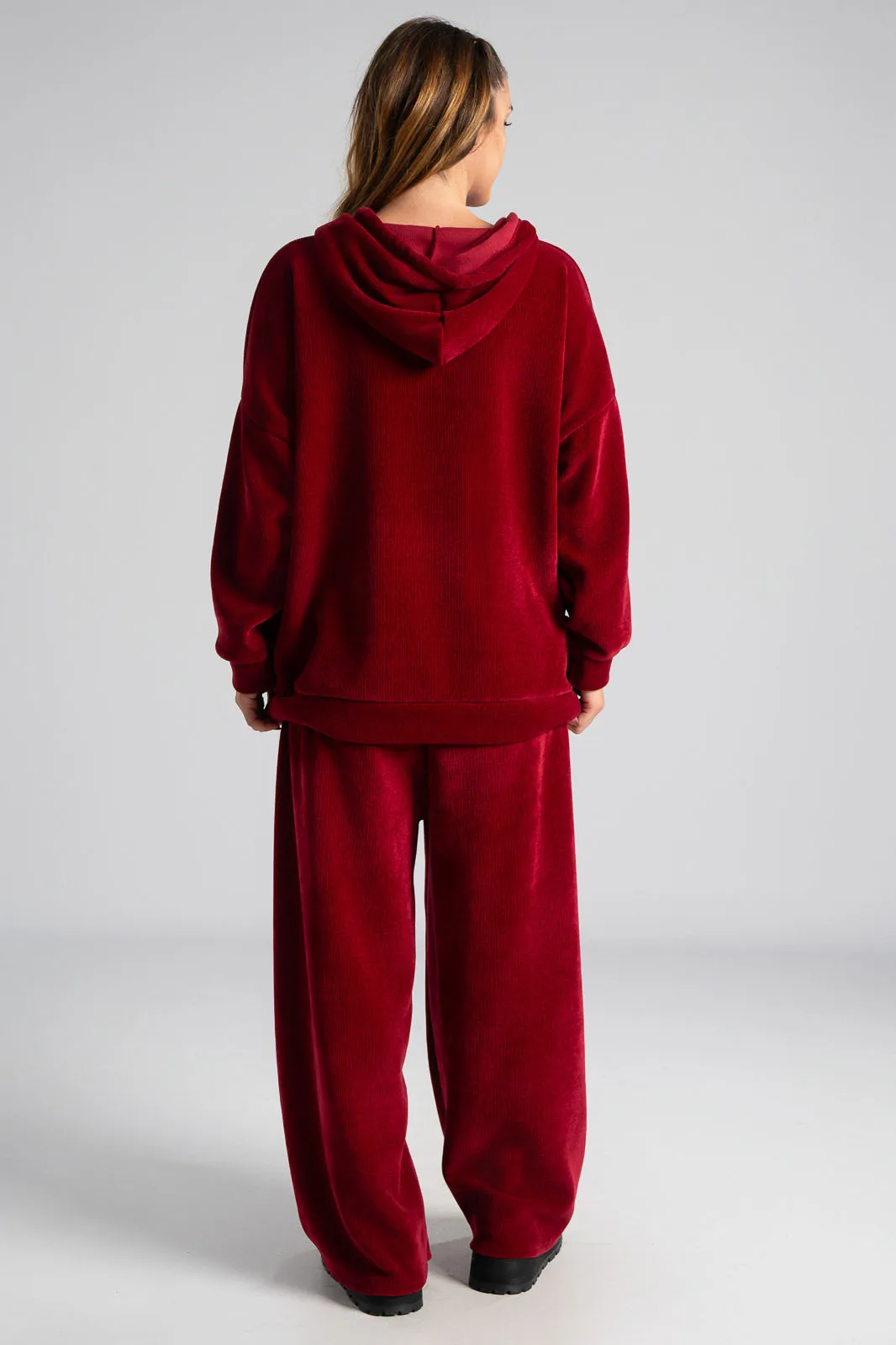 Σετ βαμβακερό το οποίο αποτελείται από παντελόνι και ζακέτα. Το ύφασμα του είναι βελούδο κοτλέ και είναι πολύ μαλακό. Η ζακέτα είναι σε κλασσική ίσια γραμμή. Κλείνει με φερμουάρ και έχει μακριά μανίκια. Διαθέτει κουκούλα και έχει κορδόνια σε λευκό και μαύρο χρώμα. Διαθέτει πλαϊνές τσέπες. Το παντελόνι έχει λάστιχο στη μέση περιμετρικά για καλύτερη εφαρμογή. Είναι σε ίσια γραμμή και δε διαθέτει τσέπες. Οι μετρήσεις του πίνακα είναι αντιπροσωπευτικές για κάθε κωδικό. 95% cotton, 5% elastan.
