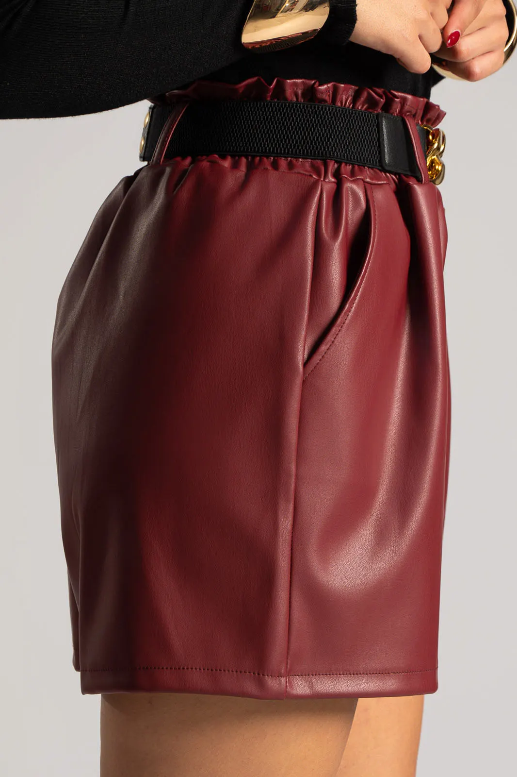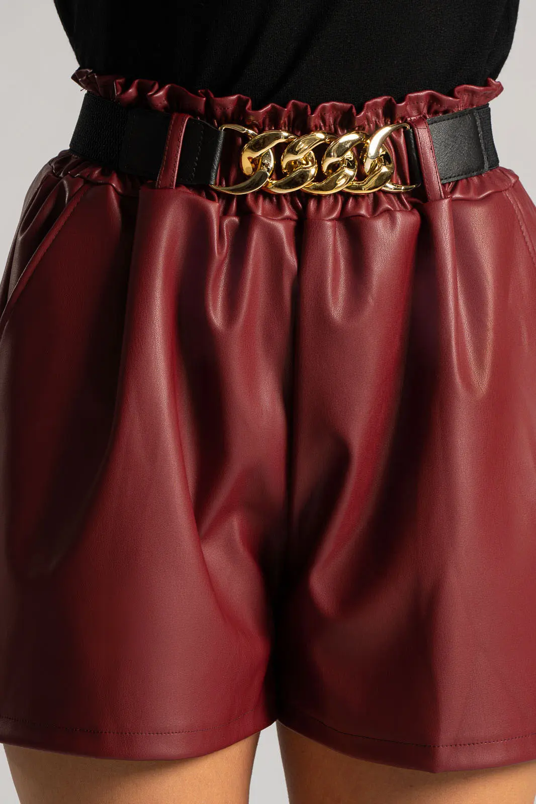 Σορτς από εξαιρετικής ποιότητας δερματίνη. Στη μέση διαθέτει λάστιχο. Έχει δική του ζώνη ελαστική, στο μπροστινό μέρος έχει μεταλλικό στοιχείο. Στα πλαινά έχει τσέπες. Οι μετρήσεις του πίνακα είναι αντιπροσωπευτικές για κάθε προϊόν. 60% poliurethane, 40% polyester.