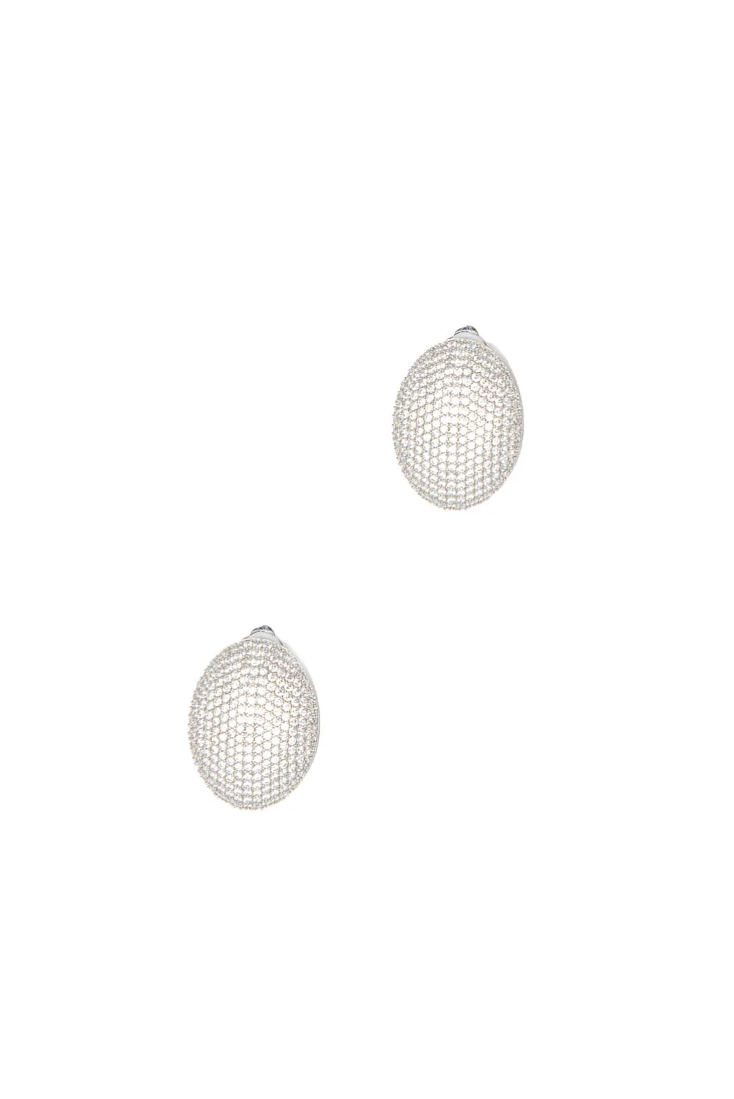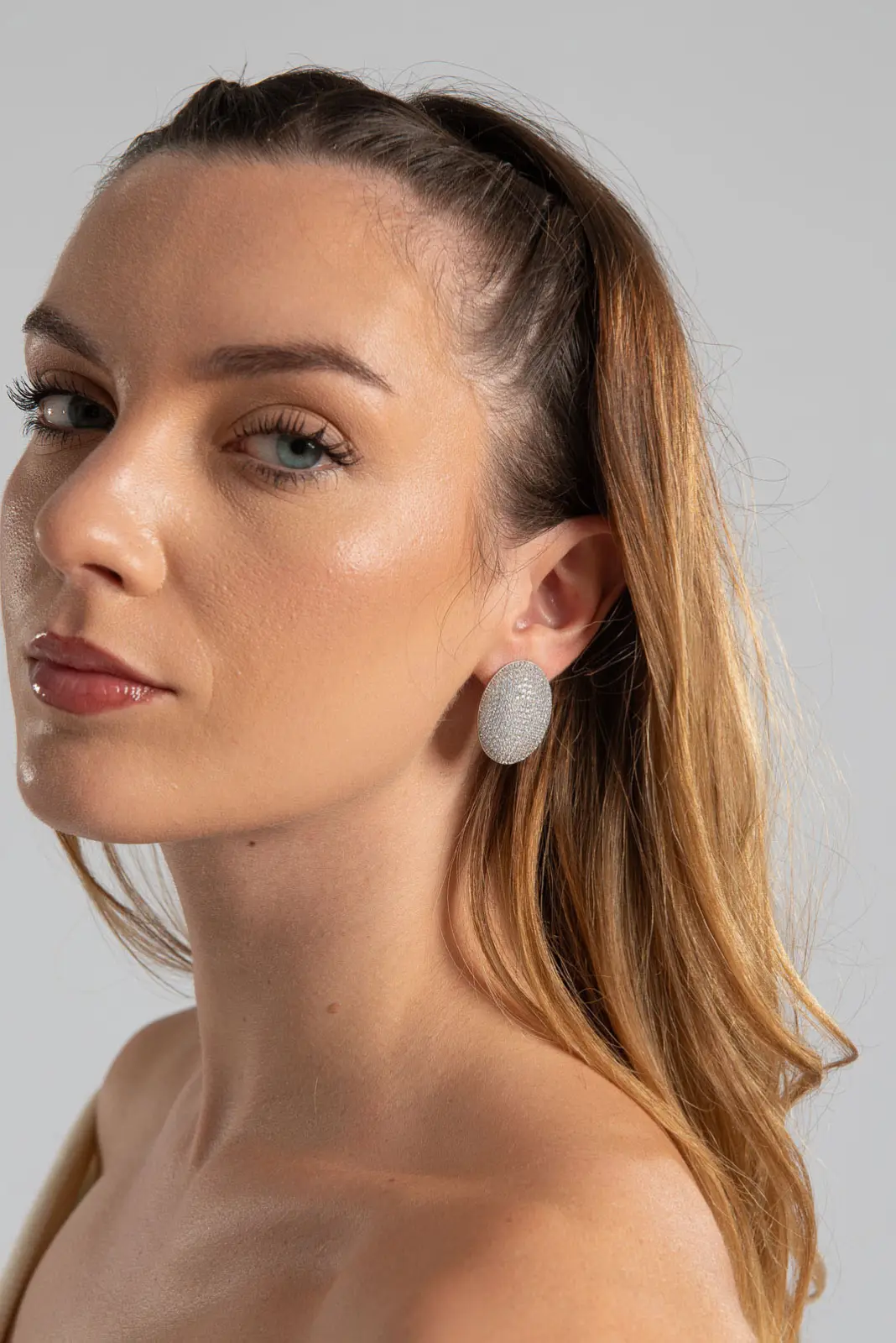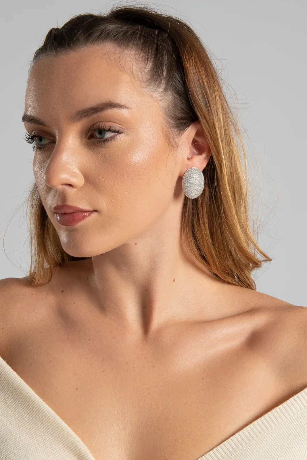 Σκουλαρίκια σε οβάλ σχέδιο. Είναι διακοσμημένο σε όλη την επιφάνεια με στρας. Κλείνουν με κλιπ στο αυτί.