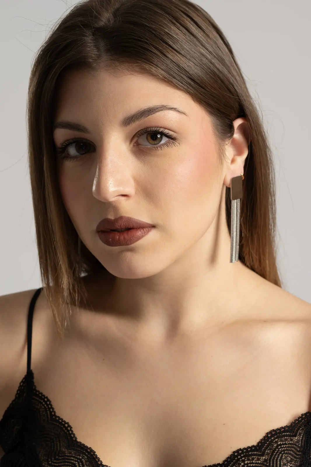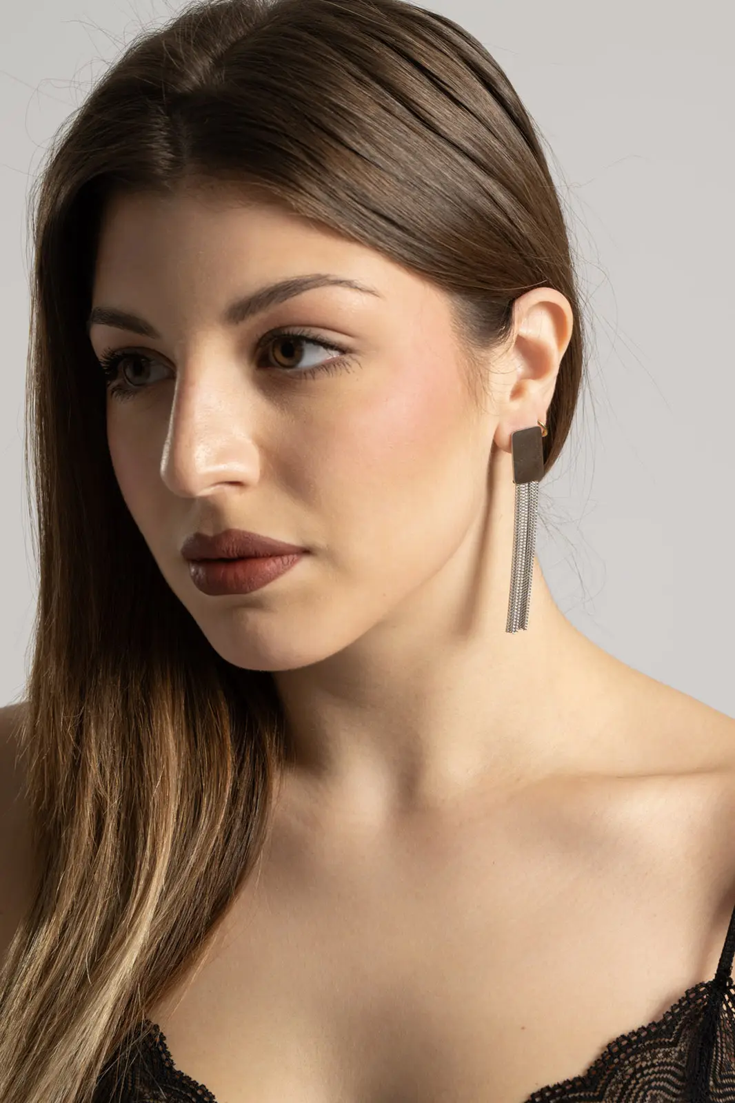 Earrings with a rectangular snap-on base that hangs from the ear, from which thin metal chains hang. They are made of steel.