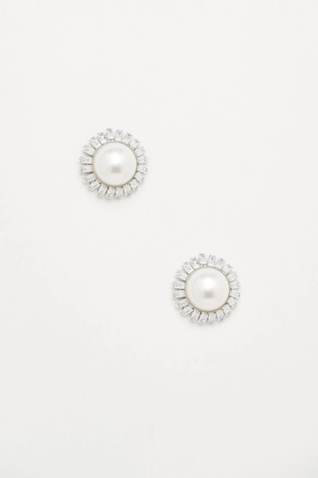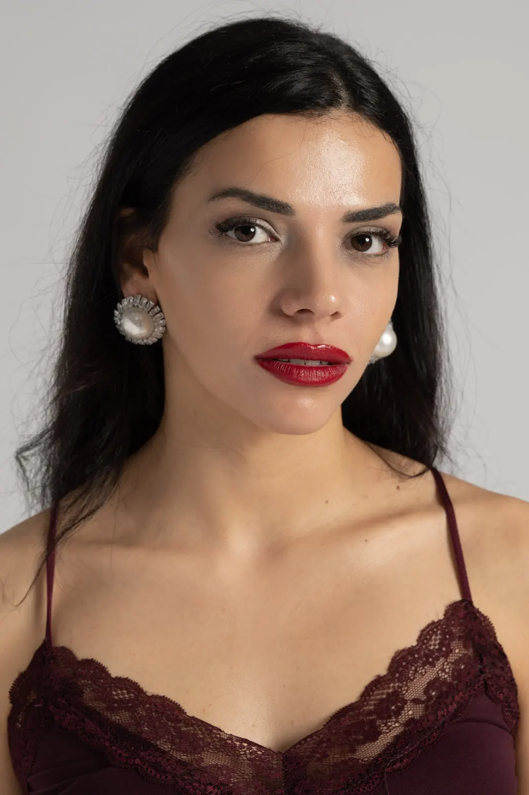 Σκουλαρίκια με στρογγυλό σχήμα. Διαθέτουν μεγάλη πέρλα στο κέντρο και περιμετρικά έχει διακοσμητικά στρας. Είναι κουμπωτά στο αυτί.