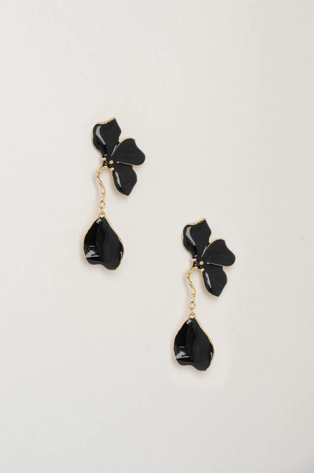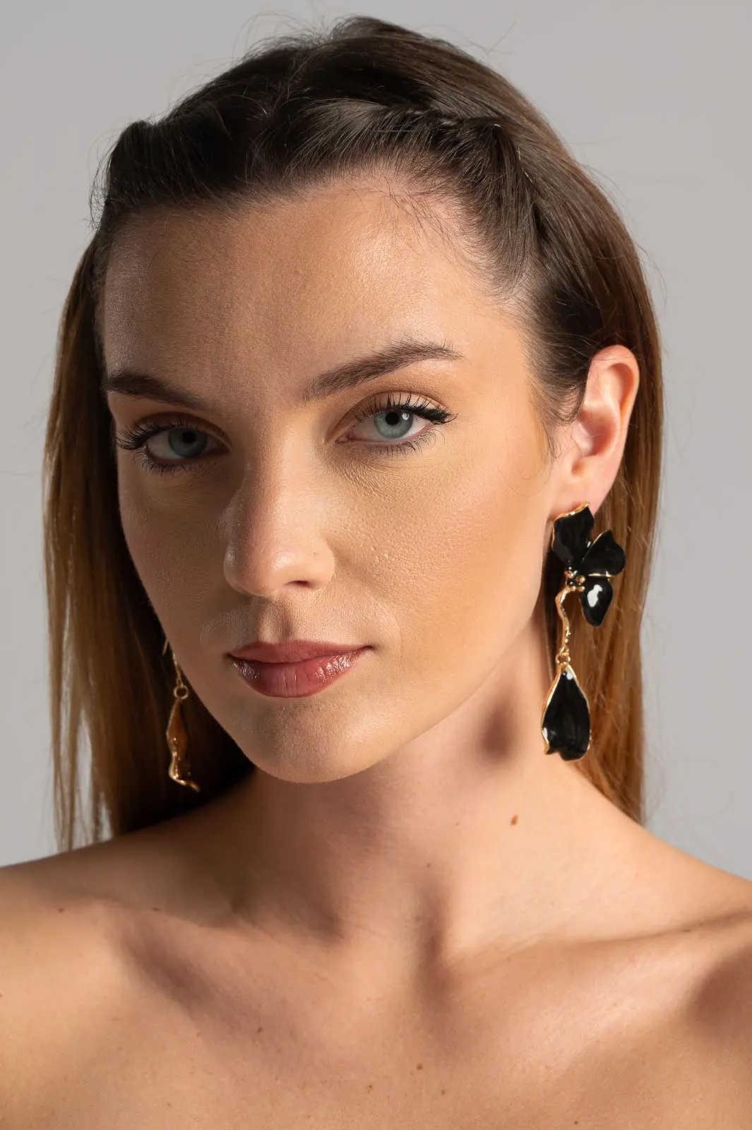 Metal drop earrings. Consisting of flower petals with a metal drop element. They are stud earrings.