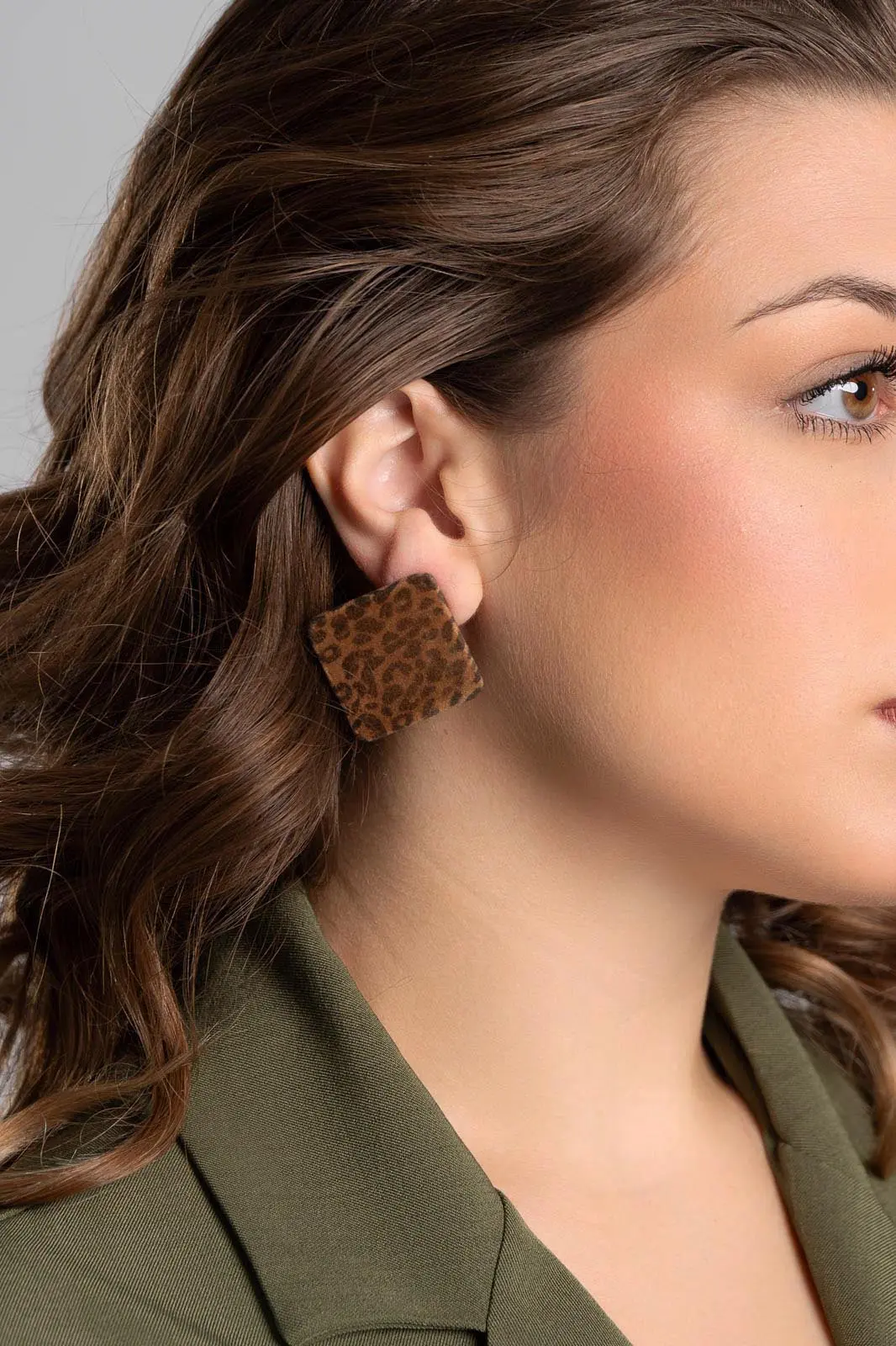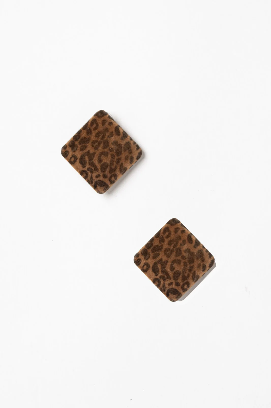 Earrings that are square-shaped and clip onto the ear. They have a suede texture with a leopard pattern and clip onto the ear.