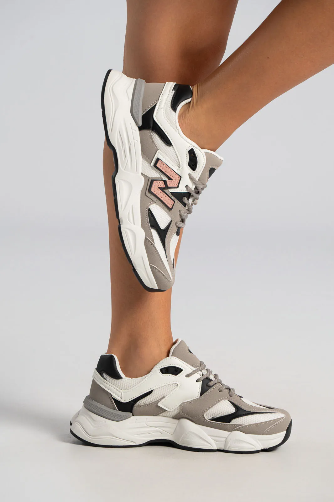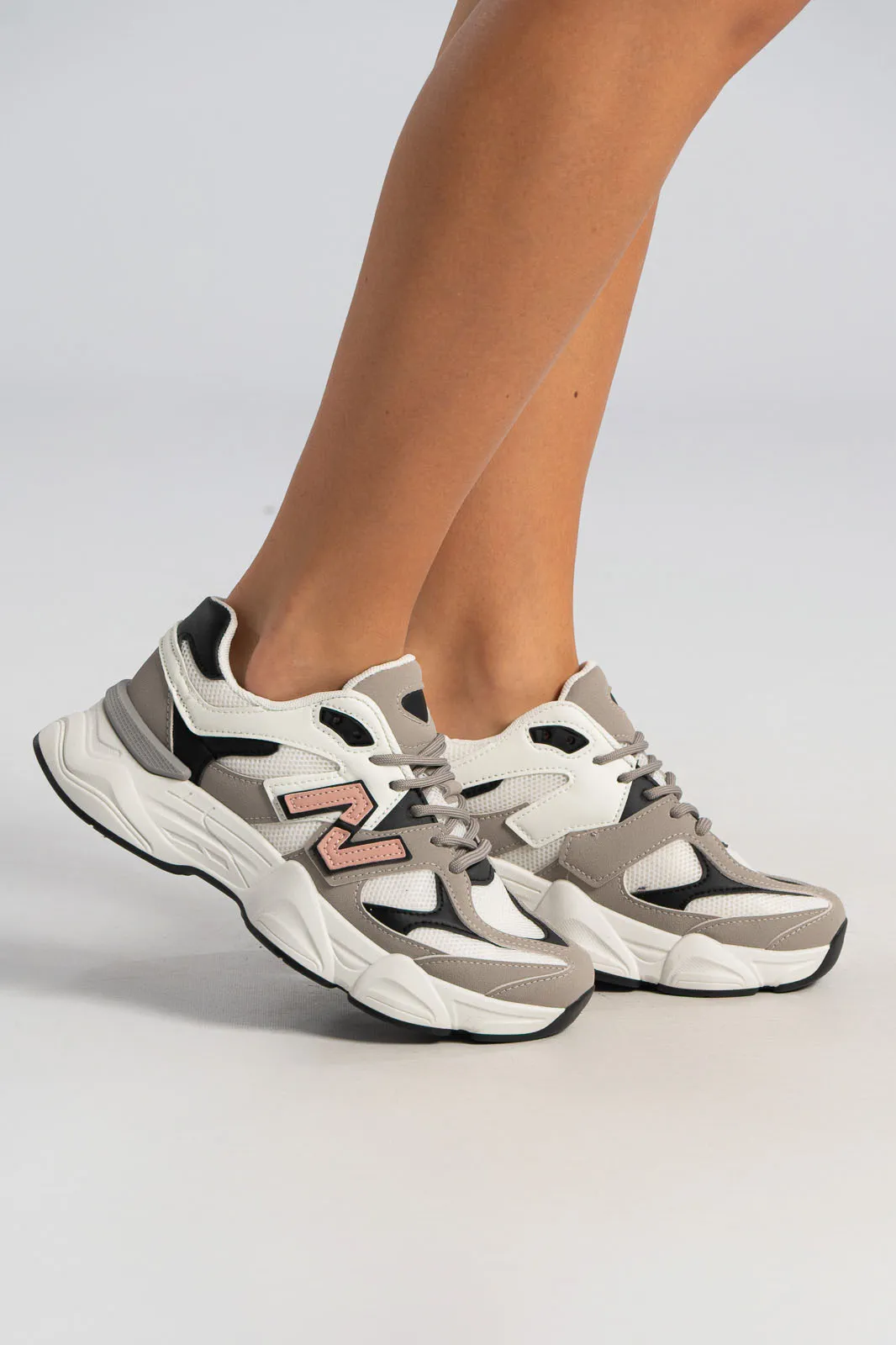 Sneakers με διαφορετικές υφές σε δερματίνη και ύφασμα. Στη μια πλευρά στο πλάι διαθέτει λογότυπο. Έχει τρακτερωτό πάτο και ύψος 2cm στο 4cm στο πίσω μέρος.