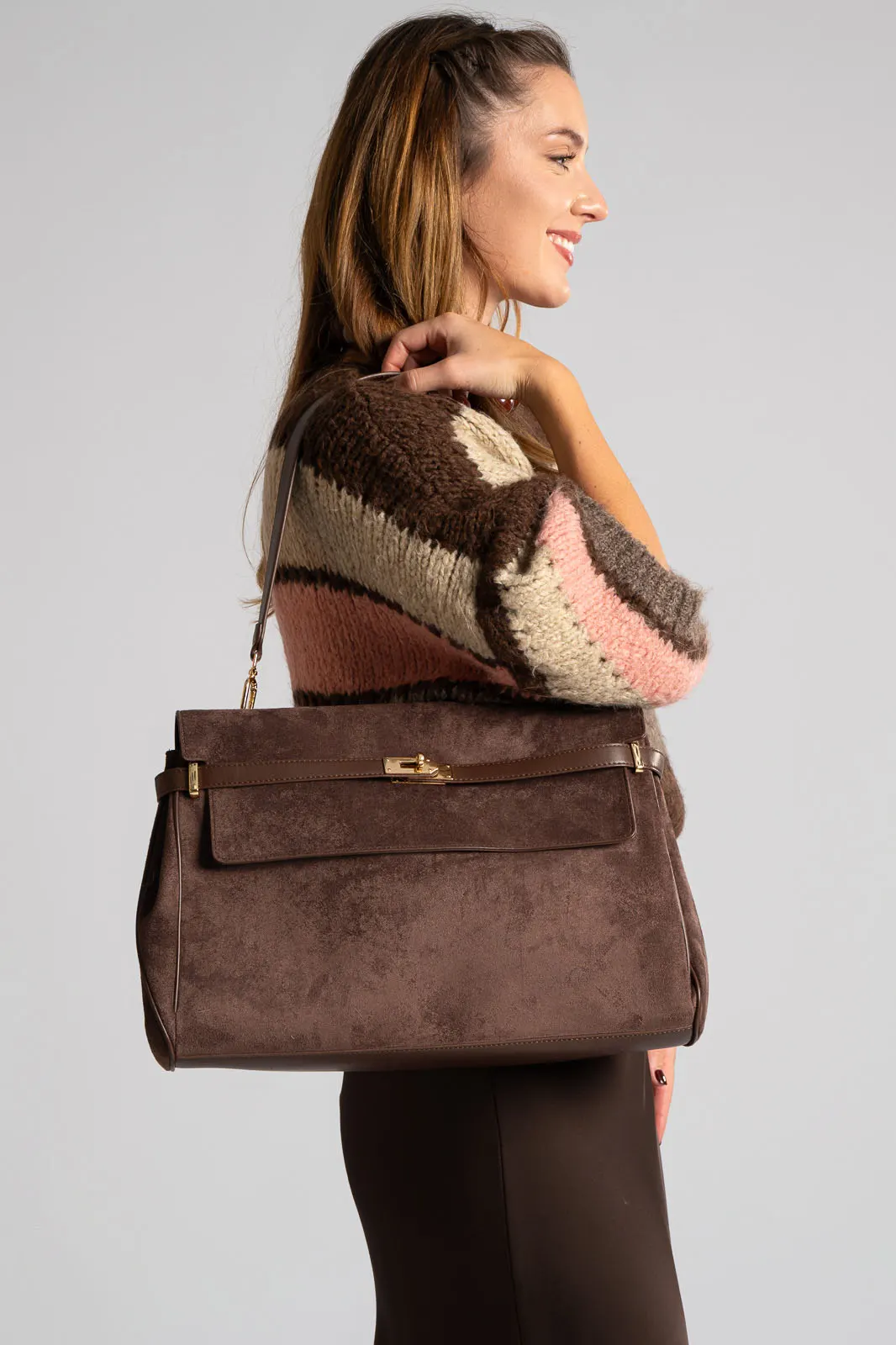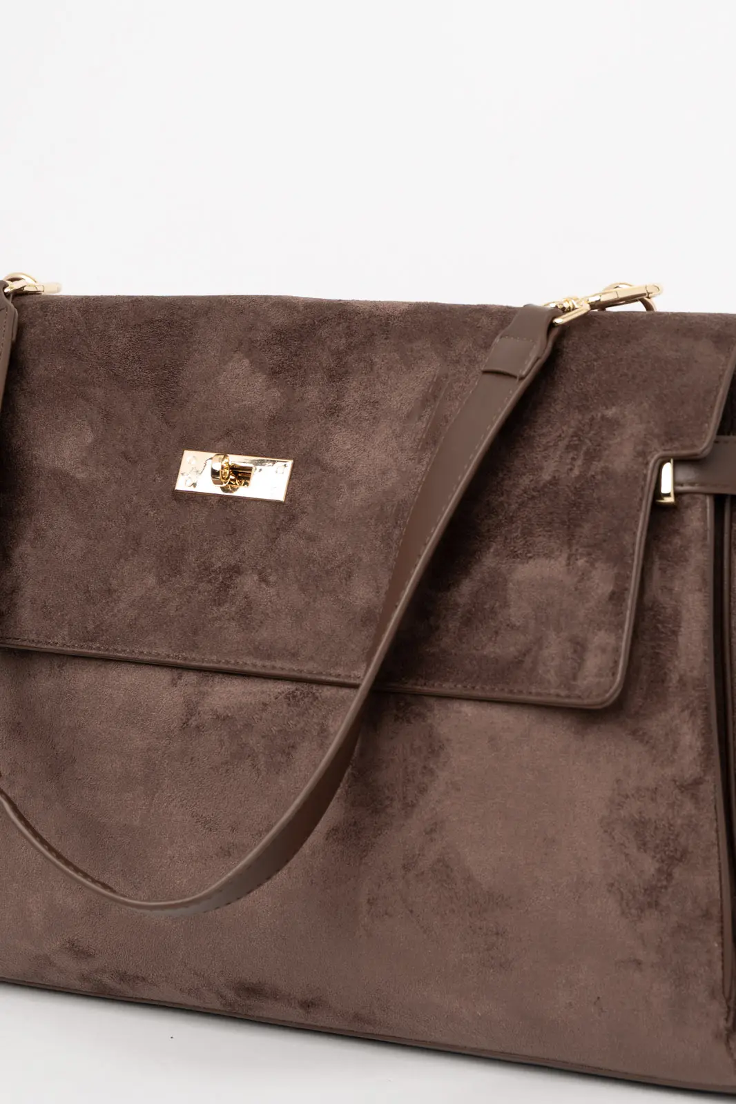 Τσάντα τύπου doctor bag. Είναι suede με δερματίνη λεπτομέρειες. Η κύρια θήκη κλείνει με κούμπωμα και λουράκια. Στα πλαϊνά κλείνει με κουμπί και εσωτερικά είναι χωρισμένη στη μέση. Είναι φοδραρισμένη και διαθέτει έξτρα θήκες. Διαθέτει αποσπώμενο σταθερό λουρί ώμου 54cm και χιαστί με μήκος 104cm. Είναι μια ιδανική επιλογή για να ξεχωρίσεις. Μέγεθος τσάντας: 41cm x 13cm x 41xcm.