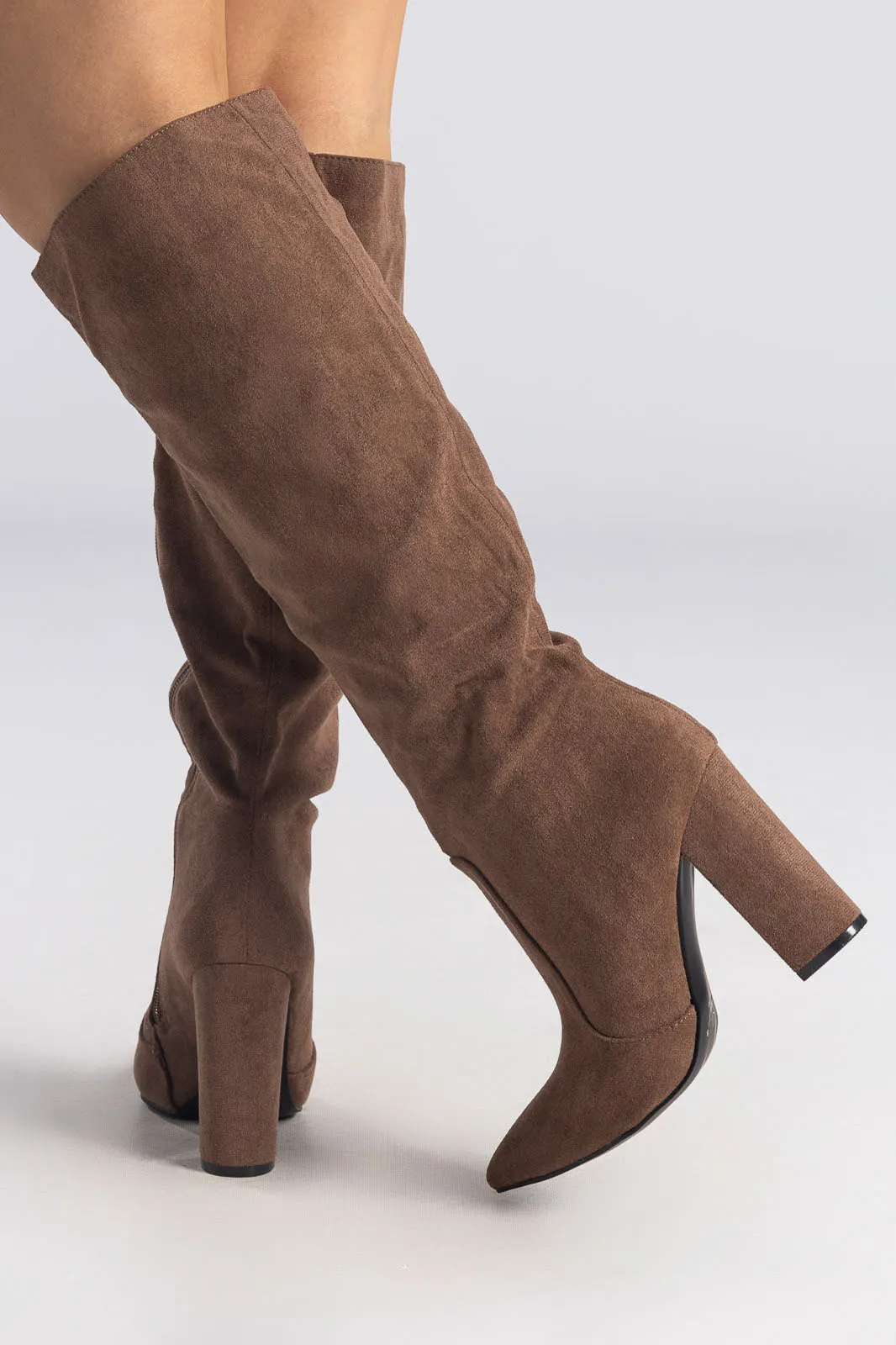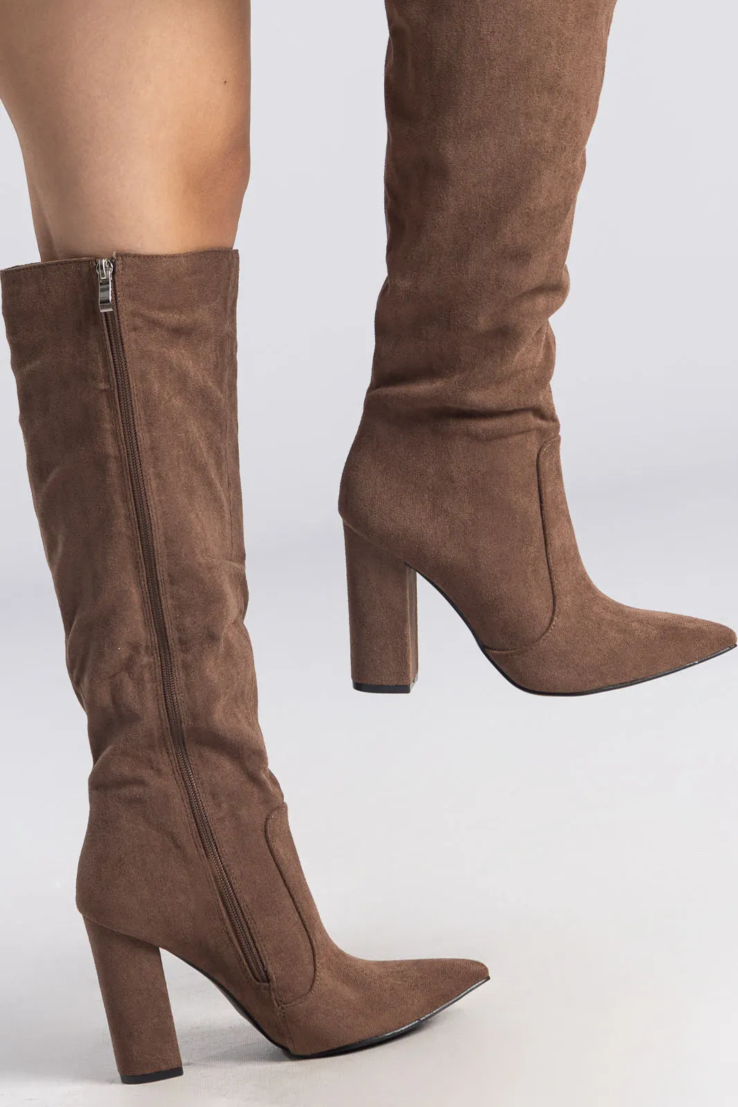Pointed suede boot. It has a full-length zipper on the side. It has a thick heel with a height of 10.5 cm. It is a feminine choice and ideal for any occasion.