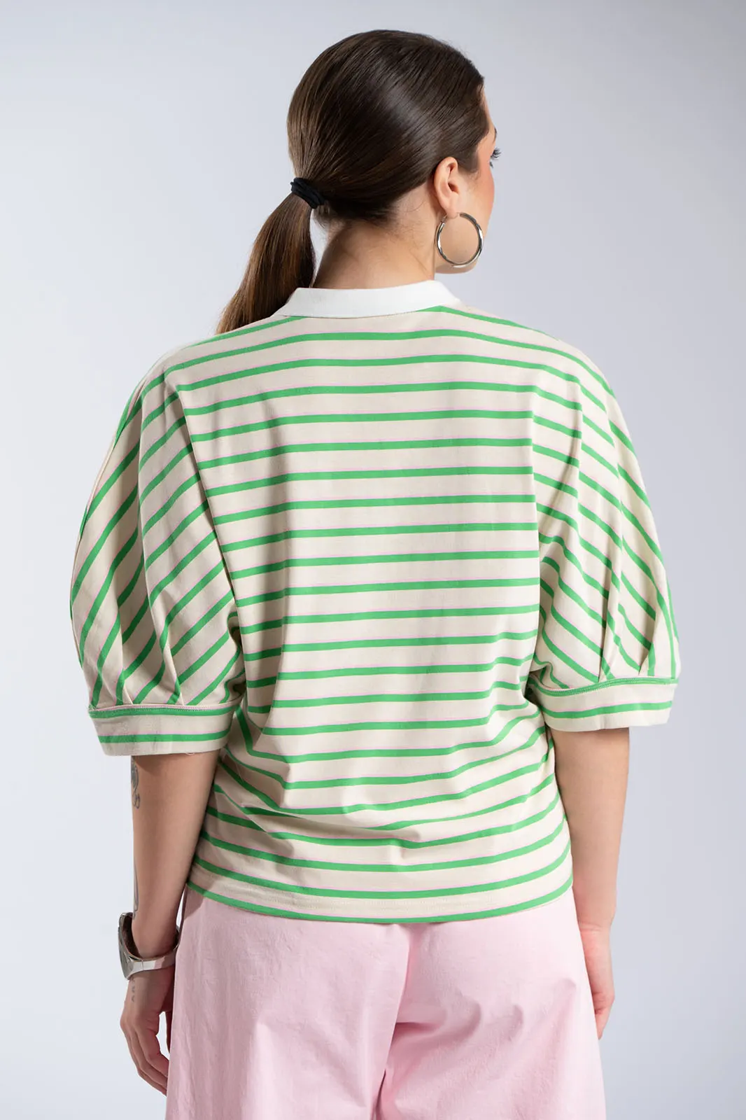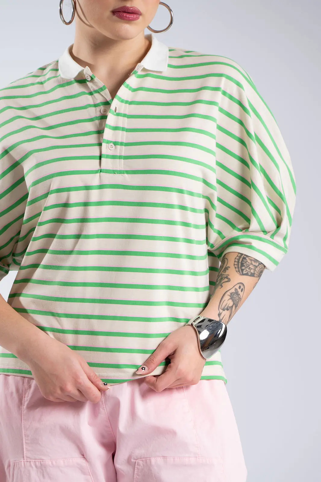 Stylish polo shirt with a striped design that gives it a timeless and modern character. The collar, combined with the small opening and buttons at the front, add a more refined touch to the overall look, while the comfortable fit makes it particularly easy to wear. The striped pattern gives it a casual yet elegant look, making the shirt ideal for everyday wear. The short sleeves and relaxed fit offer comfort and ease of movement, while the design can be worn from morning to night in different combinations. It is a versatile piece that combines comfort and style, ideal for a modern everyday look.