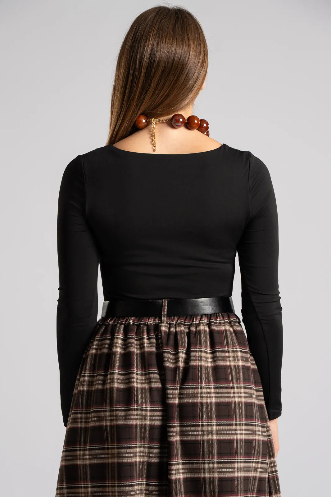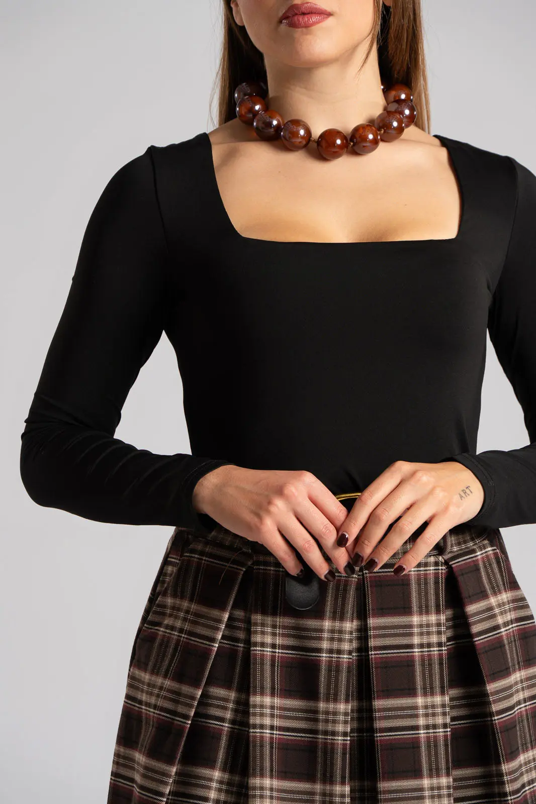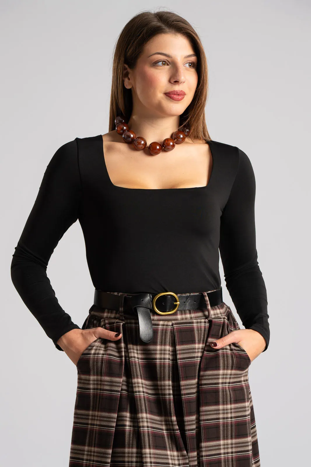 Μπλούζα με τετραγωνισμένη λαιμόκοψη. Διαθέτει μακριά μανίκια και έχει ελαστικό ύφασμα. Είναι μια ιδανική επιλογή για όλες τις ώρες της ημέρας και μπορεί να συνδυαστεί με τα πάντα. Οι μετρήσεις του πίνακα είναι αντιπροσωπευτικές για κάθε προϊόν. 65% viscose, 30% polyester, 5% elastan.