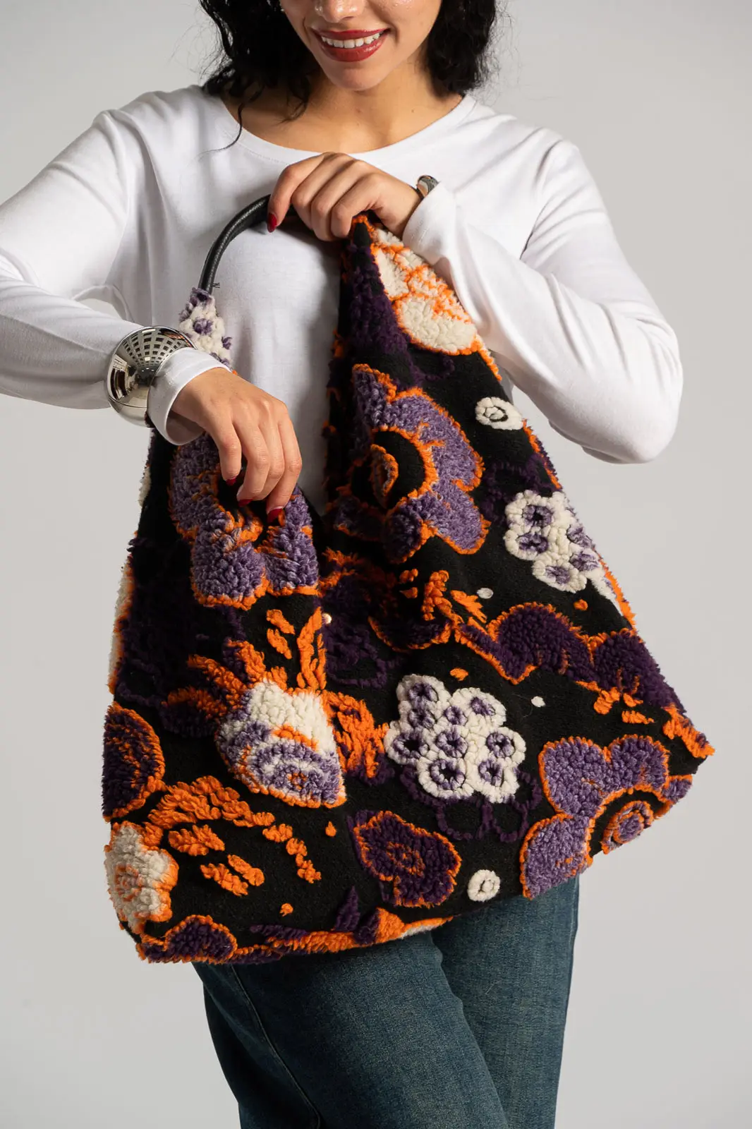 Boho bag with unique cut and print. It features a floral print with boucle fabric across the entire surface. It has a single compartment inside. It closes with a magnetic clasp and is not lined. It has a fixed leather strap and its total length is 86cm. Bag length: 60cm x 31cm. 35% wool, 65% polyester.