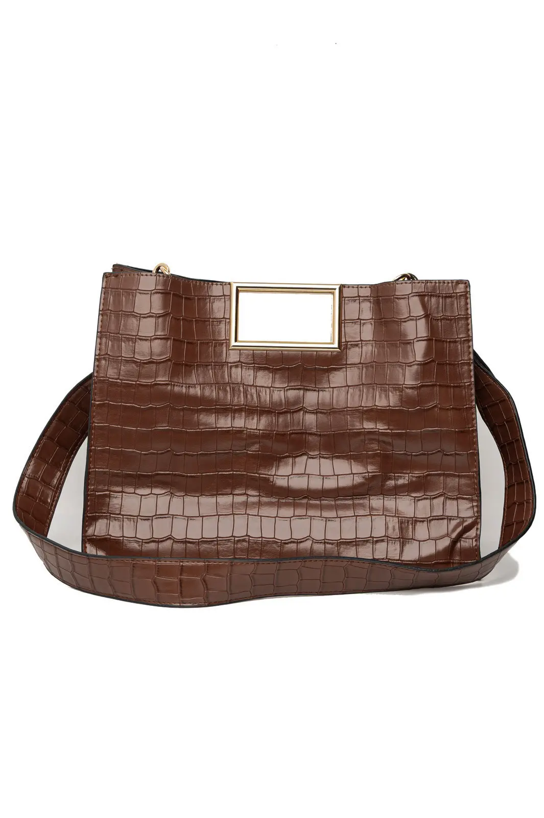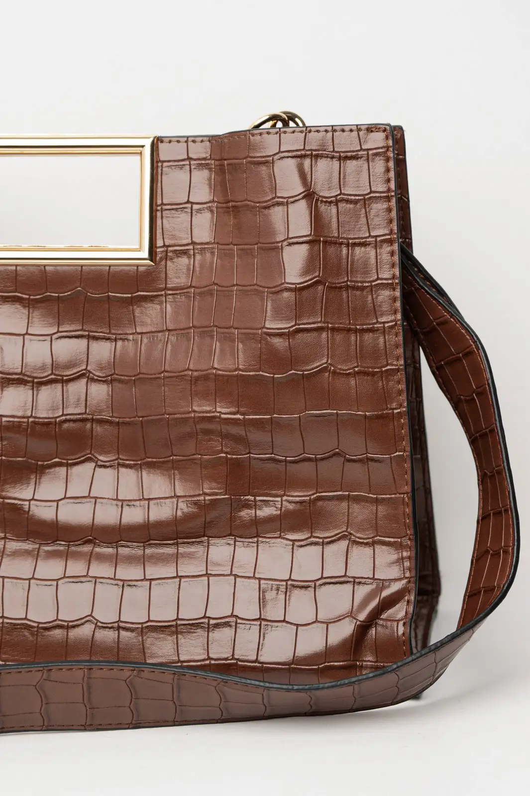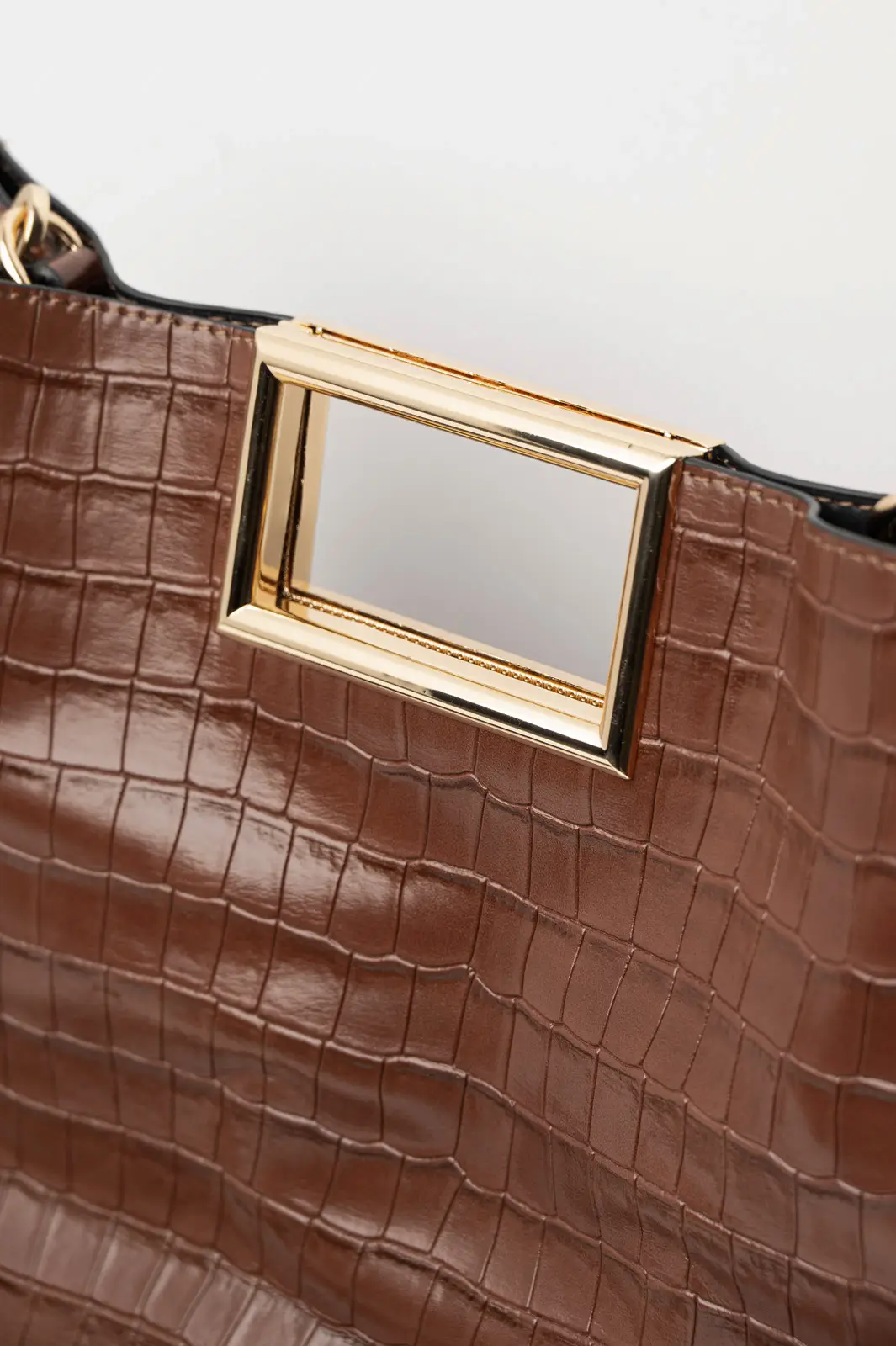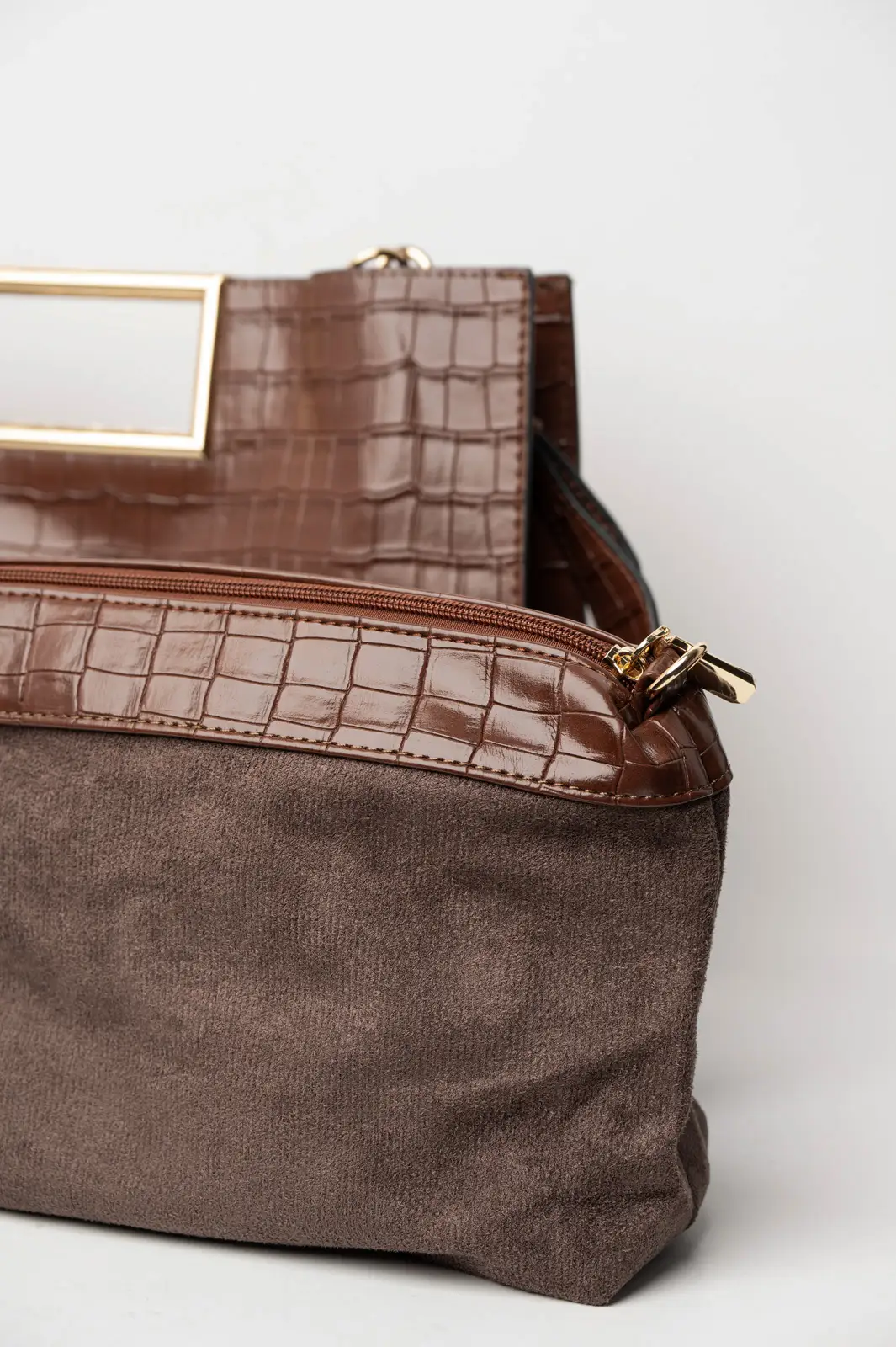 Bag made of high-quality leatherette with crocodile look and texture. It has a square handle with a magnet. It has its own fixed detachable strap. Inside, it has a single compartment. It has its own extra suede-textured bag and a leather strap. The interior is lined with a small pocket and closes with a zipper. The bag measures 33cm x 25cm x 12cm. Small bag 26cm x 20cm x 6cm.