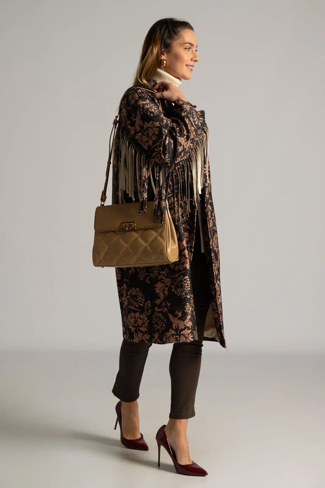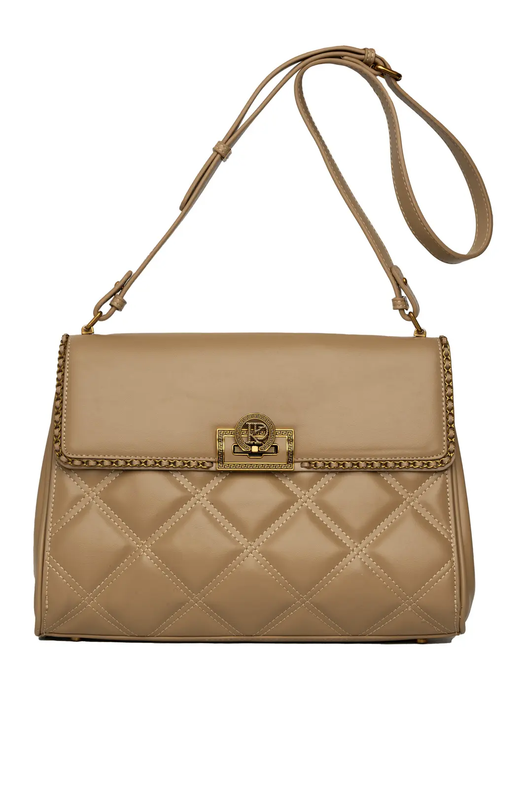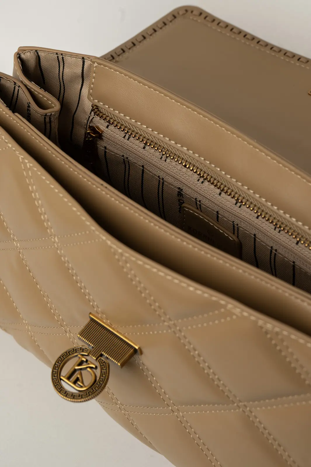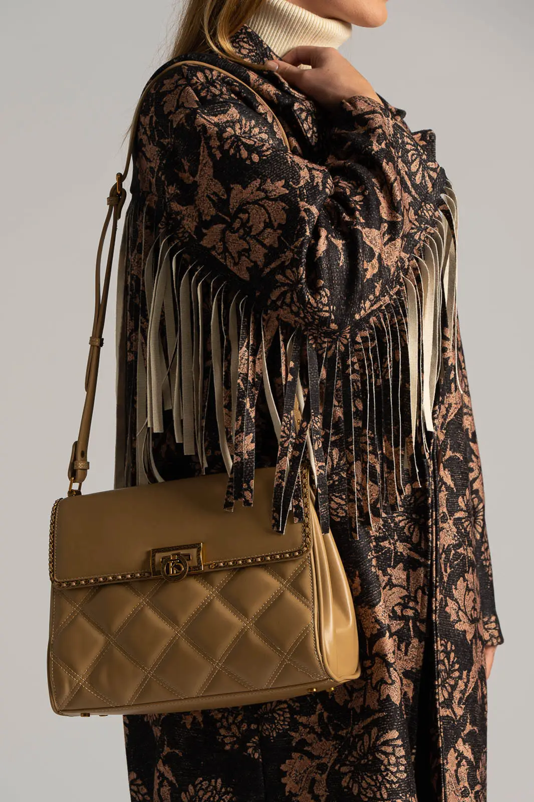 Bag made of high-quality leatherette. It is crossbody. It closes with a lid decorated around the edge with a thin chain and a clutch with a metal element. Inside it has 2 compartments and is lined. It has two straps so it can be worn crossbody or over the shoulder. One strap has a minimum length of 100 cm and a maximum length of 113 cm. The second strap has a fixed length of 69 cm. Bag size: 31cm x 24cm x 8cm.