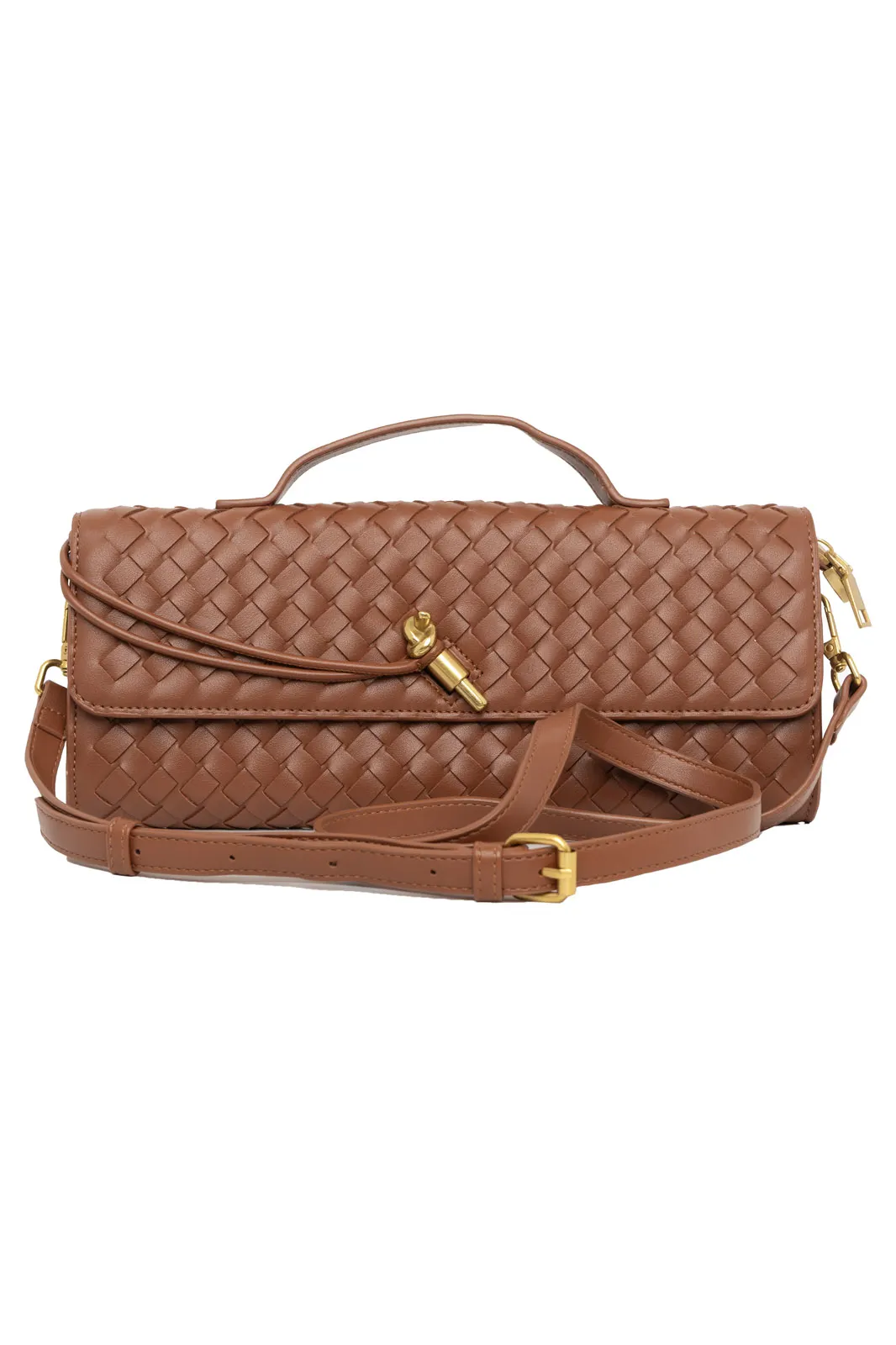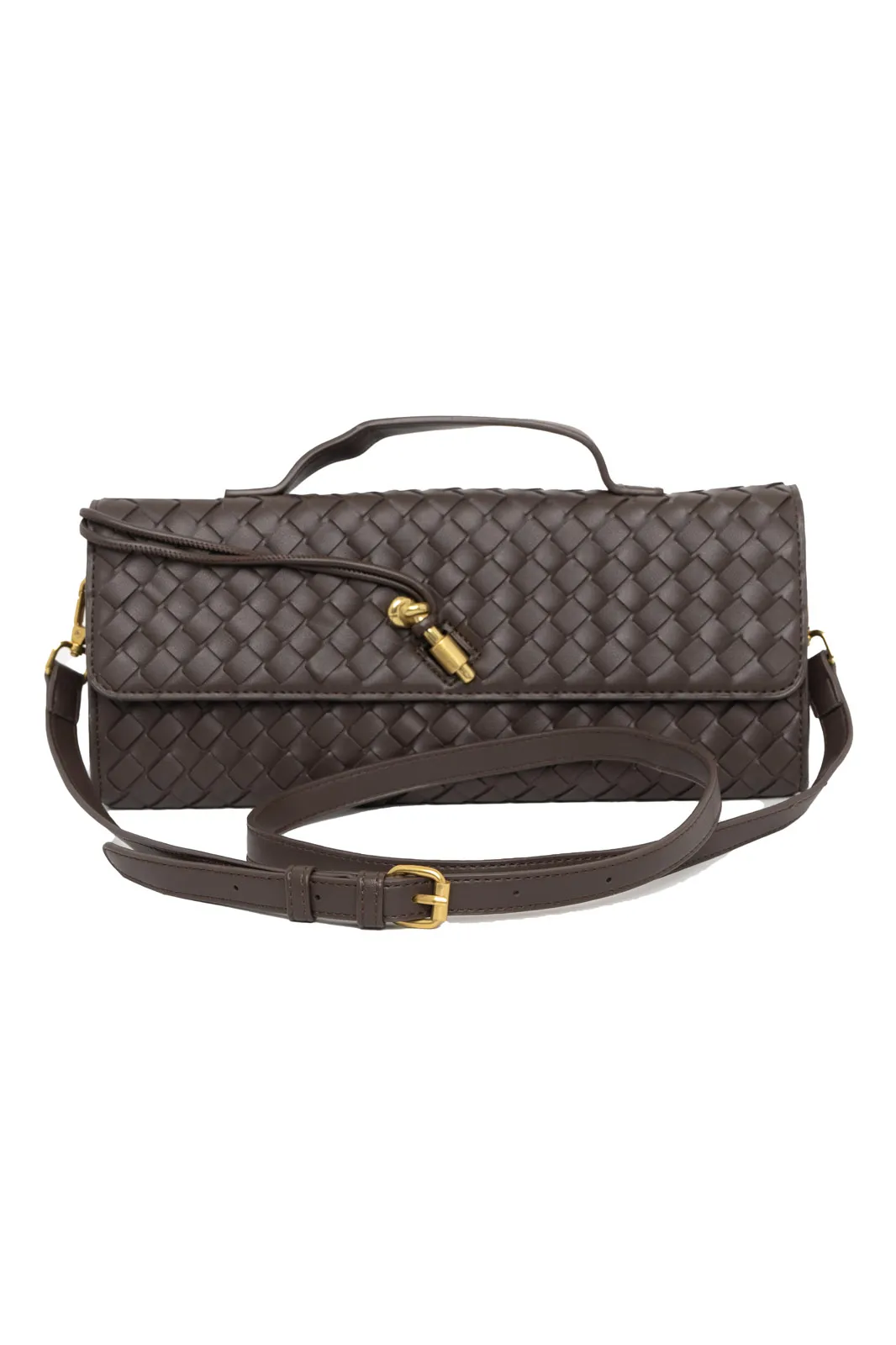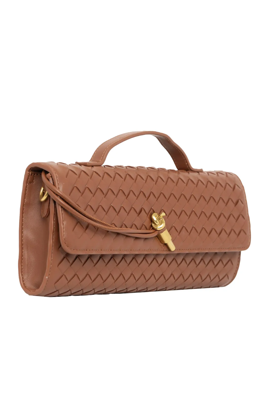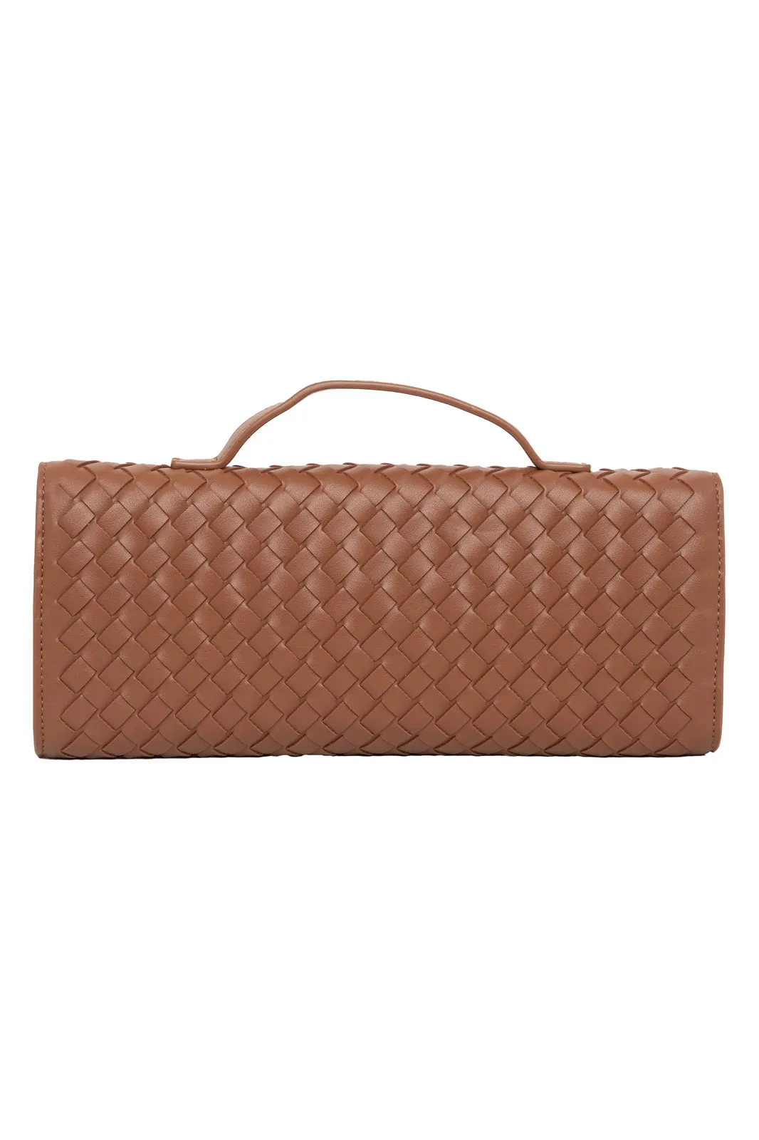 Τσάντα από εξαιρετικής ποιότητας δερματίνη. Είναι τύπου φάκελος και σε όλη την επιφάνεια έχει πλεκτή όψη. Εσωτερικά έχει τσέπες και είναι φοδραρισμένη. Κλείνει με κούμπωμα και φερμουάρ. Έχει σταθερό χερούλι και λουρί αποσπώμενο. Το λουρί έχει μέγιστο μήκος 119cm και ελάχιστο 106cm. Μέγεθος τσάντας. 30cmx13cm.