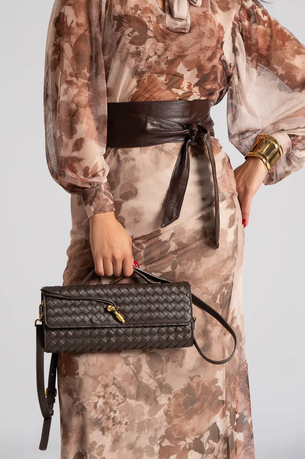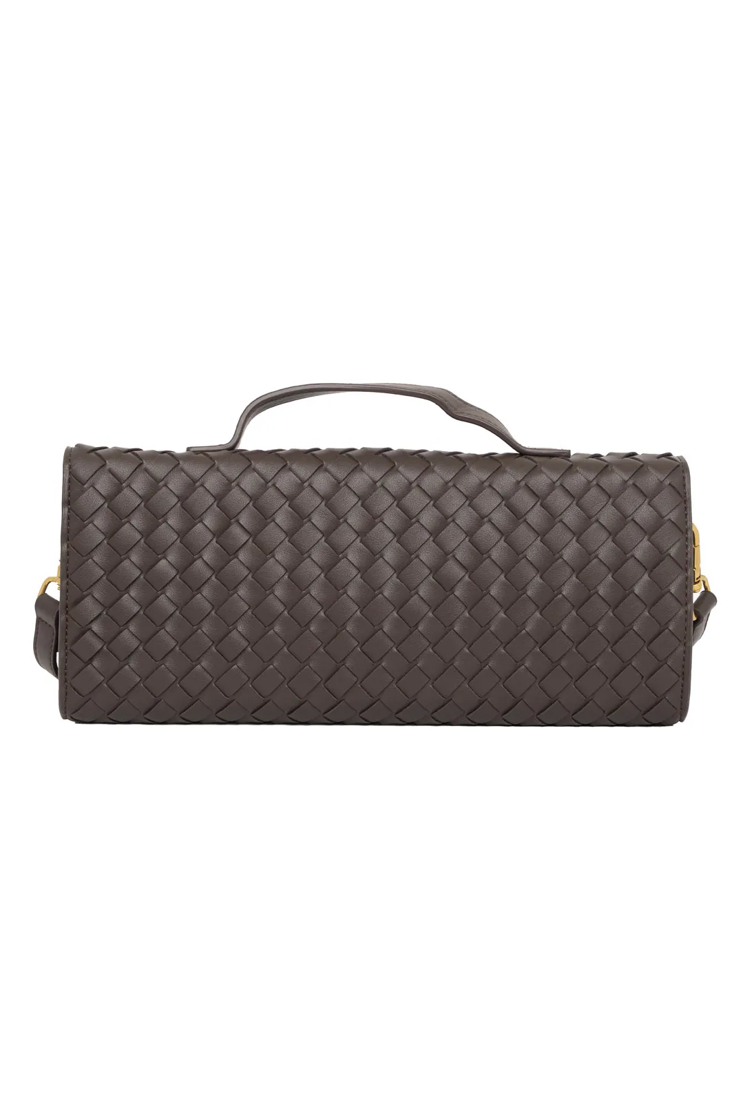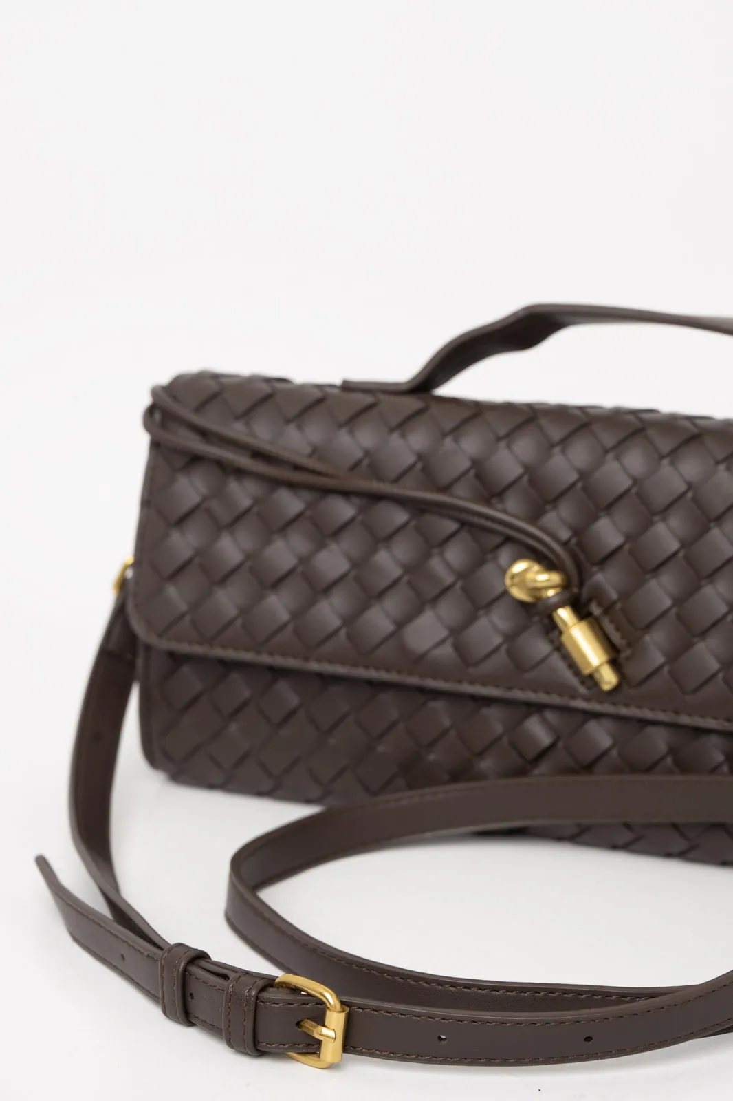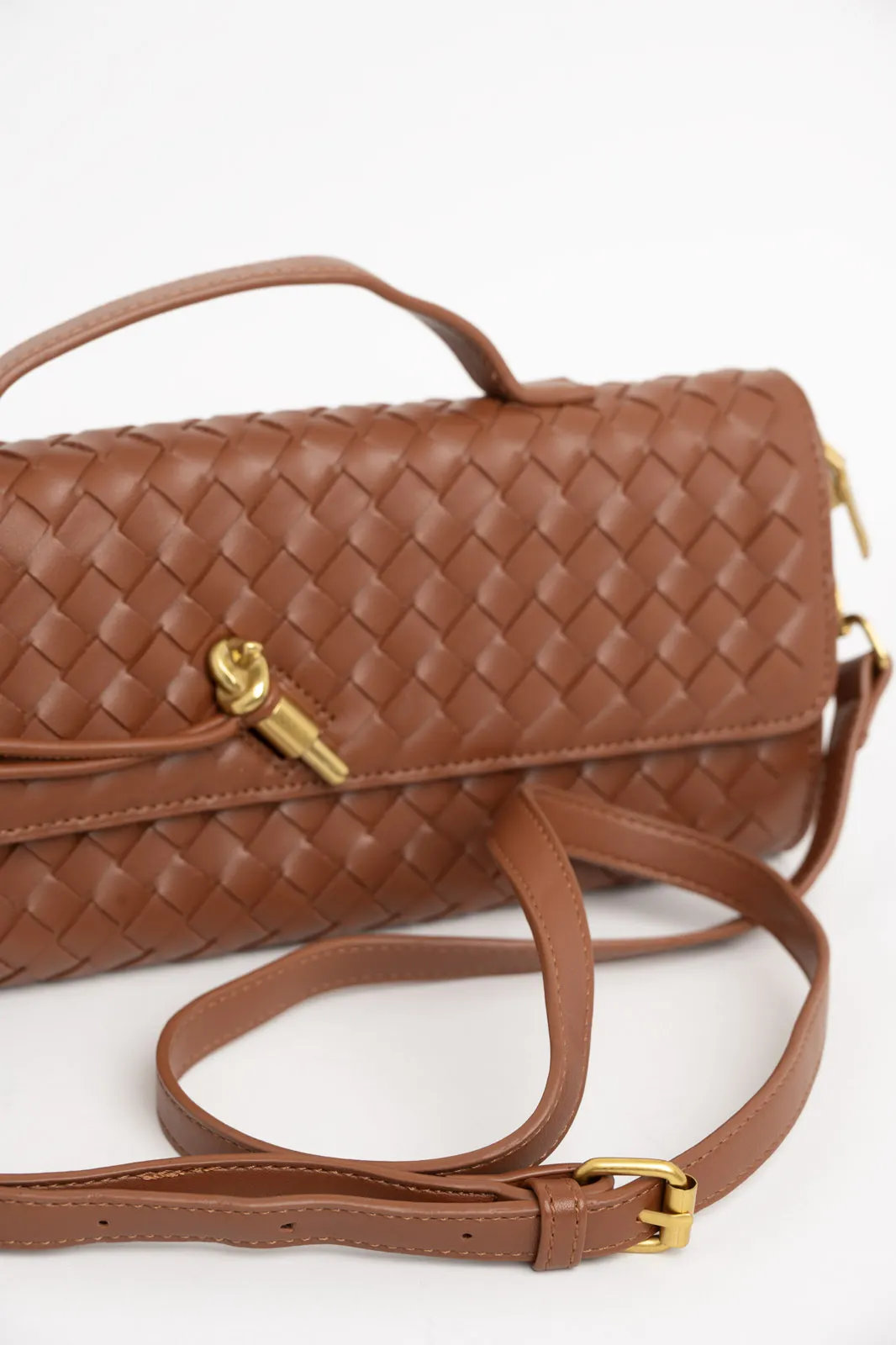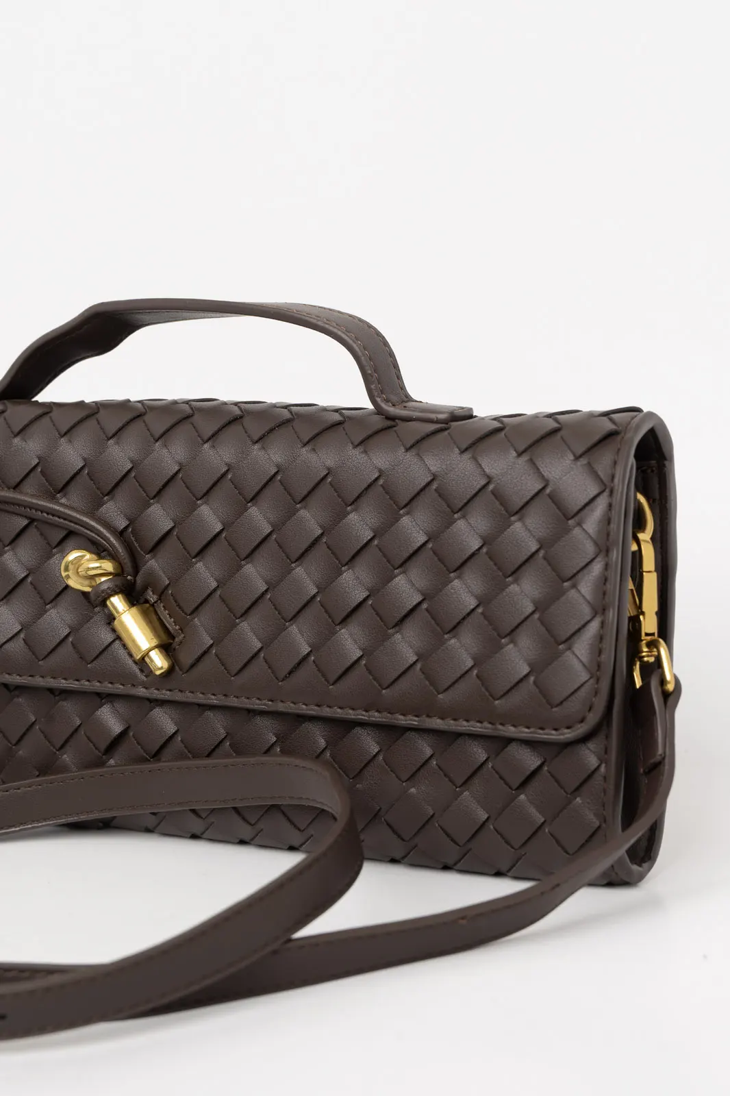 Τσάντα από εξαιρετικής ποιότητας δερματίνη. Είναι τύπου φάκελος και σε όλη την επιφάνεια έχει πλεκτή όψη. Εσωτερικά έχει τσέπες και είναι φοδραρισμένη. Κλείνει με κούμπωμα και φερμουάρ. Έχει σταθερό χερούλι και λουρί αποσπώμενο. Το λουρί έχει μέγιστο μήκος 119cm και ελάχιστο 106cm. Μέγεθος τσάντας. 30cmx13cm.