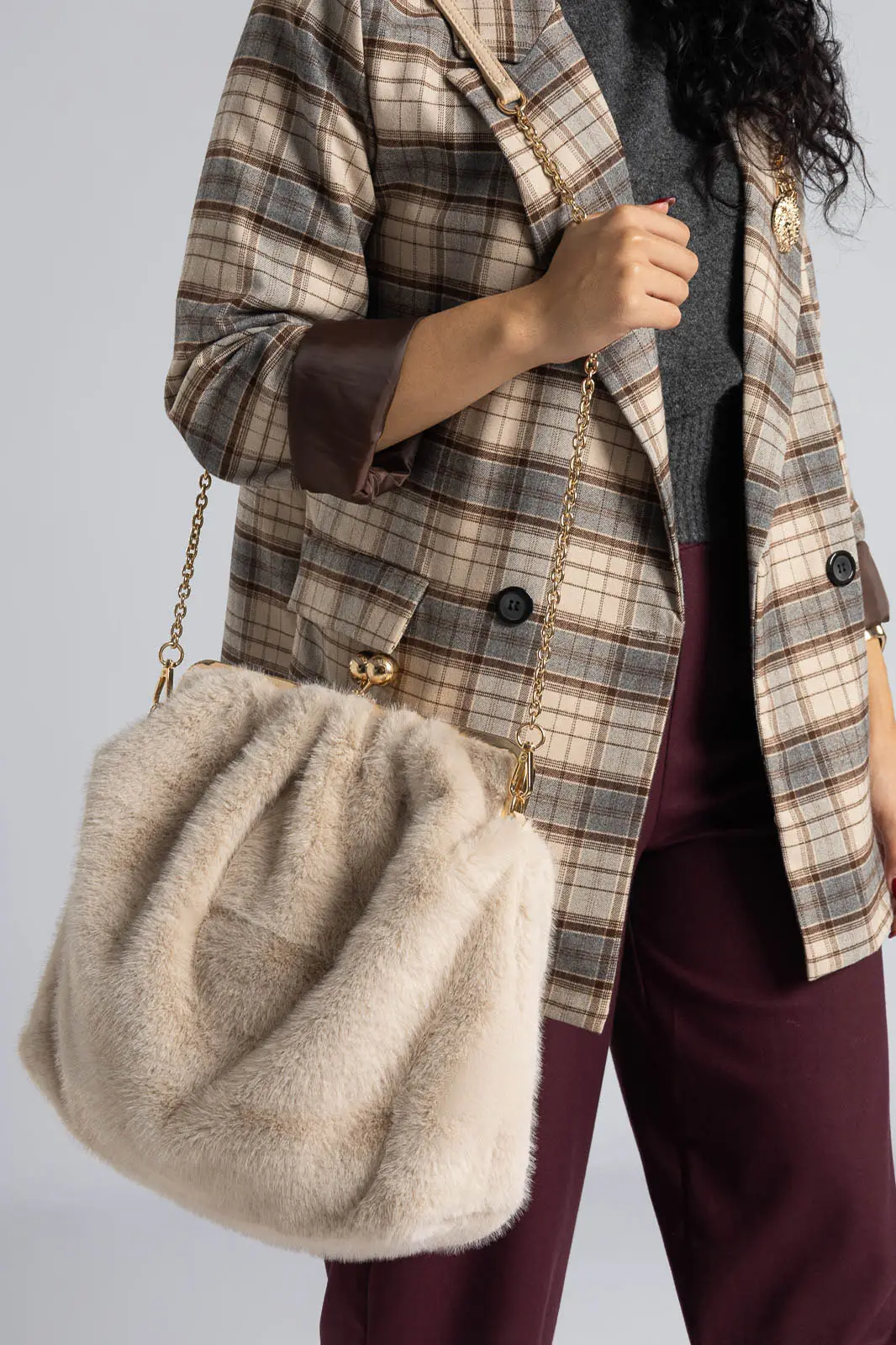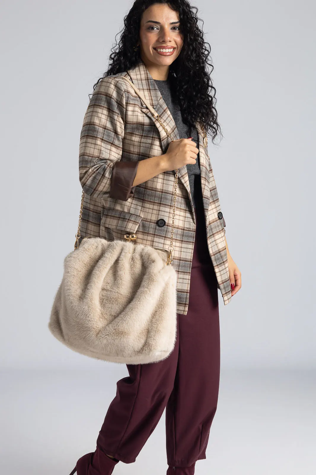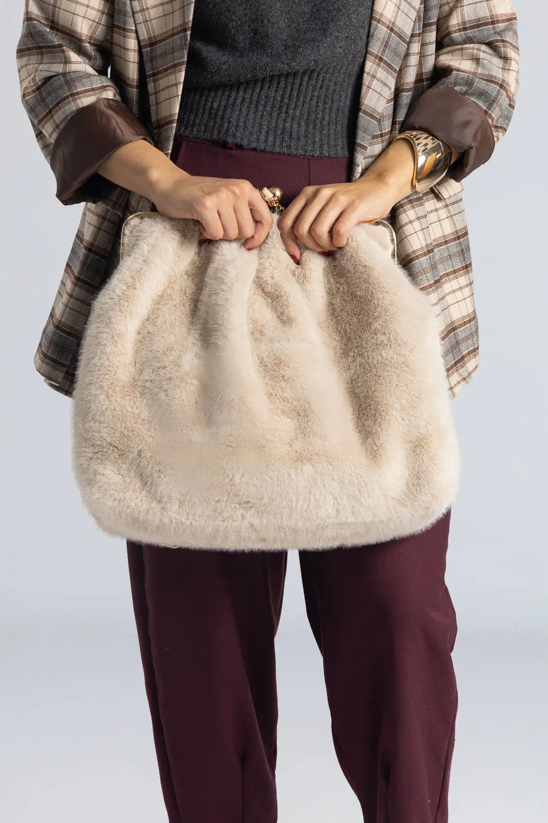 Bag made of high-quality synthetic fur. Closes with a frame. Lined interior. It has a detachable leather shoulder strap with a length of 63cm and a detachable chain with a length of 120cm. Bag size: 41cm x 47cm x 12cm.