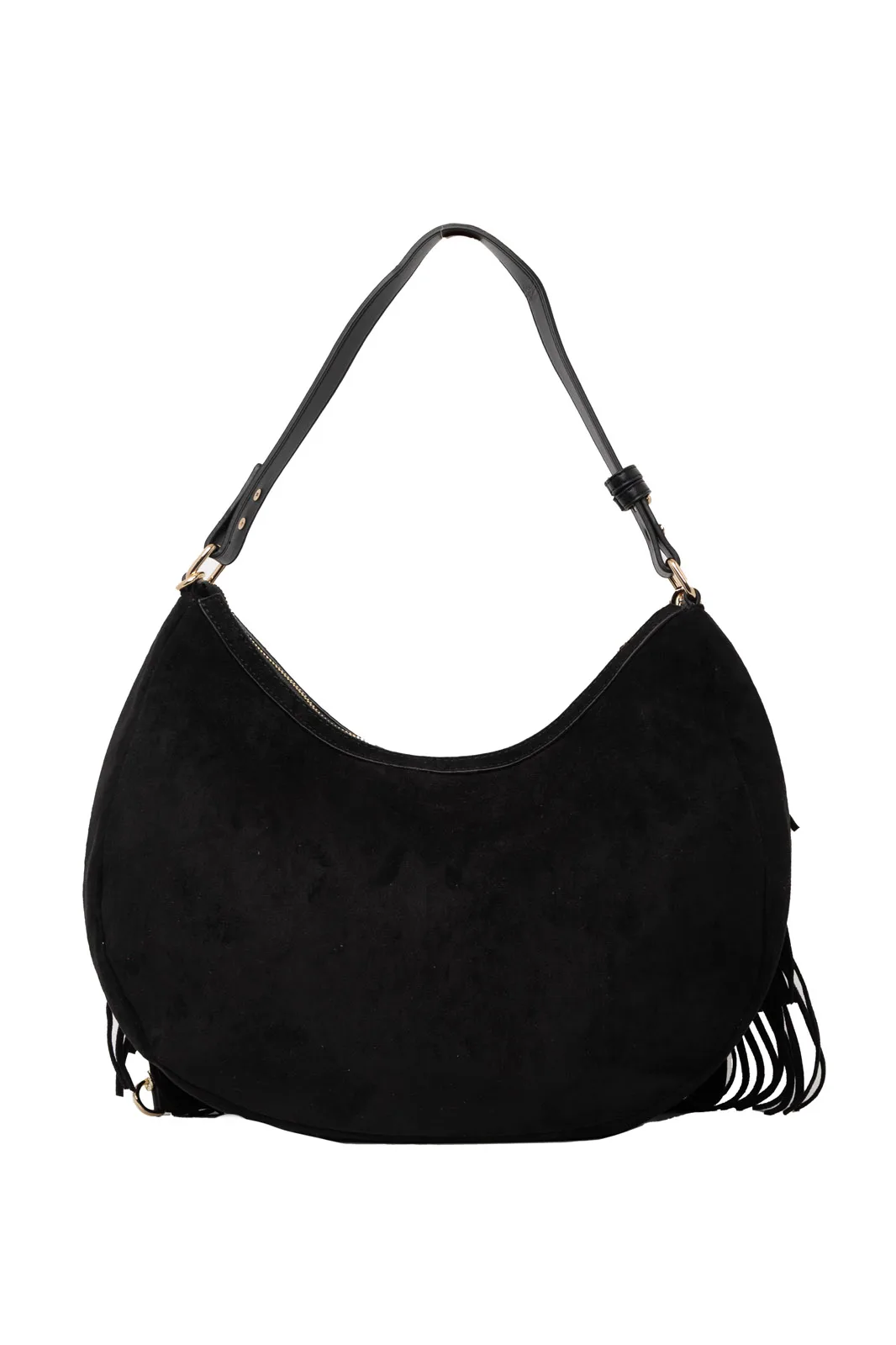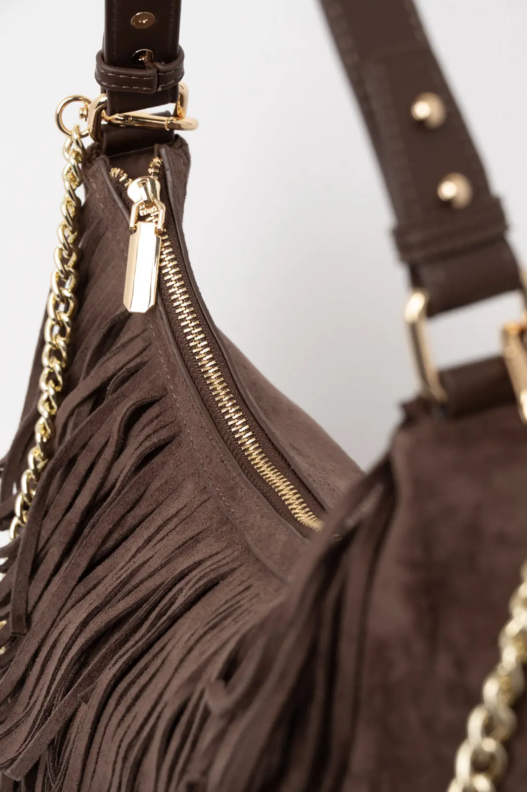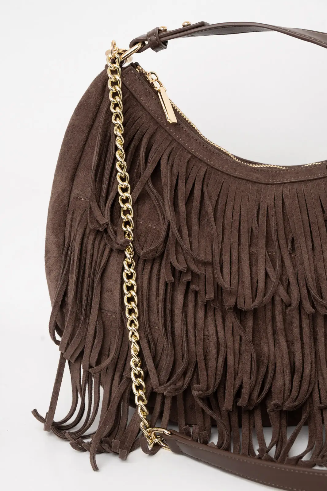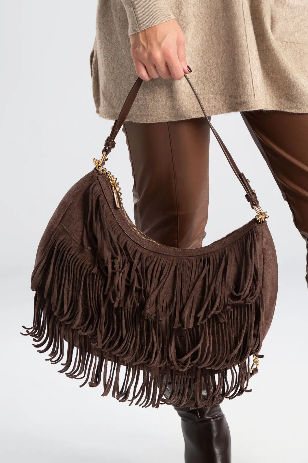 Τσάντα σε μισοφέγγαρο σχήμα. Σε όλη την επιφάνεια έχει σουέτ υφή. Στο μπροστινό μέρος έχει διακοσμητικά κρόσια. Έχει σταθερό χερούλι και λουρί αποσπώμενο με όψη αλυσίδας. Εσωτερικά είναι φοδραρισμένο και έχει μικρές τσέπες. Το σταθερό χερούλι έχει μήκος 50cm. Η αλυσίδα έχει σταθερό μήκος 109cm. Μέγεθος τσάντας 44cm x 25cm.