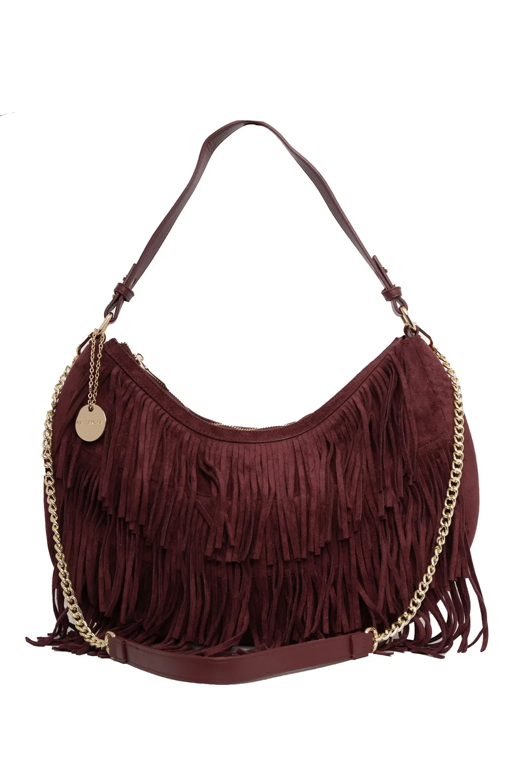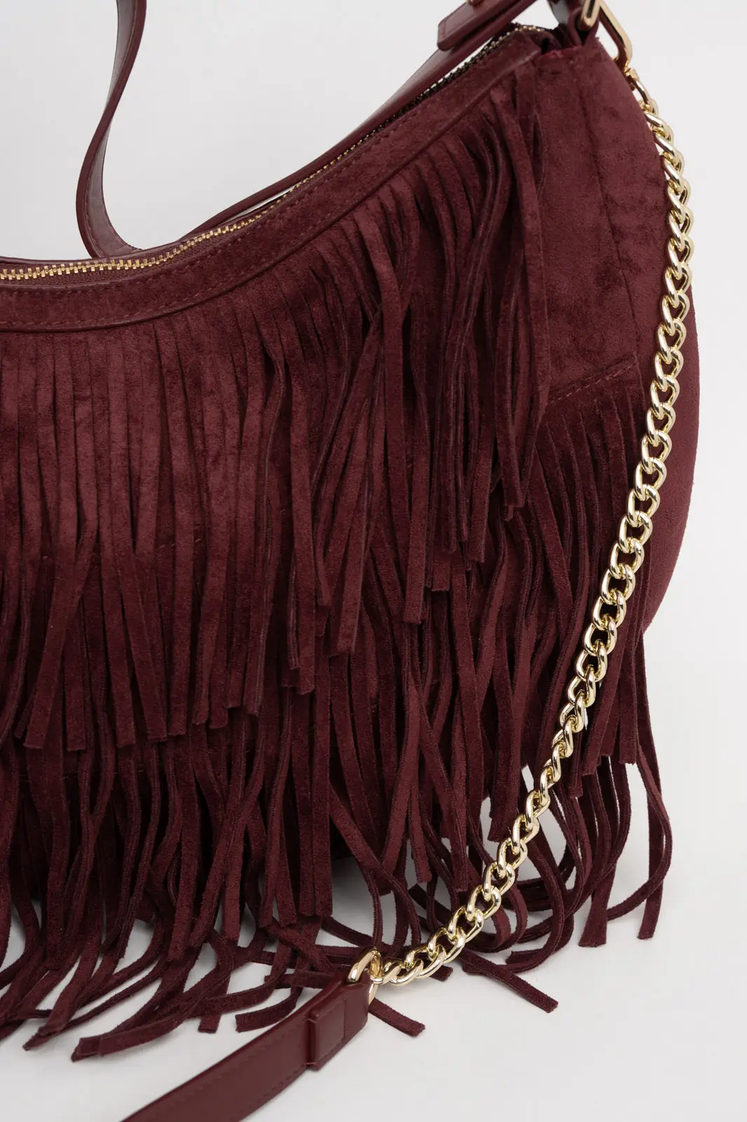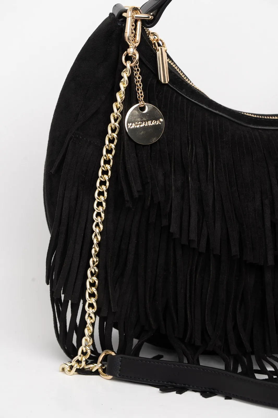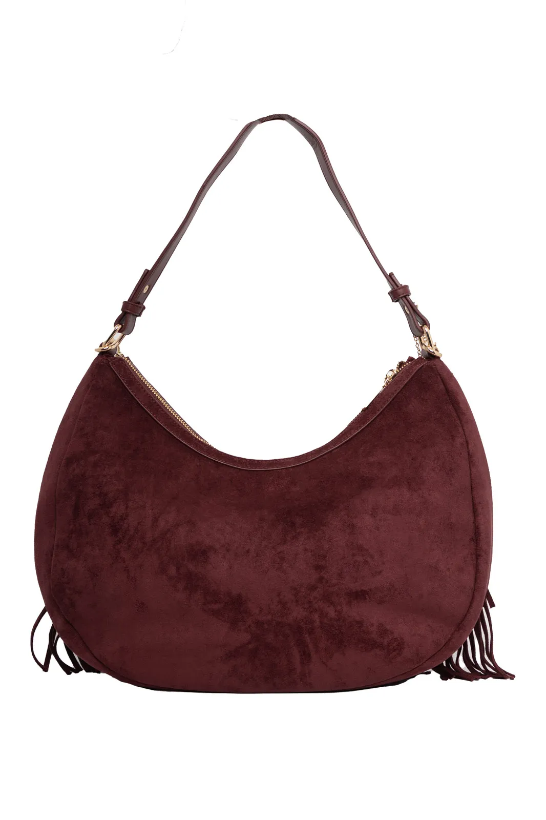 Τσάντα σε μισοφέγγαρο σχήμα. Σε όλη την επιφάνεια έχει σουέτ υφή. Στο μπροστινό μέρος έχει διακοσμητικά κρόσια. Έχει σταθερό χερούλι και λουρί αποσπώμενο με όψη αλυσίδας. Εσωτερικά είναι φοδραρισμένο και έχει μικρές τσέπες. Το σταθερό χερούλι έχει μήκος 50cm. Η αλυσίδα έχει σταθερό μήκος 109cm. Μέγεθος τσάντας 44cm x 25cm.