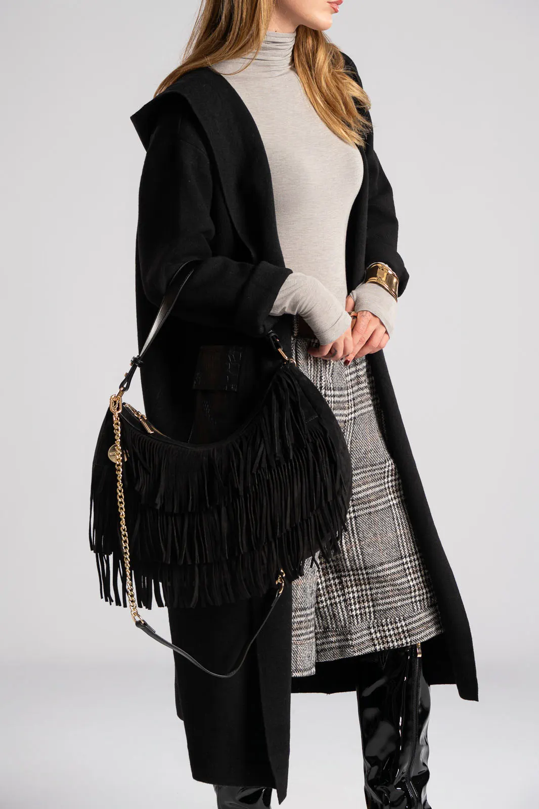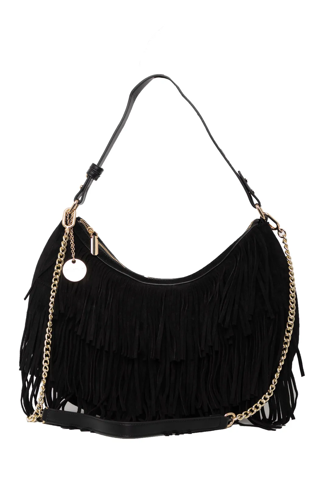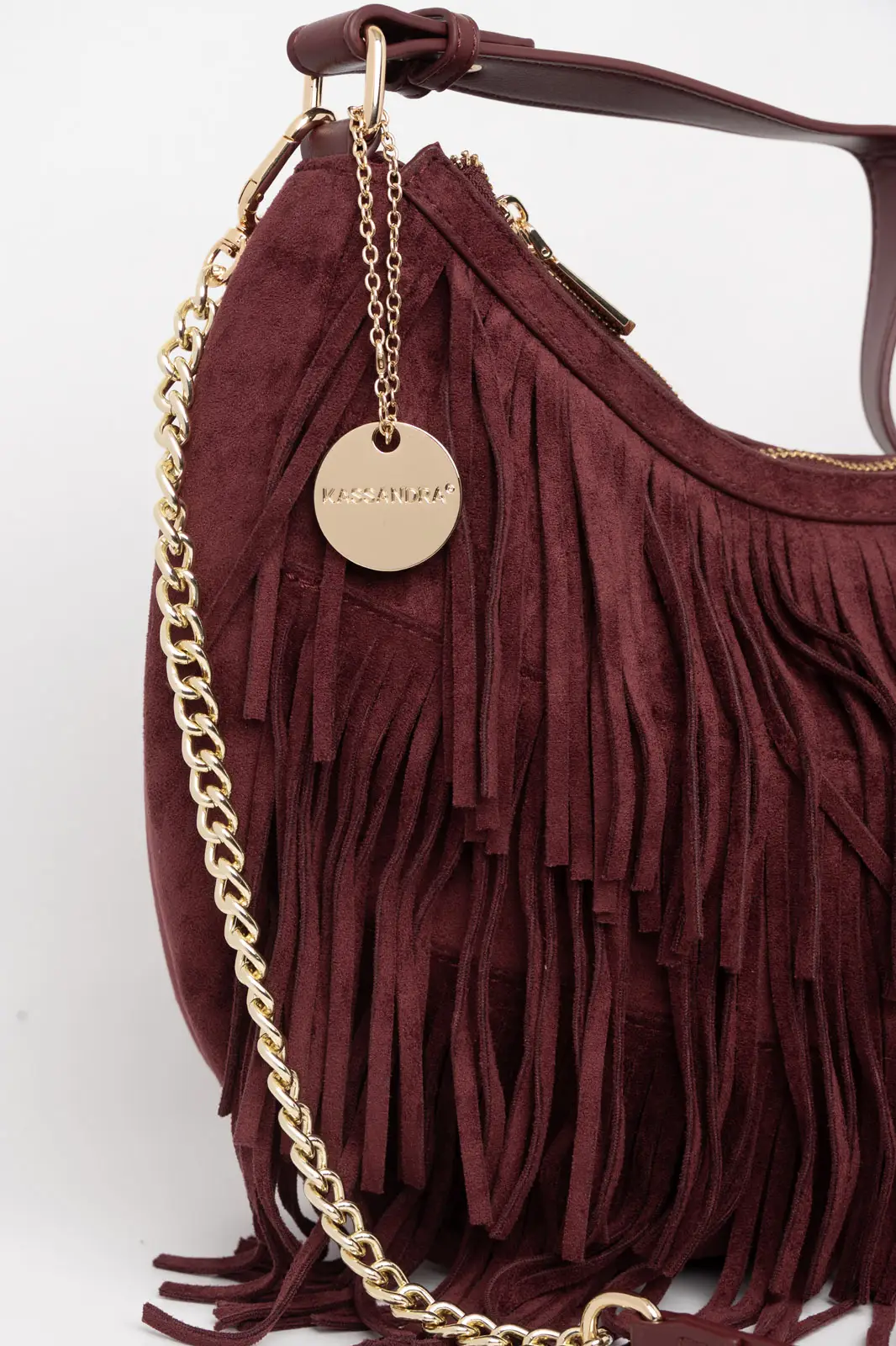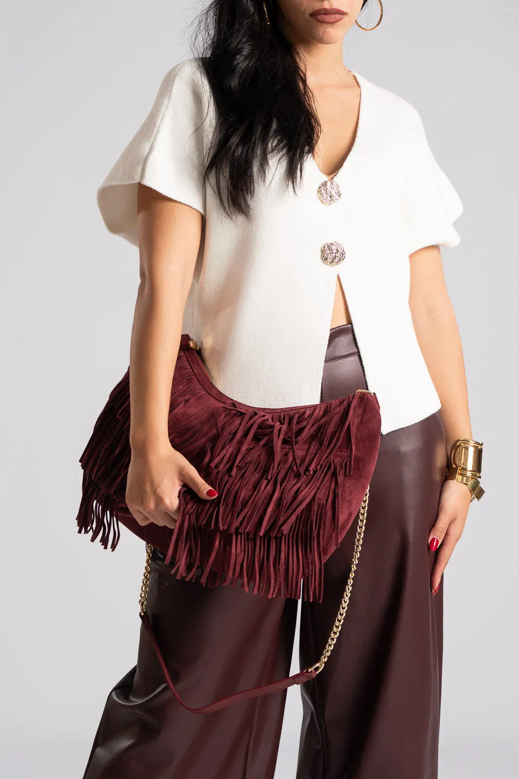 Τσάντα σε μισοφέγγαρο σχήμα. Σε όλη την επιφάνεια έχει σουέτ υφή. Στο μπροστινό μέρος έχει διακοσμητικά κρόσια. Έχει σταθερό χερούλι και λουρί αποσπώμενο με όψη αλυσίδας. Εσωτερικά είναι φοδραρισμένο και έχει μικρές τσέπες. Το σταθερό χερούλι έχει μήκος 50cm. Η αλυσίδα έχει σταθερό μήκος 109cm. Μέγεθος τσάντας 44cm x 25cm.