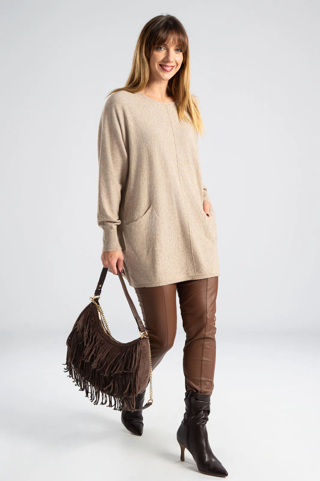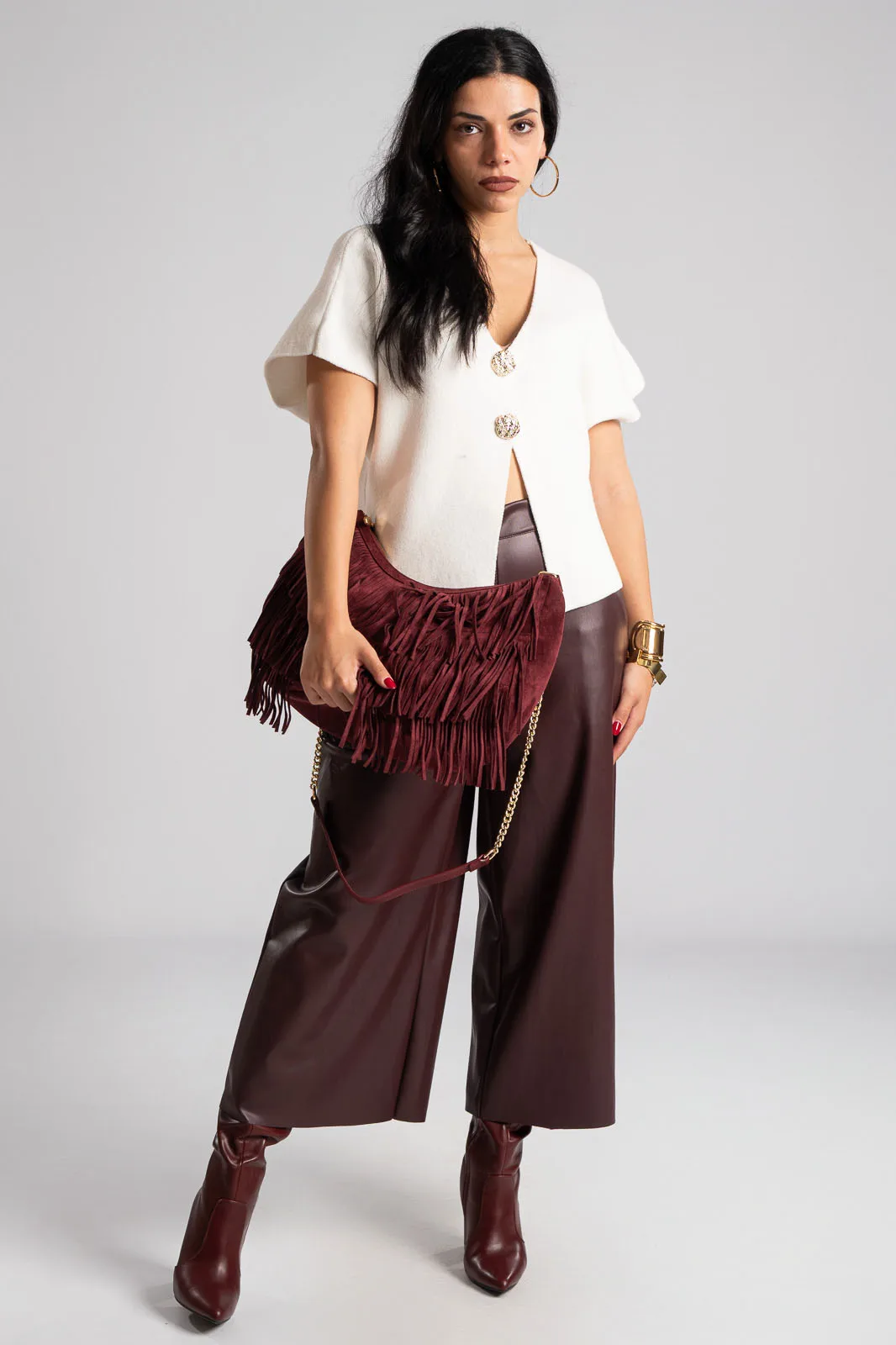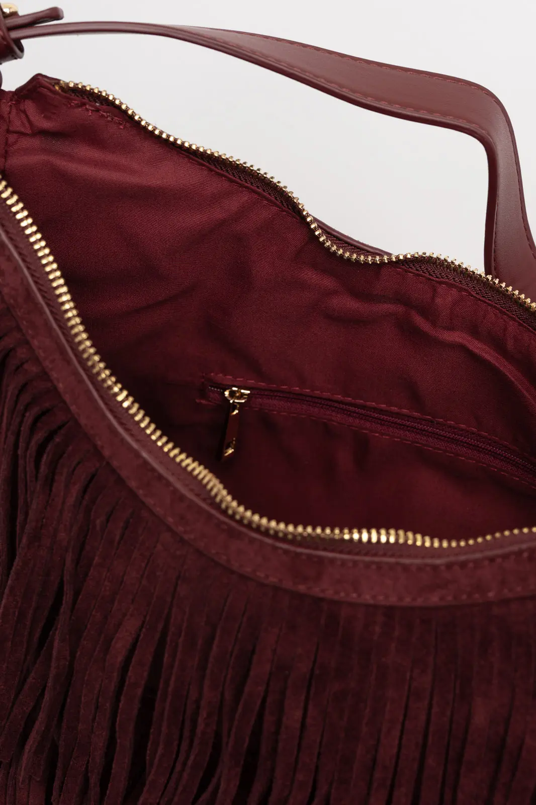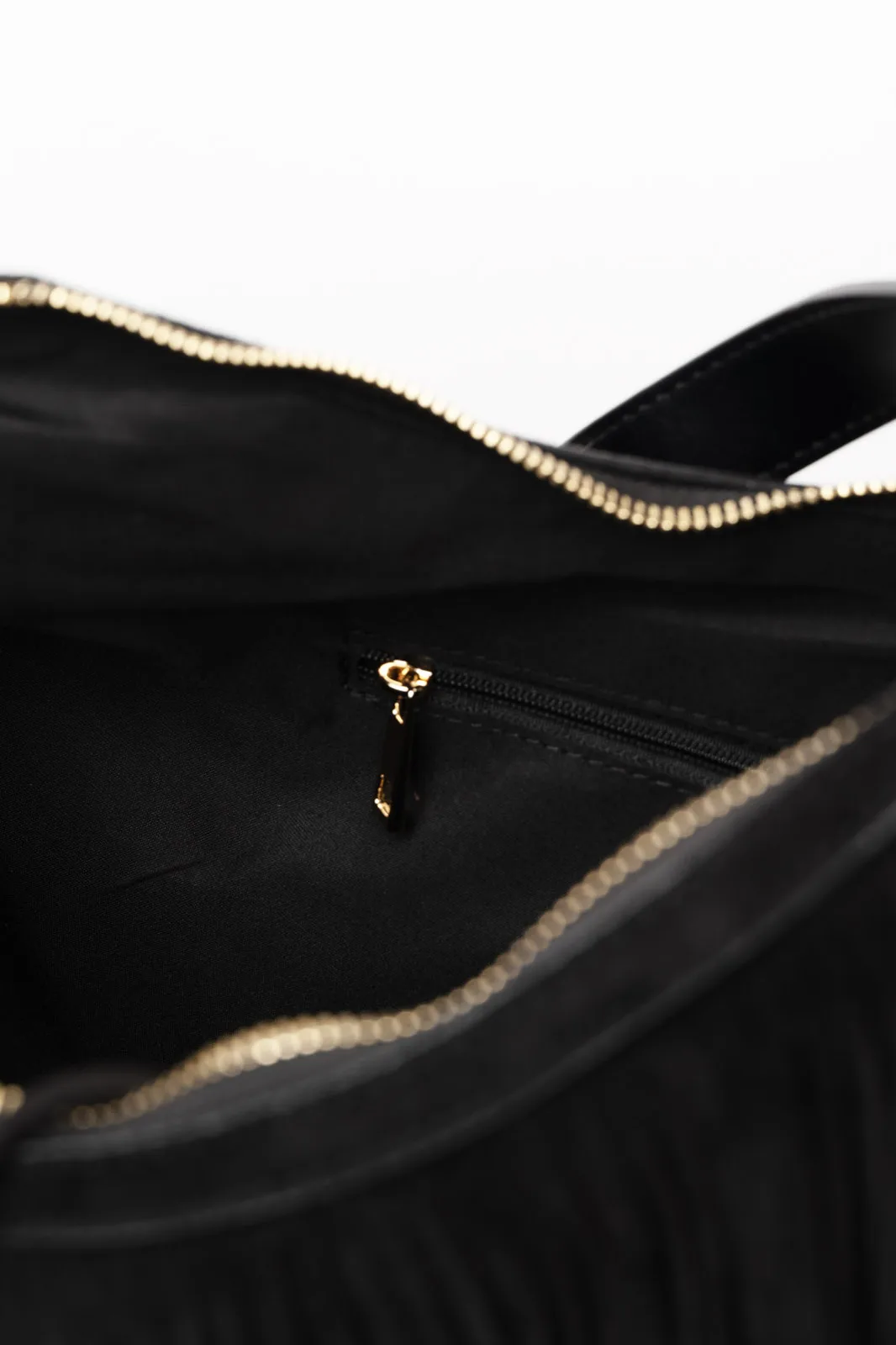 Τσάντα σε μισοφέγγαρο σχήμα. Σε όλη την επιφάνεια έχει σουέτ υφή. Στο μπροστινό μέρος έχει διακοσμητικά κρόσια. Έχει σταθερό χερούλι και λουρί αποσπώμενο με όψη αλυσίδας. Εσωτερικά είναι φοδραρισμένο και έχει μικρές τσέπες. Το σταθερό χερούλι έχει μήκος 50cm. Η αλυσίδα έχει σταθερό μήκος 109cm. Μέγεθος τσάντας 44cm x 25cm.