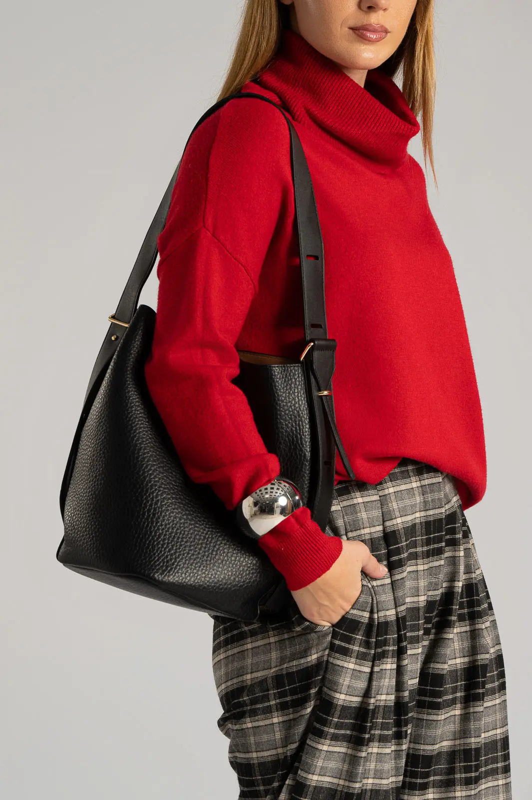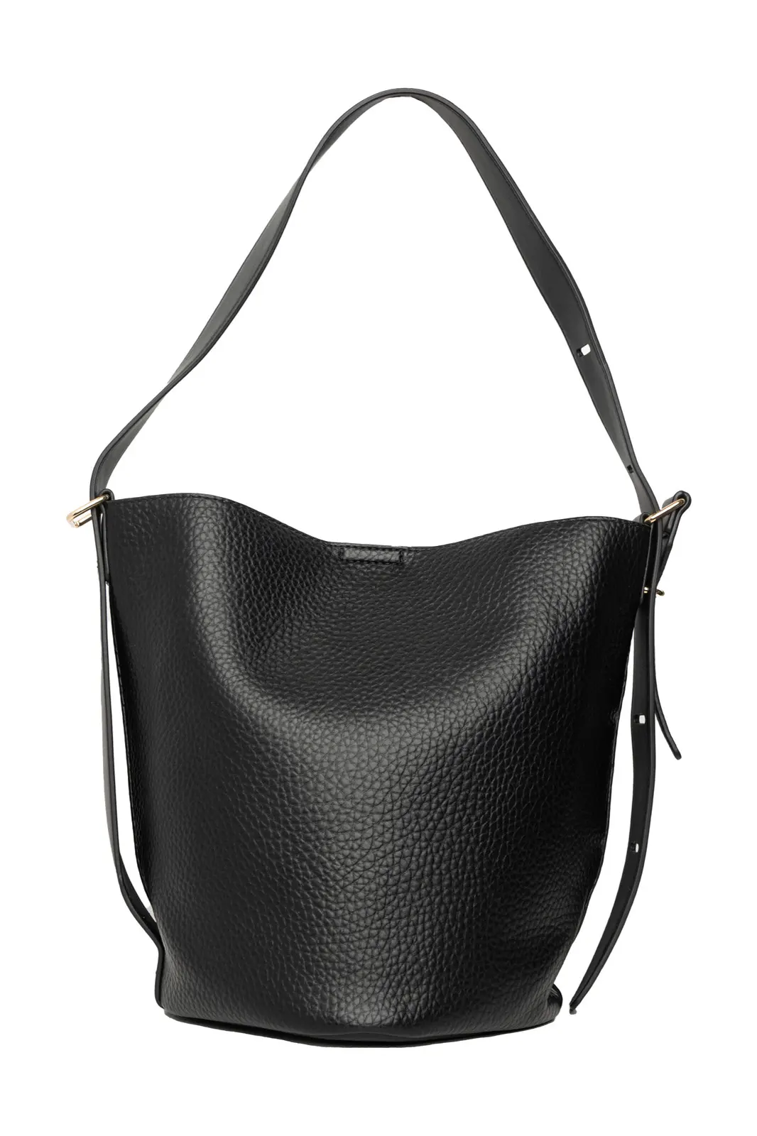 Τσάντα από εξαιρετικής ποιότητας δερματίνη. Διαθέτει λουρί το οποίο μπορεί να αυξομειωθεί σαν ζώνη από τη μια μεριά με ελάχιστο μήκος 51cm και μέγιστο 83cm. Εσωτερικά δεν είναι φοδραρισμένη και κλείνει με clutch. Διαθέτει extra τσαντάκι το οποίο διαθέτει λουρί σταθερό πλεγμένο σε αλυσίδα με μήκος 120cm. Εσωτερικά είναι φοδραρισμένη, κλείνει με clutch και διαθέτει εσωτερικές θήκες. Μέγεθος τσάντας 30cmx35cmx22cm, μέγεθος μικρής 22cmx30cmx16cm.