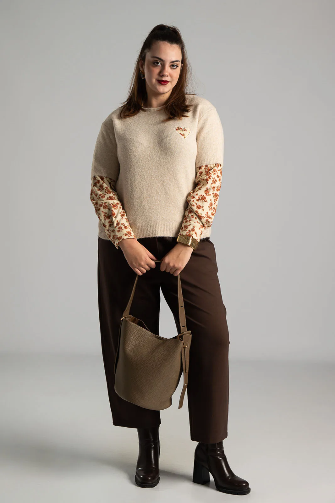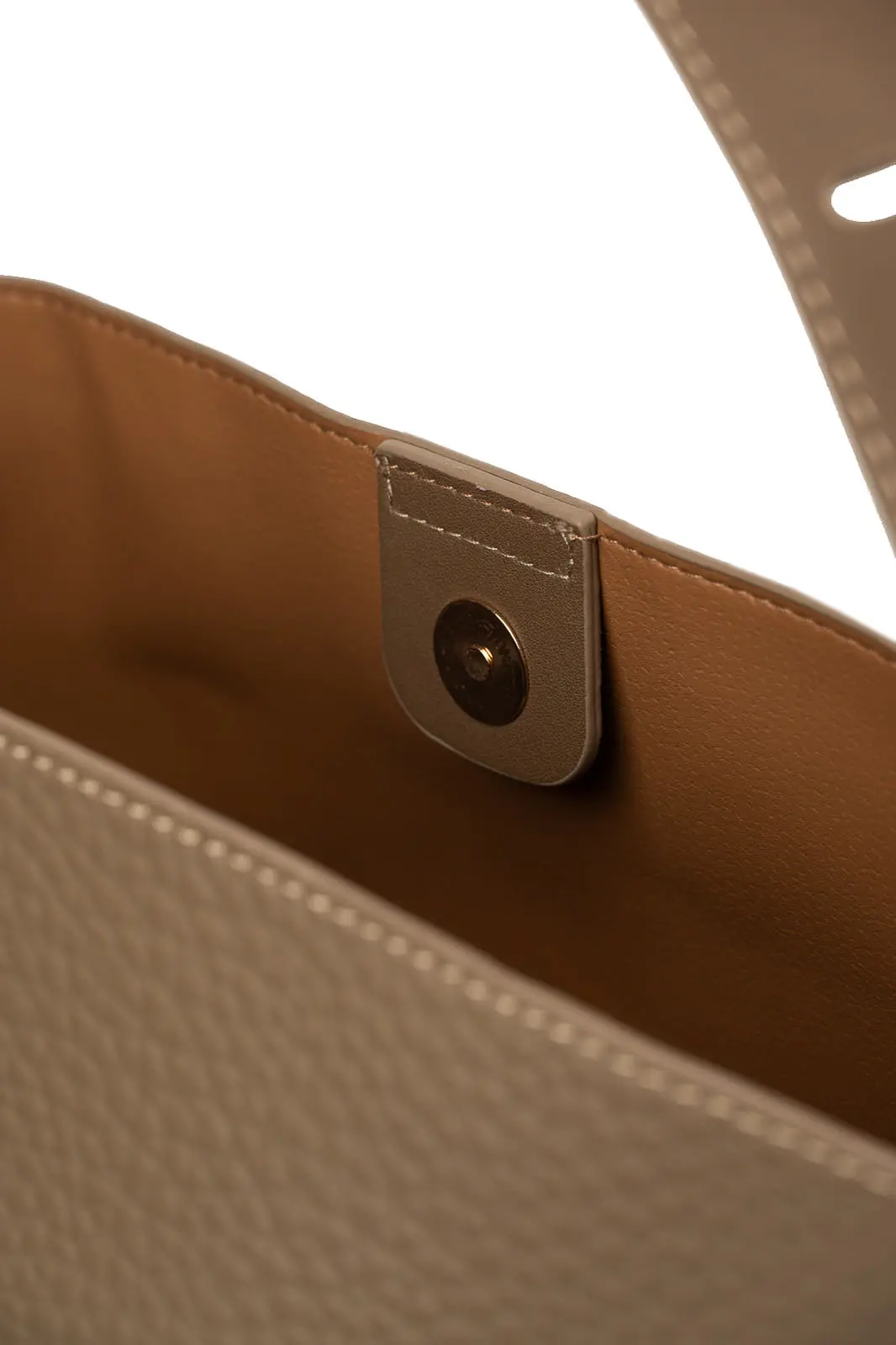 Bag made of high-quality leatherette. It has a strap that can be adjusted like a belt on one side, with a minimum length of 51 cm and a maximum length of 83 cm. The interior is not lined and closes with a clutch. It has an extra bag with a fixed strap woven into a chain with a length of 120cm. It is lined on the inside, closes with a clutch and has internal pockets. Bag size 30cmx35cmx22cm, small size 22cmx30cmx16cm.
