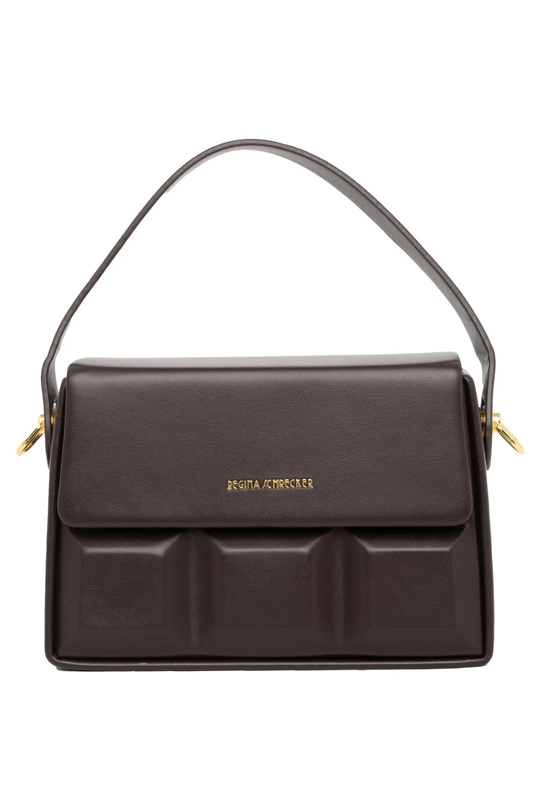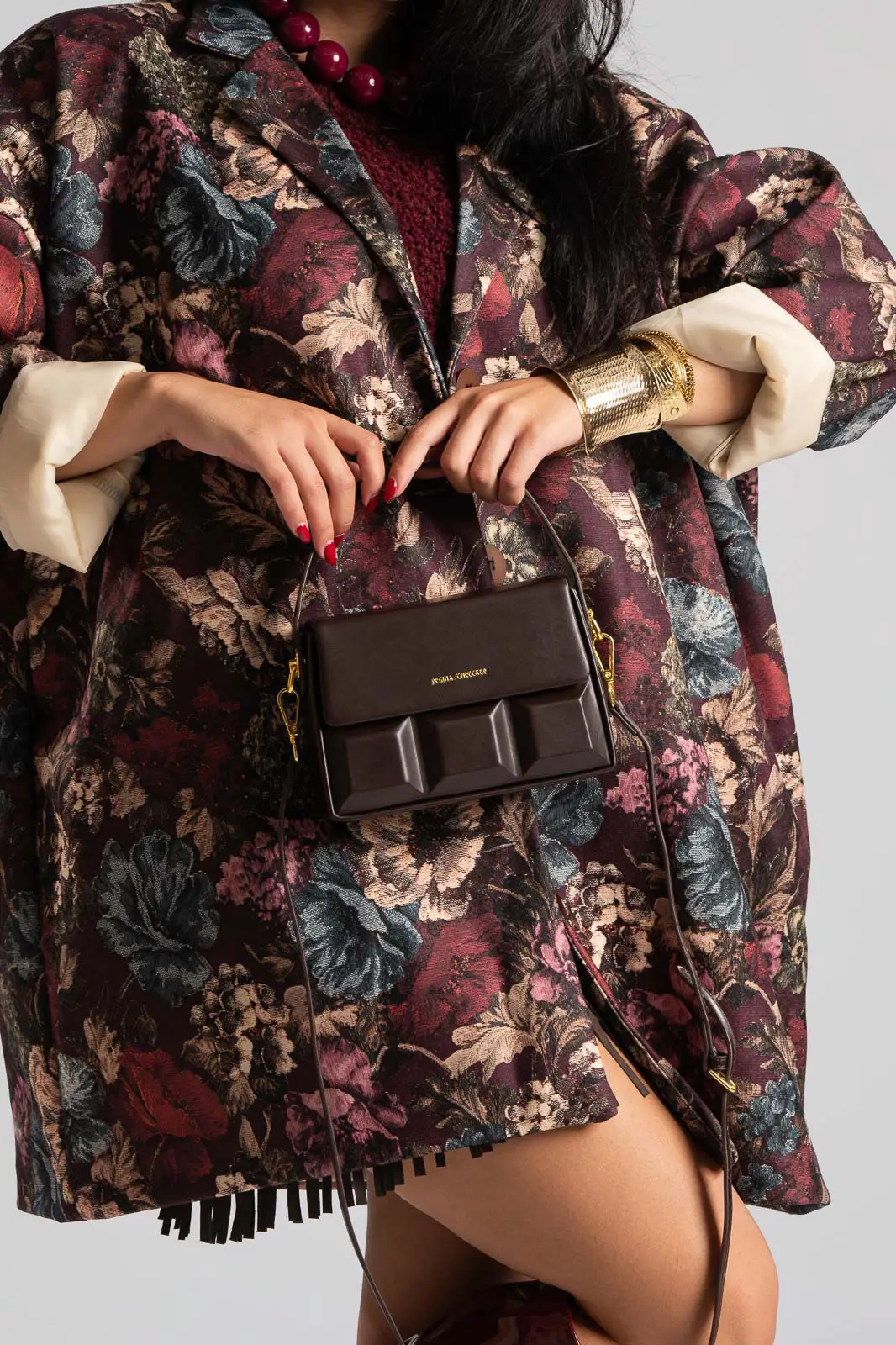 Τσάντα απο εξαιρετικής ποιότητας δερματίνη. Στο μπροστινό μέρος έχει όψη από κομμάτια σοκολάτας. Κλείνει με καπάκι και clutch. Εσωτερικά είναι φοδραρισμένη. Έχει αποσμώμενο λουρί με μέγιστο μήκος 112cm και ελάχιστο 98cm. Μέγεθος τσάντας 19cmx13cm.