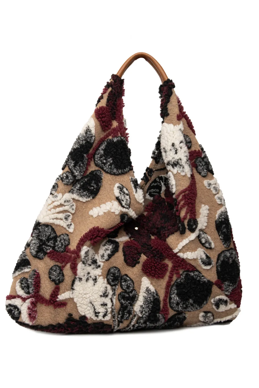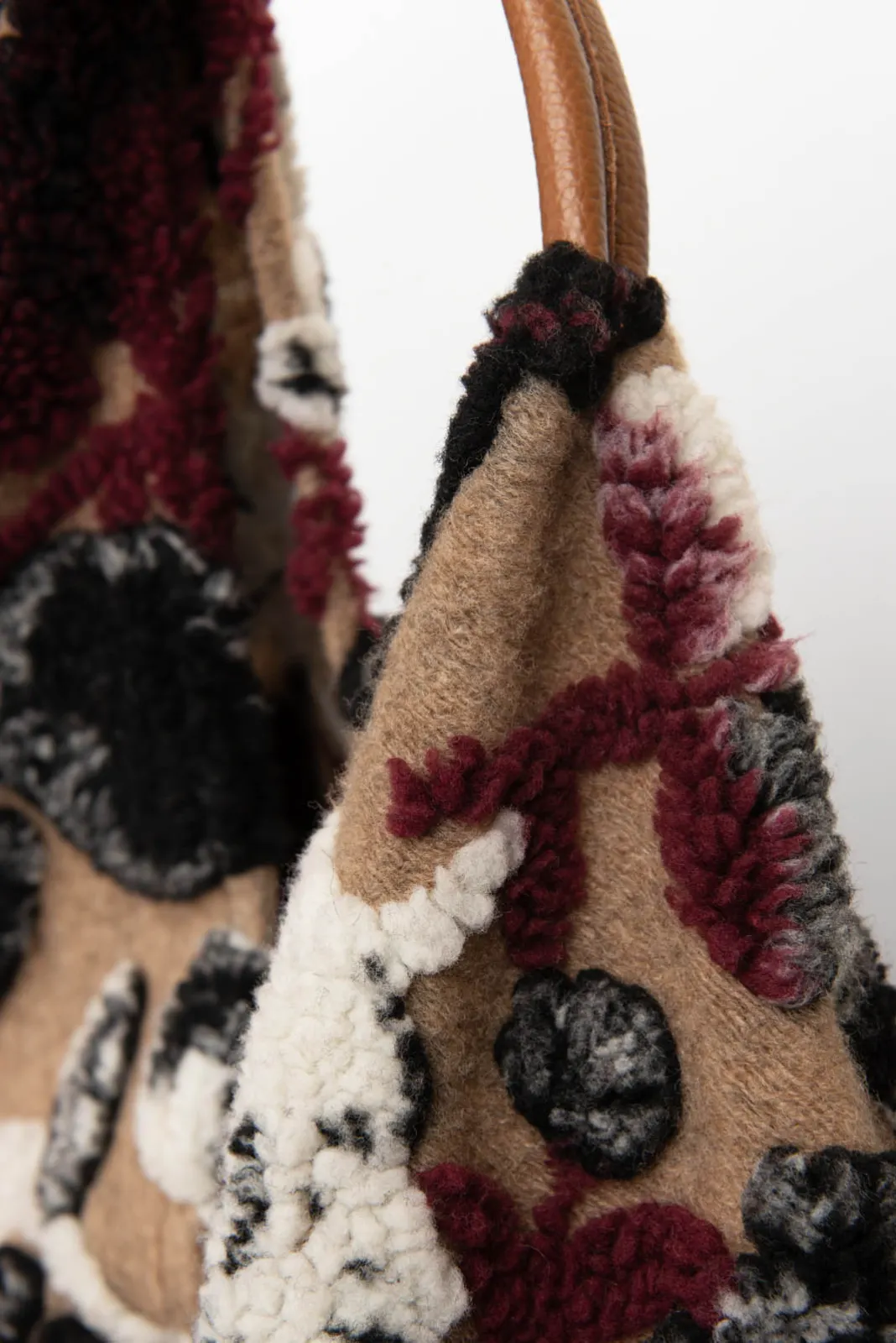 Shoulder bag. It has a leatherette handle. It closes with a clutch. Inside, it has a single compartment. The entire surface has 3D embossed flowers. Floral pattern across the entire surface. The handle is fixed and 60 cm long. Bag size: 58 cm x 28 cm. Composition: 45% polyester, 35% acrylic, 20% wool.